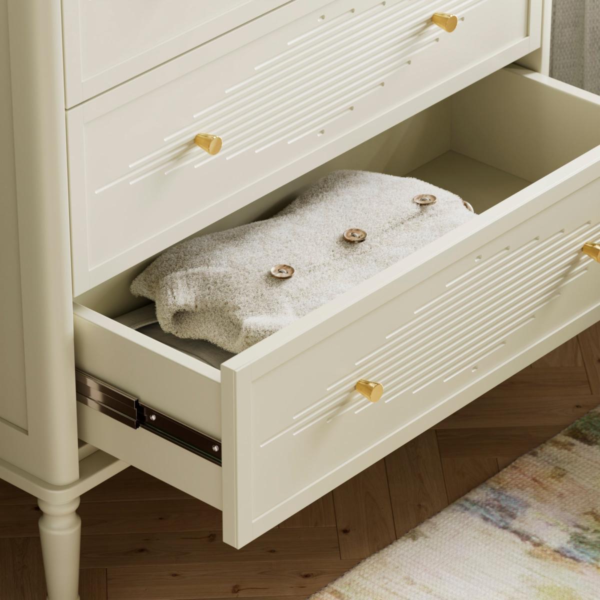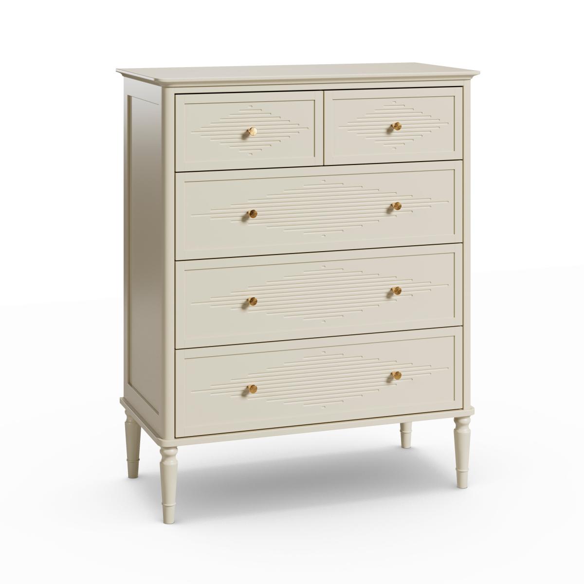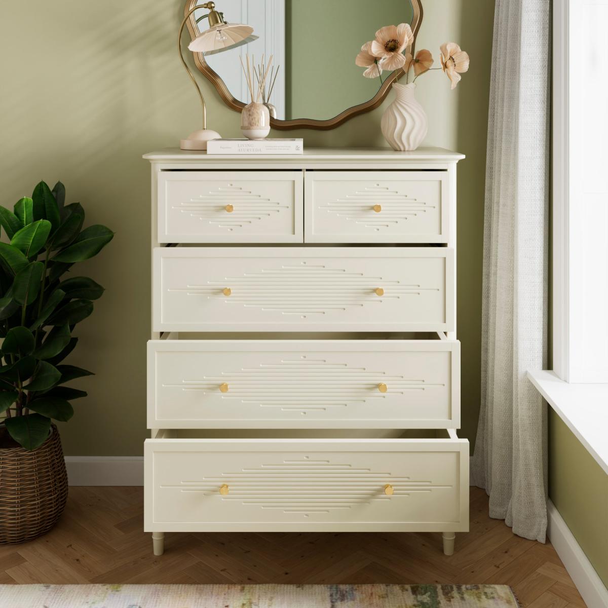 * Wooden frame * Gold hardware * Gustavian style Designed to maximise storage without compromising on style, this chest features five generously sized drawers, ideal for keeping clothing and accessories neatly organised. The Gustavian-inspired detailing, paired with elegant gold handles, creates a refined yet versatile look. Choose Soft Olive for a gentle pop of colour or Stone for a timeless, classic feel.