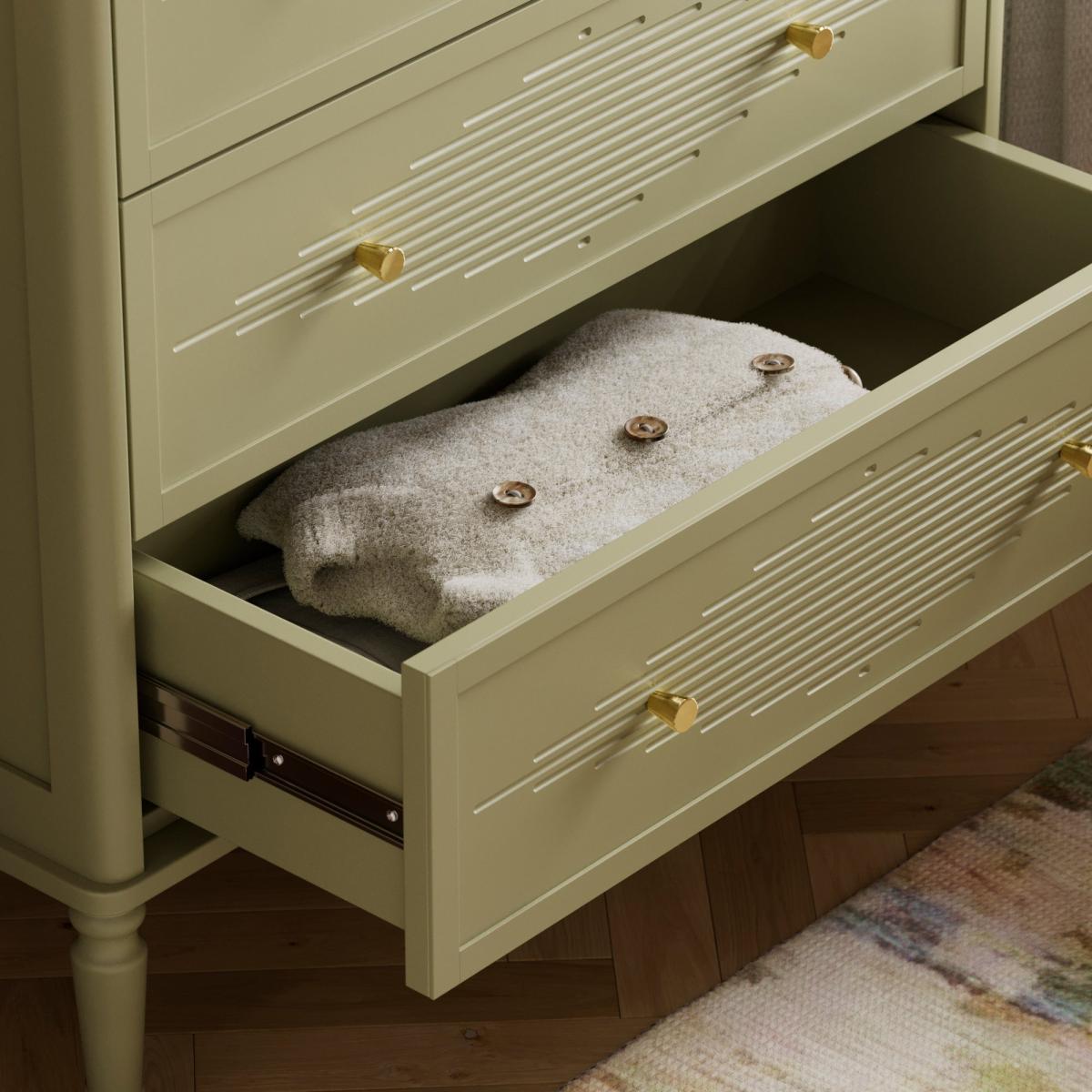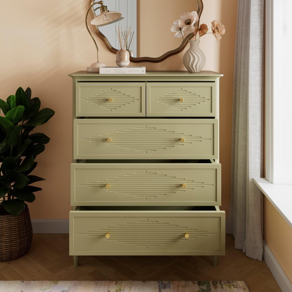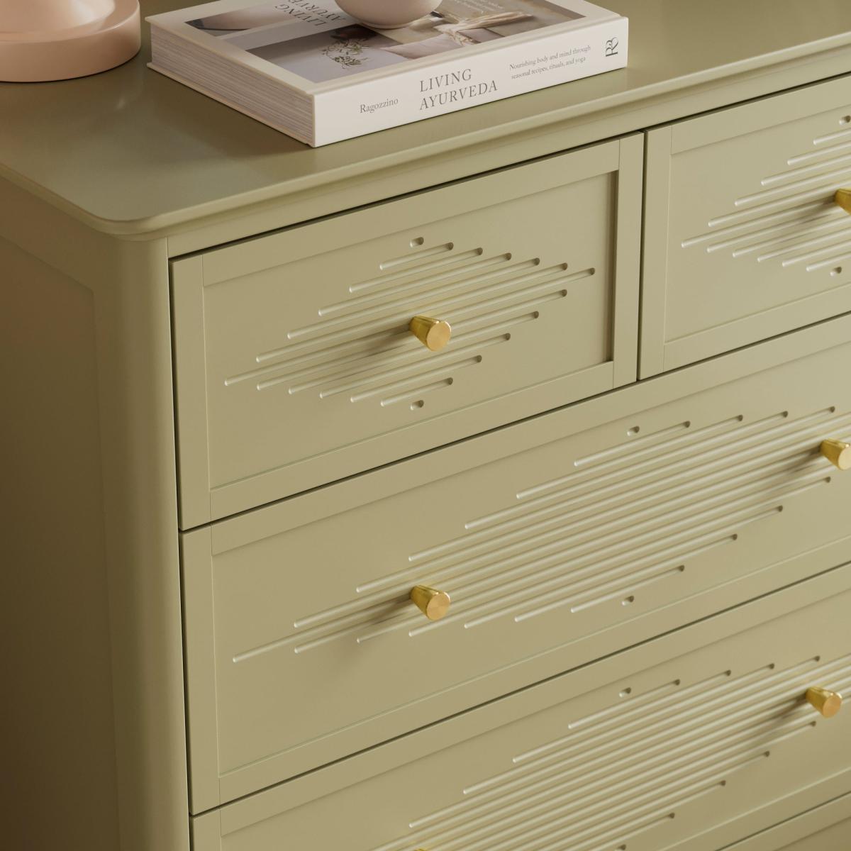 * Wooden frame * Gold hardware * Gustavian style Designed to maximise storage without compromising on style, this chest features five generously sized drawers, ideal for keeping clothing and accessories neatly organised. The Gustavian-inspired detailing, paired with elegant gold handles, creates a refined yet versatile look. Choose Soft Olive for a gentle pop of colour or Stone for a timeless, classic feel.