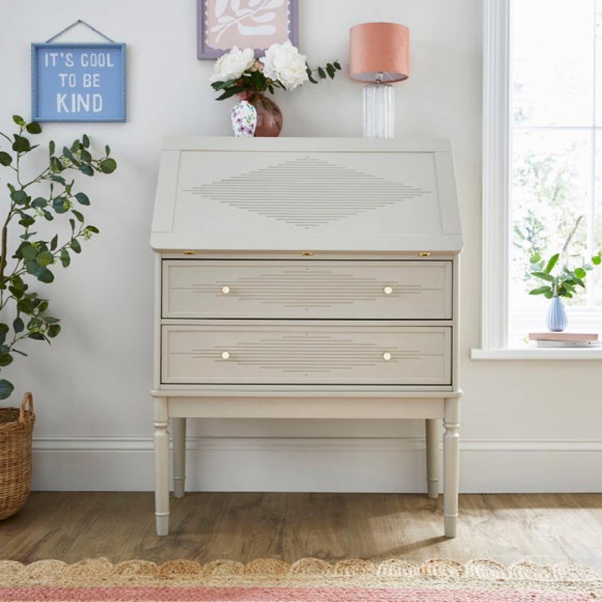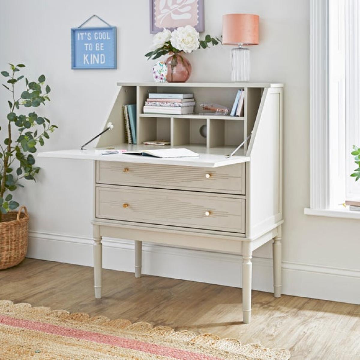 I love the Ottilie bureau because of its versatile, timeless design that works well in both traditional and contemporary interiors. It’s perfect for creating a functional home office or a stylish workspace within a living area, thanks to its clean lines and soft colour. When styling, consider adding a mix of practical and decorative items - a pretty desk lamp, open notebooks, or a few favourite accessories can make it feel inviting and personal. To keep your space organised, utilise the small compartments on top for stationery and tech, while the drawers offer ample storage for files and essentials. Its classic look and practical layout make it a smart choice for anyone wanting a chic, clutter-free workspace at home.