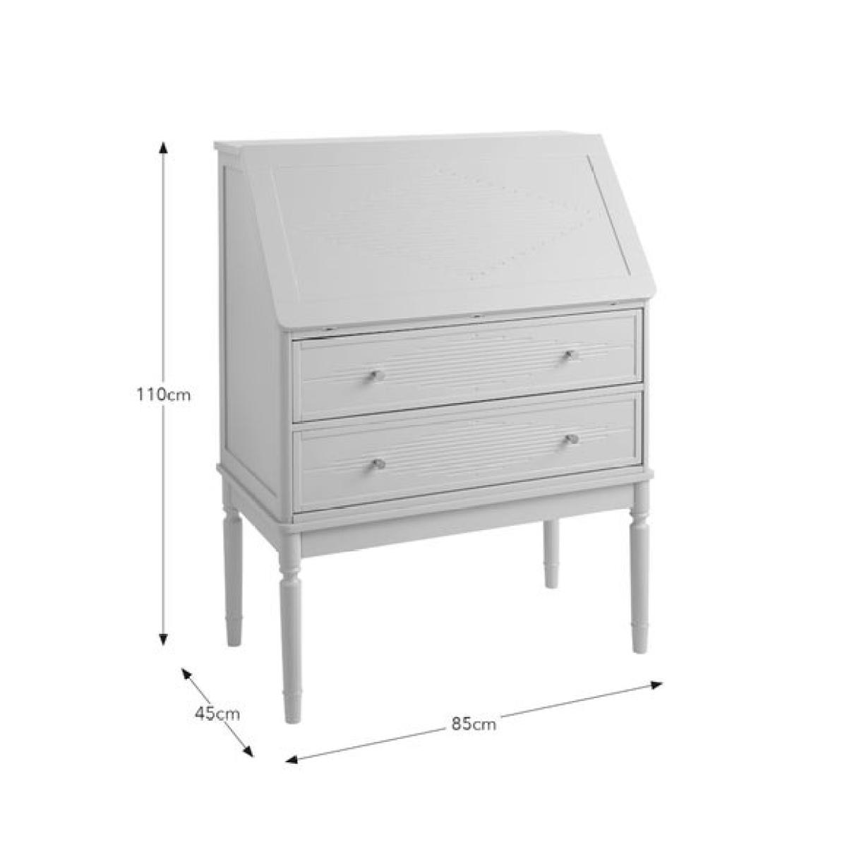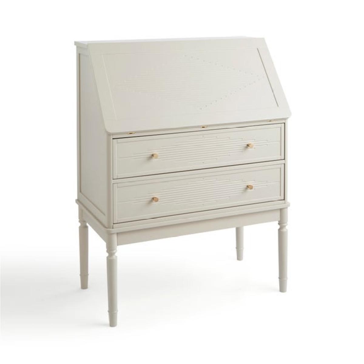 * Bureau style desk * Painted wooden frame * Gold hardware Chic, compact and full of charm, the Ottilie bureau desk is the perfect blend of classic elegance and everyday practicality. Inspired by Gustavian design, it features a soft stone finish, gently curved edges, and delicate carved details that give it a timeless feel. The fold-down front reveals a handy writing or laptop space, while the interior compartments are ideal for storing notebooks, stationery and those little essentials you always need close by. Finished with gold-toned hardware for a subtle touch of glamour, this desk is just the thing for creating a stylish home office nook—whether in the bedroom, hallway or living room.