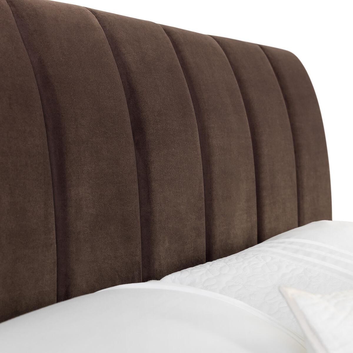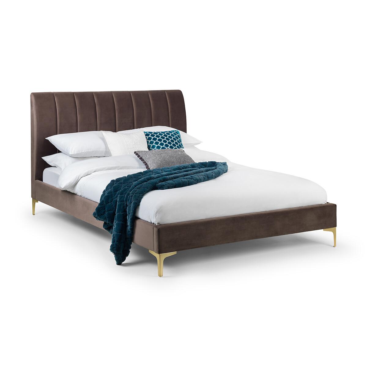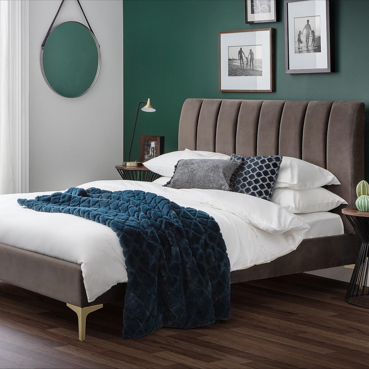 A low profile design featuring a scalloped headboard is upholstered in a soft velvet fabric complemented by brushed gold metal feet. The perfect luxury touch for any bedroom. Product Details • Metal legs • Velvet fabric upholstery with channel stitch detail • Wooden slats included • Assembly required (recommended 2 person) • Fixings supplied • 12 month manufacturers warranty • Mattress not included • Compatible with UK standard size double mattresses (190 cm x 135 cm), and UK standard size king mattresses (200 cm x 150 cm)Product Composition - 50% Wood, 25% Fabric, 20% Foam, 5% Metal. Product Dimensions Double 215 cm x145 cm x94 cm , Weight - 42 KGKing 223 cm x160 cm x94 cm , Weight - 45.5 KGPackaged Dimensions. Double: Parcel 1 Packaged Dimensions - 148 cm x 108 cm x 14.5 cm, Weight 22.5 kg Parcel 2 Packaged Dimensions - 212 cm x 20.5 cm x 19.5 cm, Weight 19 kg. King:Parcel 1 Packaged Dimensions - 163 cm x 108 cm x 14.5 cm, Weight 24.5 kg Parcel 2 Packaged Dimensions - 220 cm x 20.5 cm x 19.5 cm, Weight 21 kg. This product will be dispatched by one of our trusted suppliers. You’ll be contacted by their selected courier about your delivery. Please note: this product cannot be delivered to all Offshore Islands, Northern Ireland or Republic of Ireland.