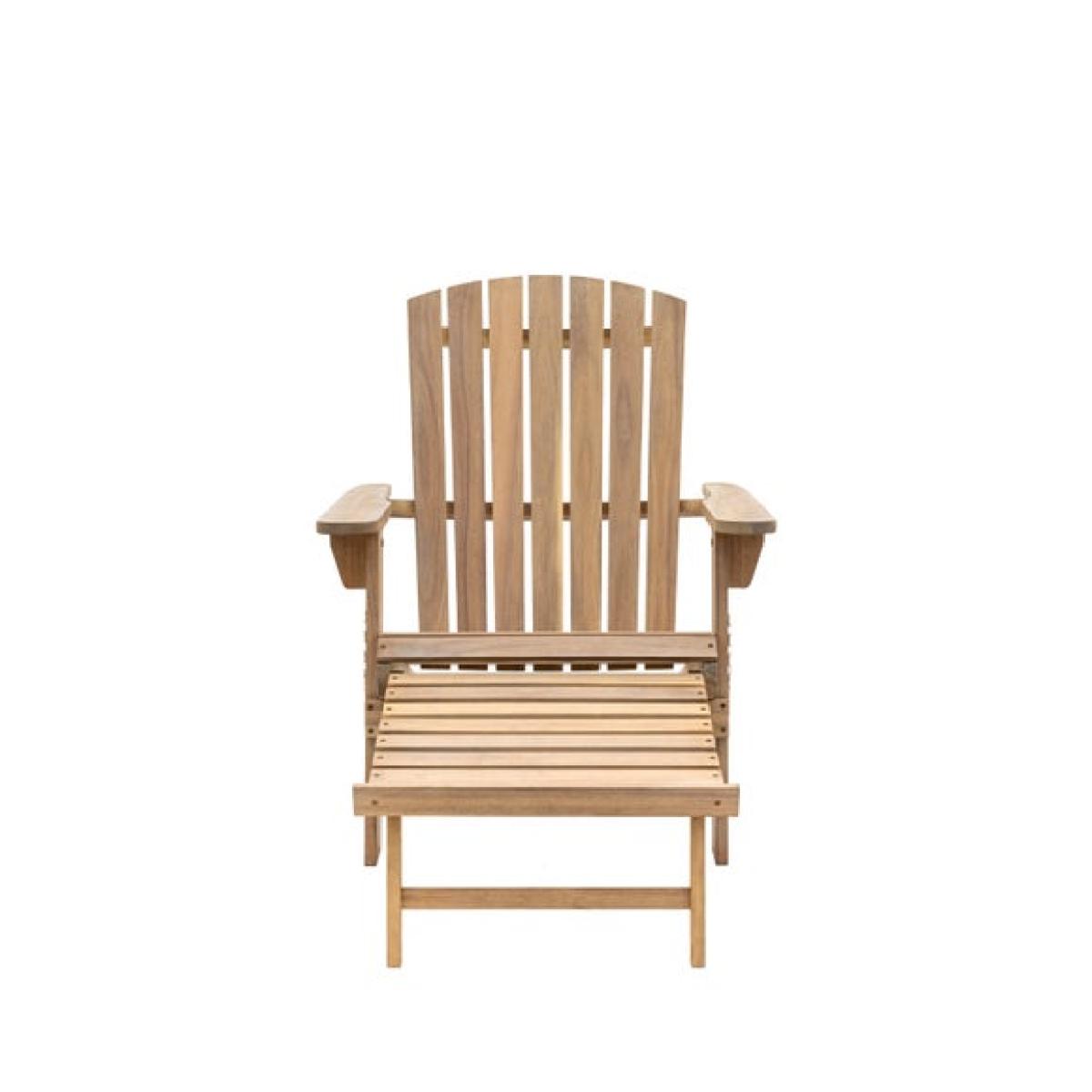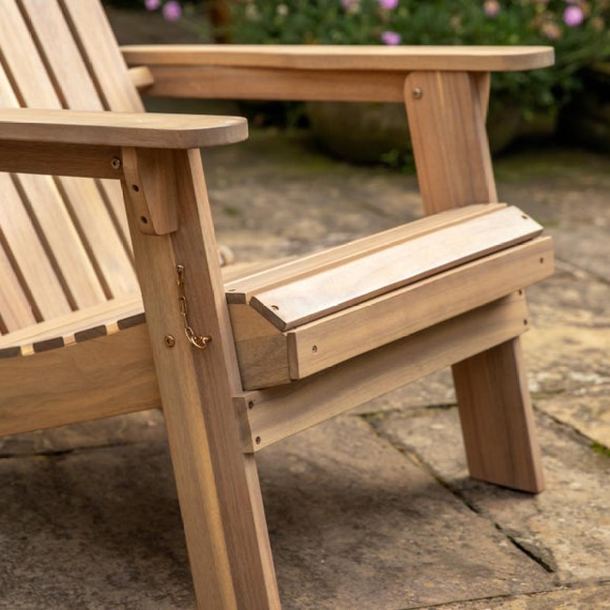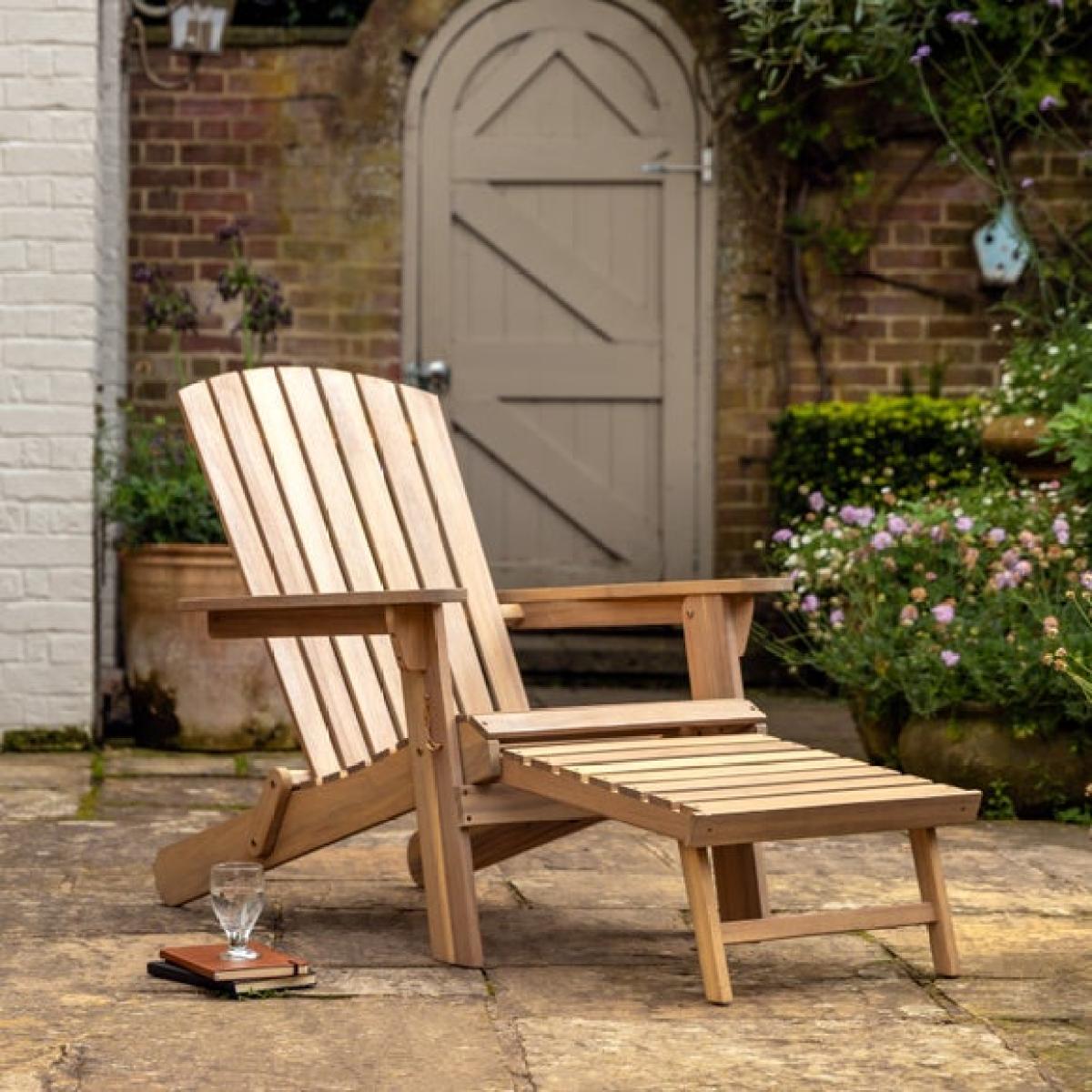 * Classic design with a twist * This lounge seat features a pull-out footstool from the front of the seat * Simply slides away when not needed * Made with acacia wood * Whole lounge seat folds away for easy storage A classic design with a twist, this lounge seat features a pull-out footstool right from the front of the seat, giving you extra comfort when lounging about in the summer sun. The pull-out footstool simply slides away when not needed; just pull it out and unfold the leg support when you want to put your feet up and relax. Made with acacia wood, the whole lounge seat folds away for easy storage, perfect for when space is tight.