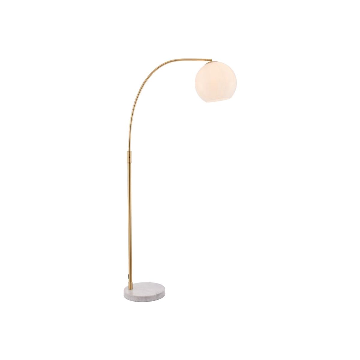 Create an 'on-trend' look with this floor lamp. The combination of gloss white glass, brushed brass plated metalwork and the white and grey marble base completes the smart Scandinavian look. Create the perfect illumination when paired with filament LED lamps.