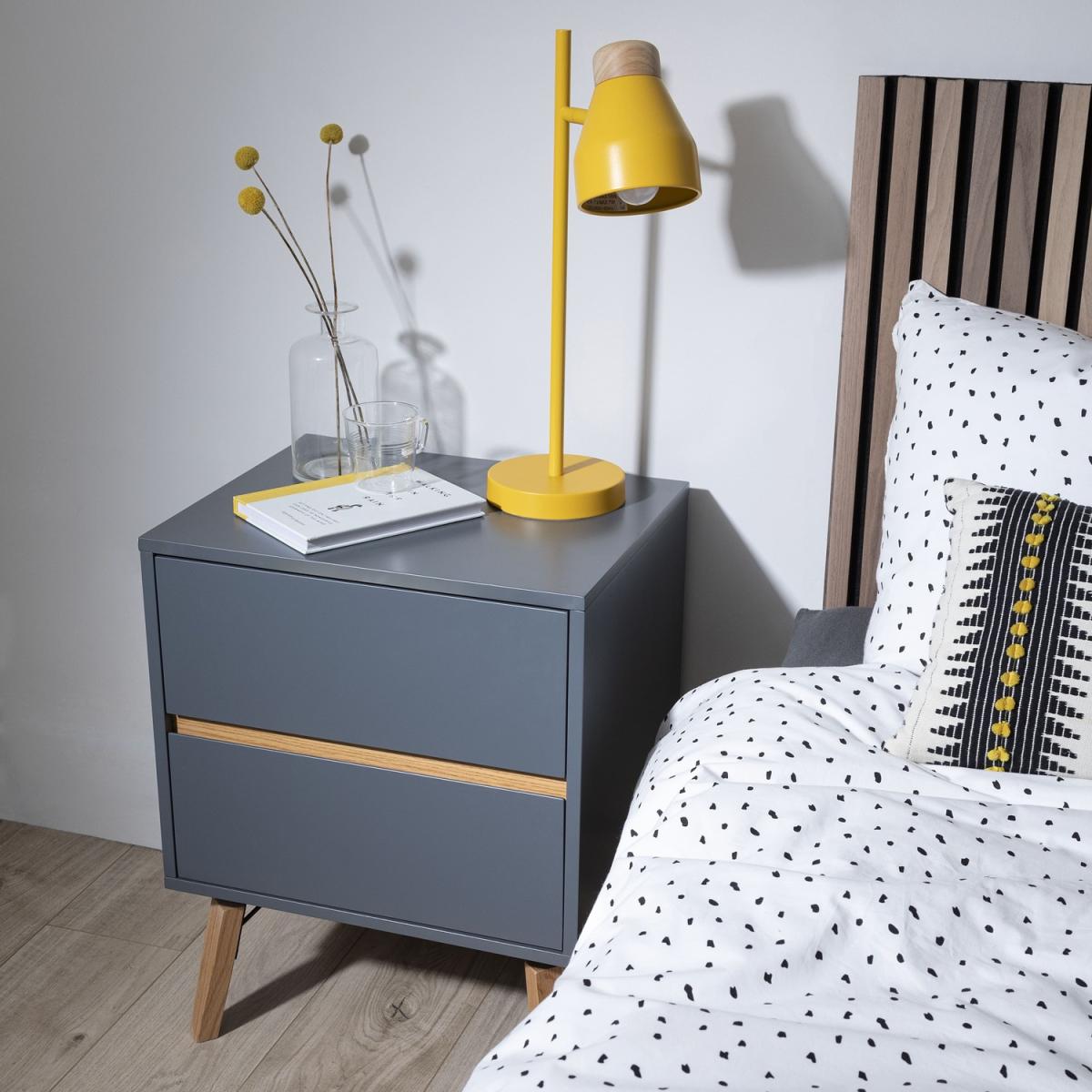 Sharpen up your bedroom decor with our Otto Bedside Table. With its sophisticated grey hue and natural pine accents, the table beautifully modernises your sleeping space. Fusing minimal lines with mid-century modern elements, Otto makes a subtle statement. Two practical drawers additionally accommodate all your bedside essentials such as books, toiletries, pyjamas or underwear. Thanks to its on-trend shade, the bedside table drips in contemporary chic. Complement its slate grey hue with mustard yellow or candy pink accoutrements for a modern spin. Suave, modern and oh-so-cool, Otto is surely the most charming bedside companion.
