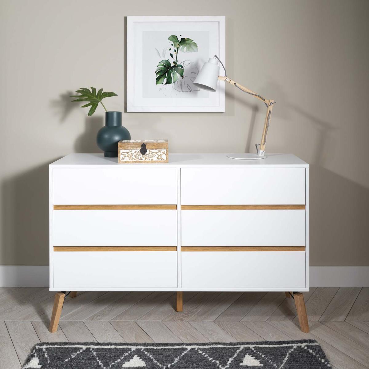 A beautiful, spacious set of drawers, Otto modernises your bedroom. Expansive and minimal, the chest boasts a statement style whilst staying simple and chic. Finished in a bright white or chic grey, the pine drawers appear to float above the petite legs for a truly unique style. Natural pine elements introduce a retro vibe to contemporary design. Six spacious drawers accommodate bedroom essentials such as clothing, underwear, sleepwear, and accessories. Designed to complement modern and neutral decor schemes, Otto is essential for any contemporary home.