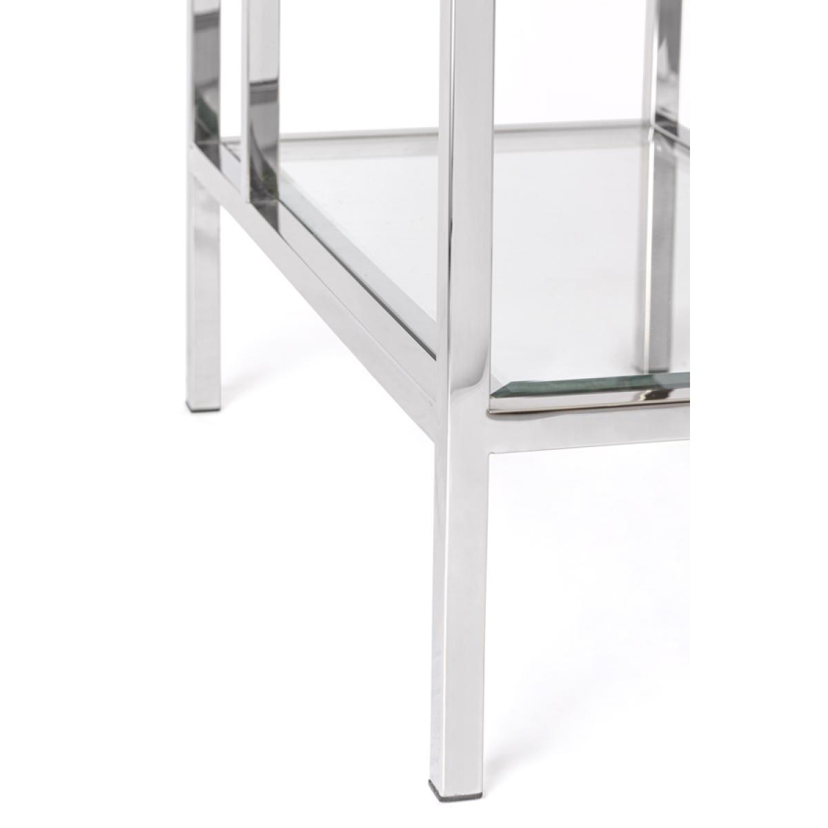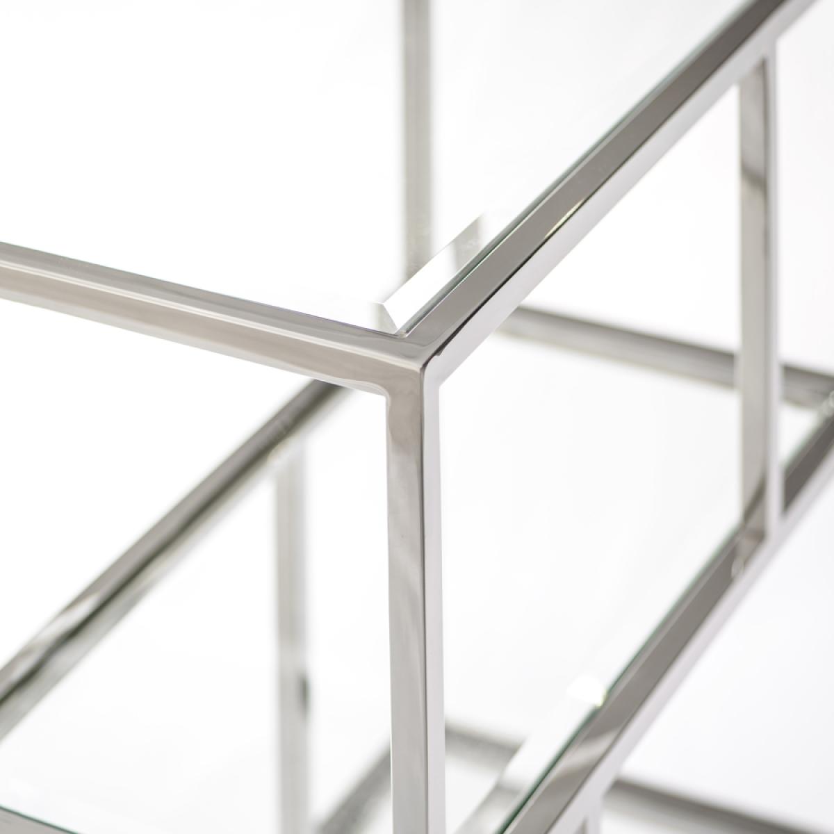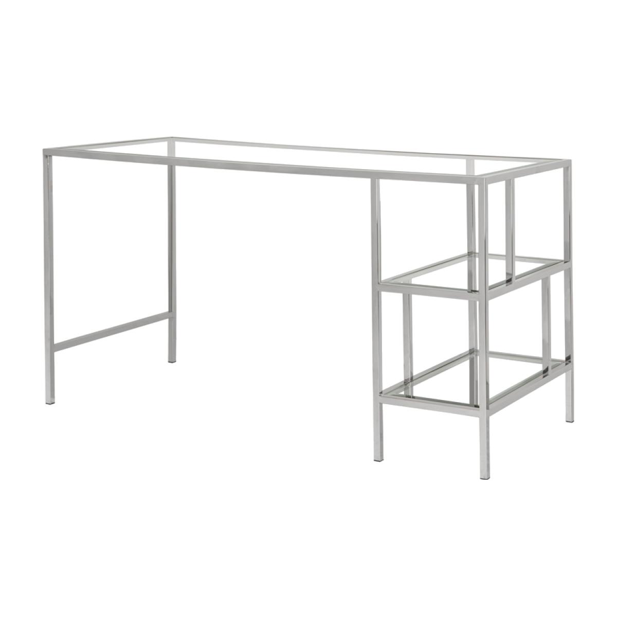 A statement desk inspired by highly collectable bespoke 1970’s furnishings. Featuring two useful shelves for keeping items organised and close to hand. Reversible design - may be used with shelves on the right or left hand side. Mirror polished stainless steel frame. Extremely strong toughened glass shelves and top. Frame supplied fully assembled.