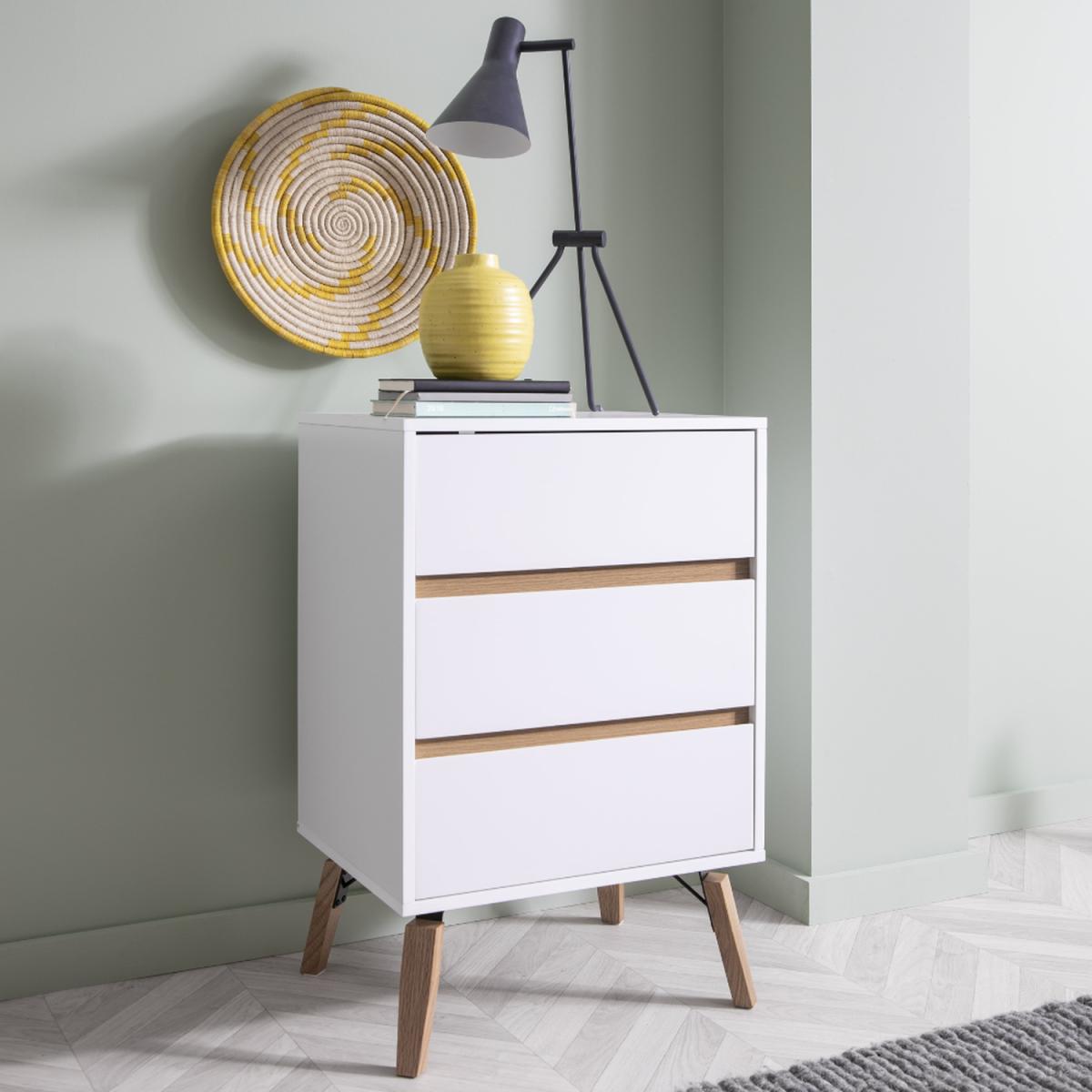 This charming little fellow offers a hip storage solution for your bedroom. The epitome of retro minimalism, Otto transforms any space into one that is cool and chic. Its clean, fresh white aesthetic suits any modern home, while the natural pine elements and mid-century modern legs add character and edge. Store undergarments, socks, accessories, or books in Otto's three drawers, and accessorize with silver photo frames to complete the look. Otto's versatile style works well with contrasting furniture for a quirky look or paired with other Otto pieces for a seamless mid-century modern vibe.