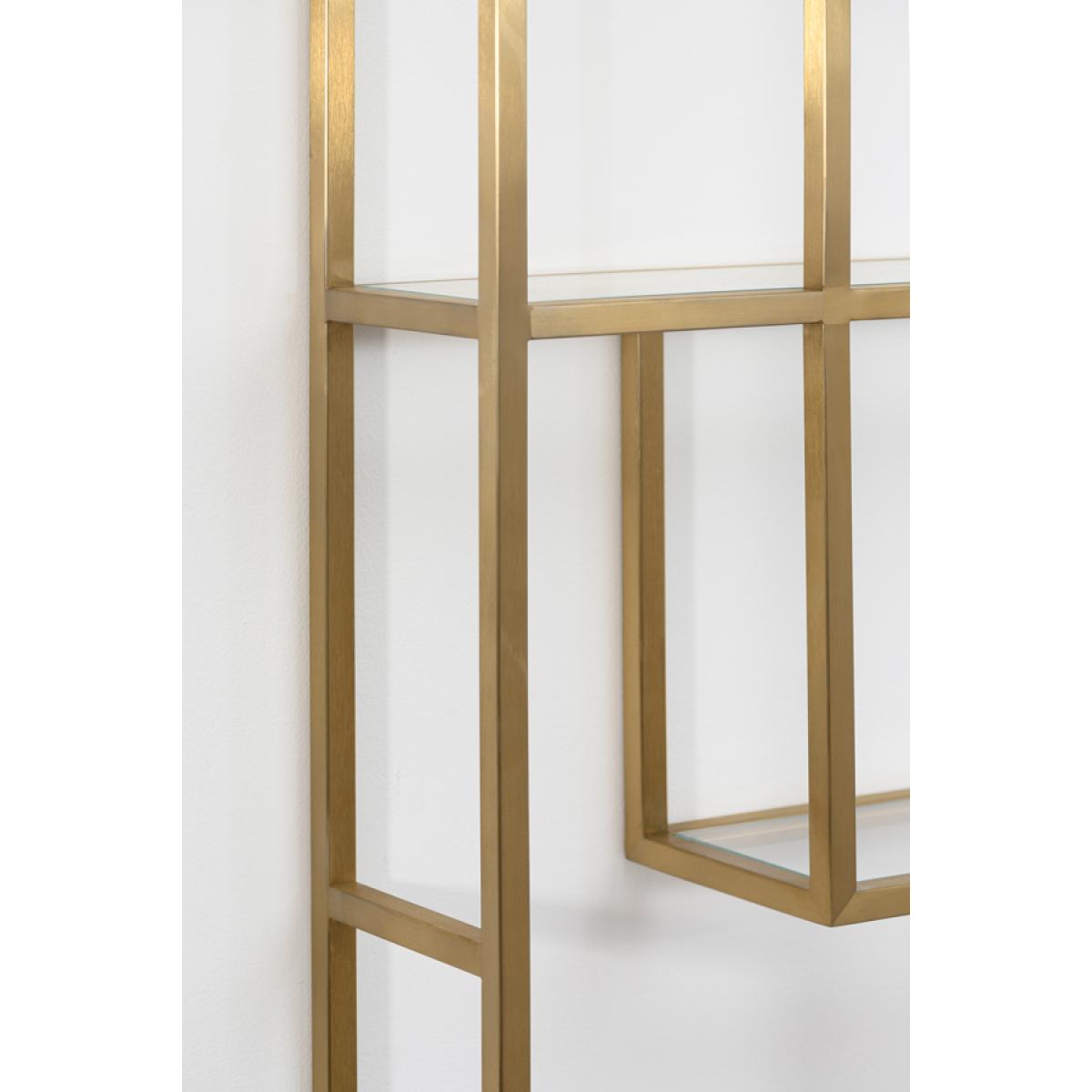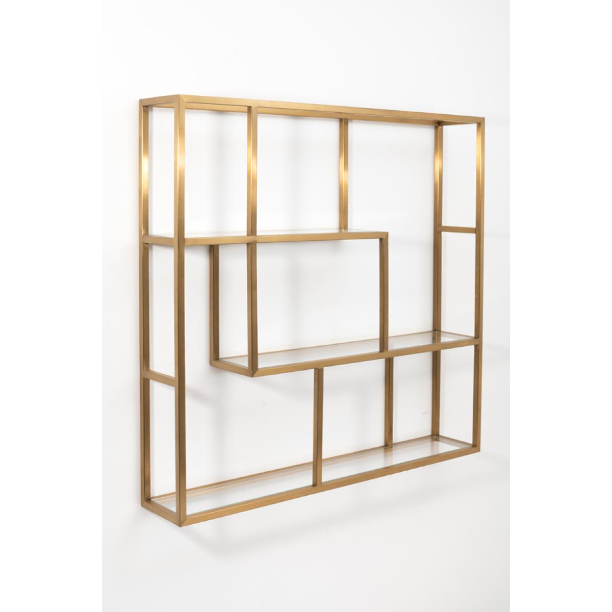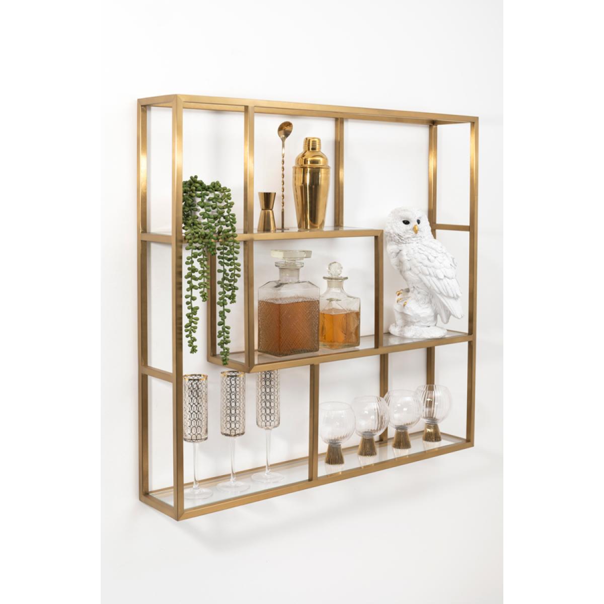 A statement wall shelf inspired by highly collectable bespoke 1970’s furnishings. Featuring three glass shelves with various shaped apertures designed for displaying and storing decorative accessories, plants and books. May be used in multiples to create a striking wall feature. (this listing is for one piece only). Stainless steel frame with brushed brass finish. Toughened glass shelves with deep bevelled edges. Simple assembly required.