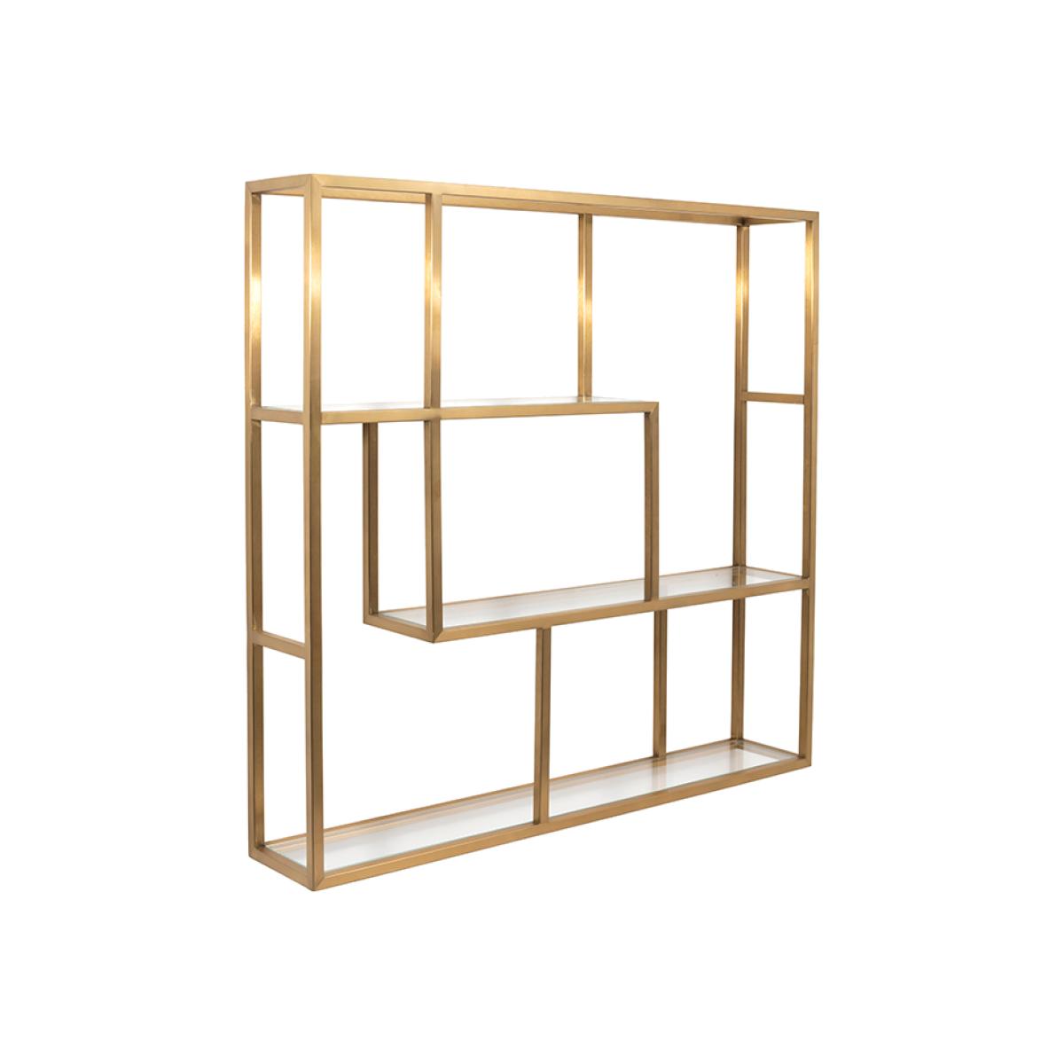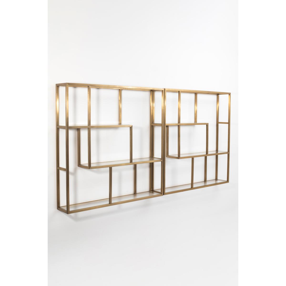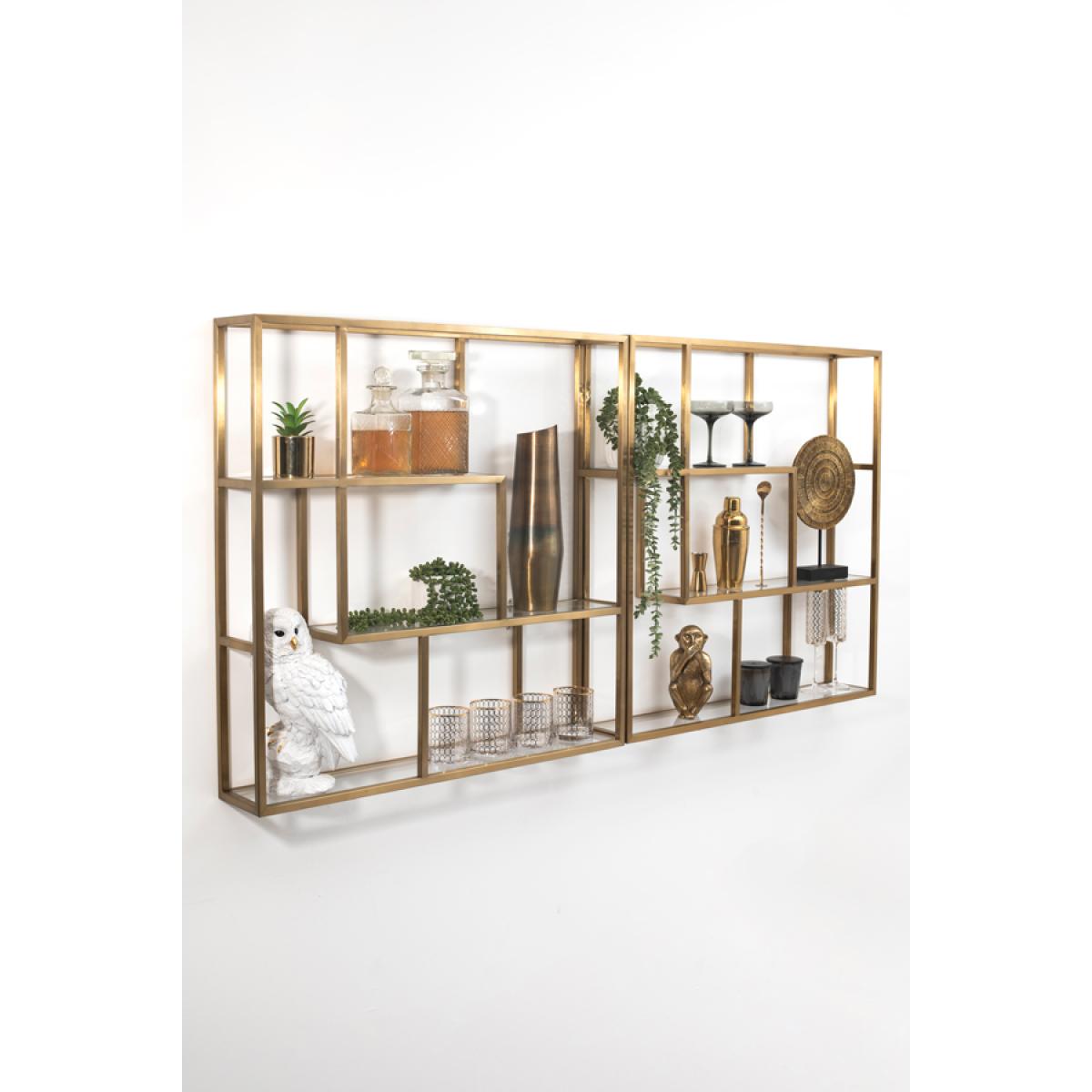 A statement wall shelf inspired by highly collectable bespoke 1970’s furnishings. Featuring three glass shelves with various shaped apertures designed for displaying and storing decorative accessories, plants and books. May be used in multiples to create a striking wall feature. (this listing is for one piece only). Stainless steel frame with brushed brass finish. Toughened glass shelves with deep bevelled edges. Simple assembly required.