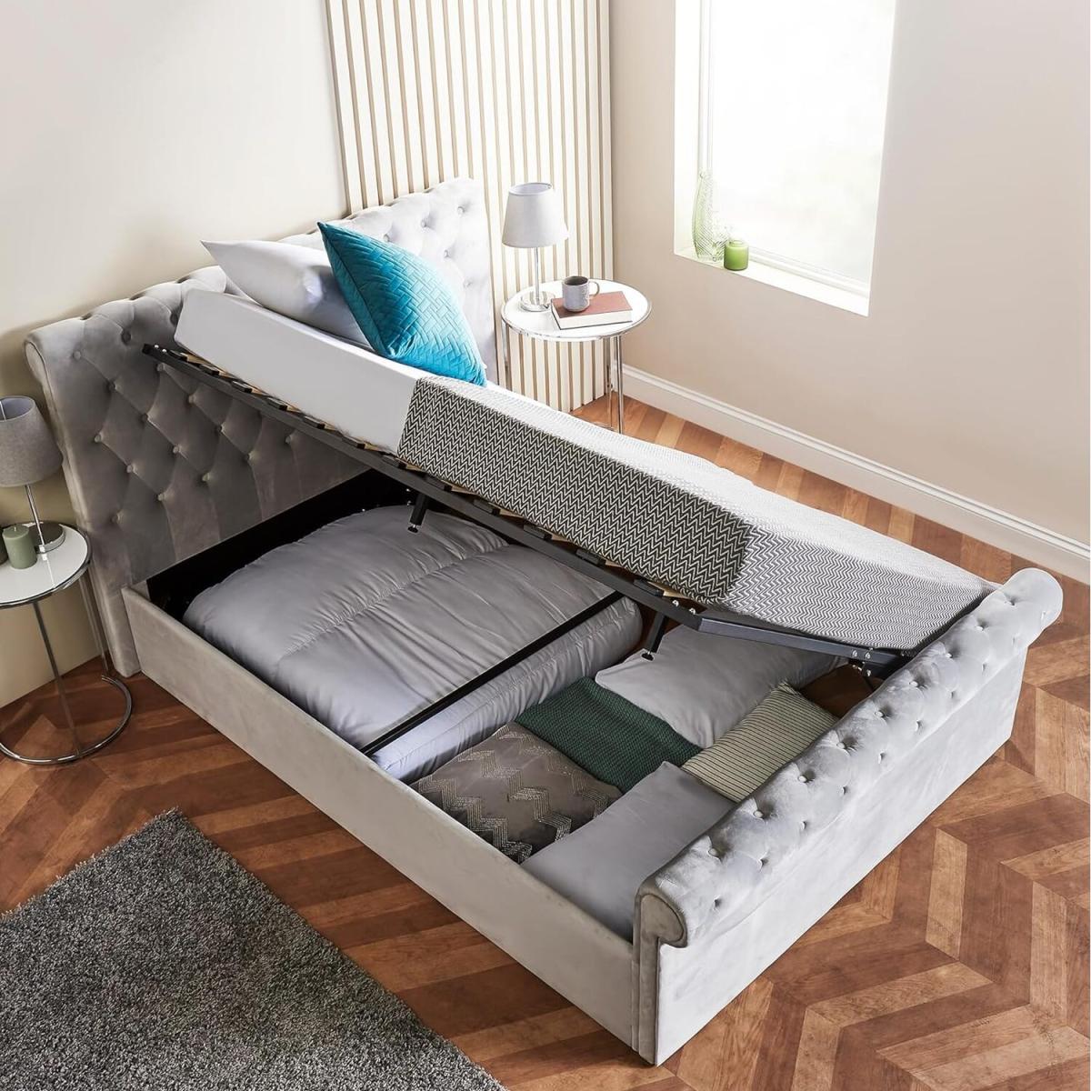They were upholstered in a beautiful grey two-tone brushed velvet in a sleigh design with buttons. This ottoman storage bed frame will make a statement in any bedroom interior. Create extra space in your bedroom with a huge capacity under-bed storage compartment. Install Left or Right facing side lift. Fabric base included. Extra padded headboard, base & sides with sprung wooden slats to absorb body and mattress weight. Made from the highest quality materials including the strong centre support beams, slats and extra middle support legs. Pocket Sprung Mattress Option. High comfort pocket sprung & memory foam hybrid mattress. Breathable cool touch hypoallergenic cover, anti-dust and anti-mite. High-density 3cm foam & memory foam quilted top layer. Medium firm for all ages & sleeping positions 16cm thick.