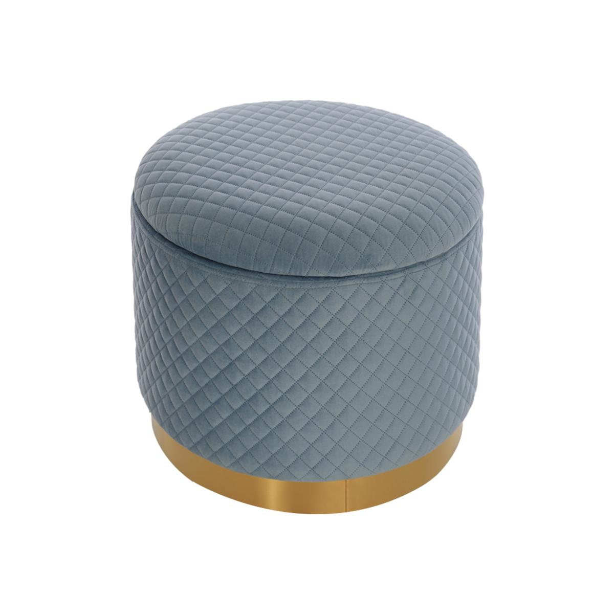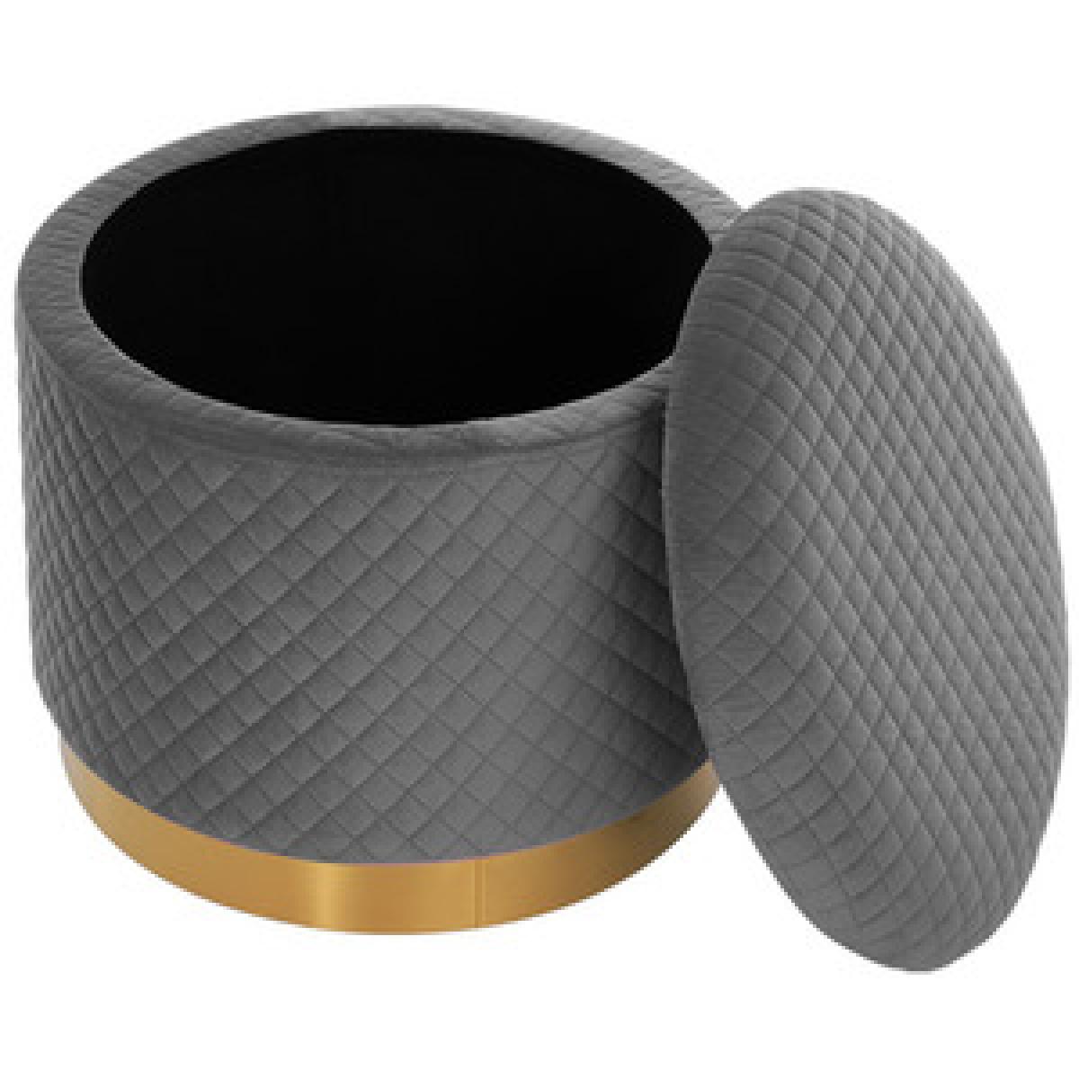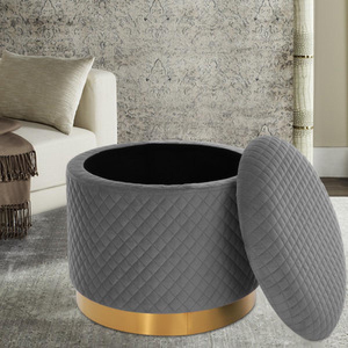 This round velvet storage ottoman footrest stool with a gold plating base. Store exercise equipment, household accessories or books linens inside this spacious ottoman, and use the top as a footrest or extra seating when you're relaxing with friends in the living room. In addition to acting as a comfortable footrest, perfect for holding drinks, snacks, and more.