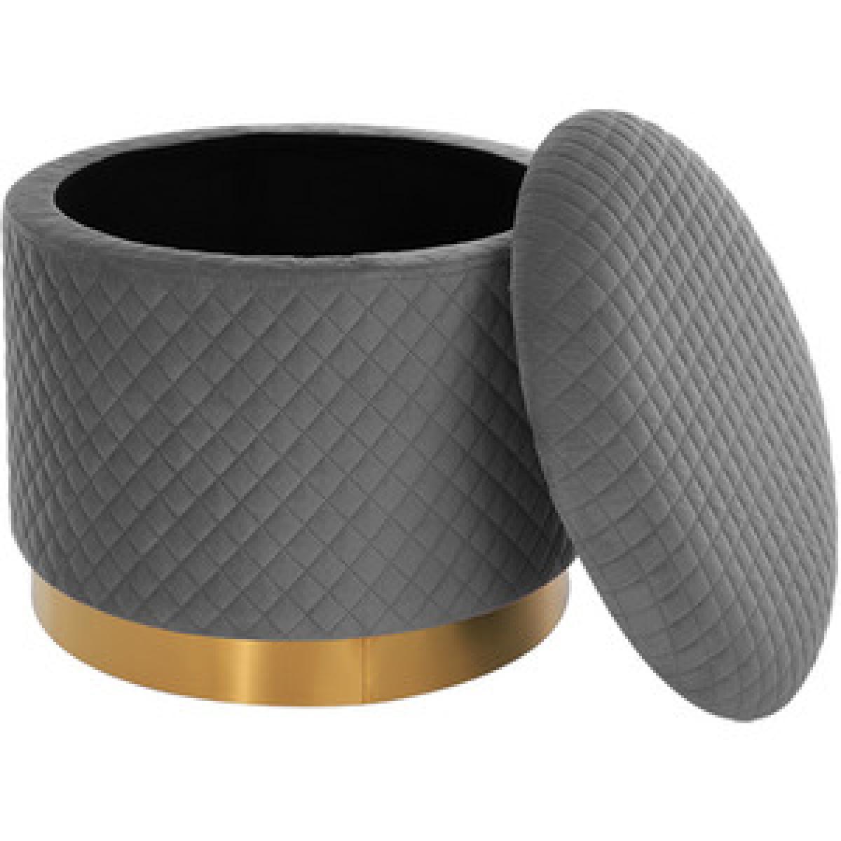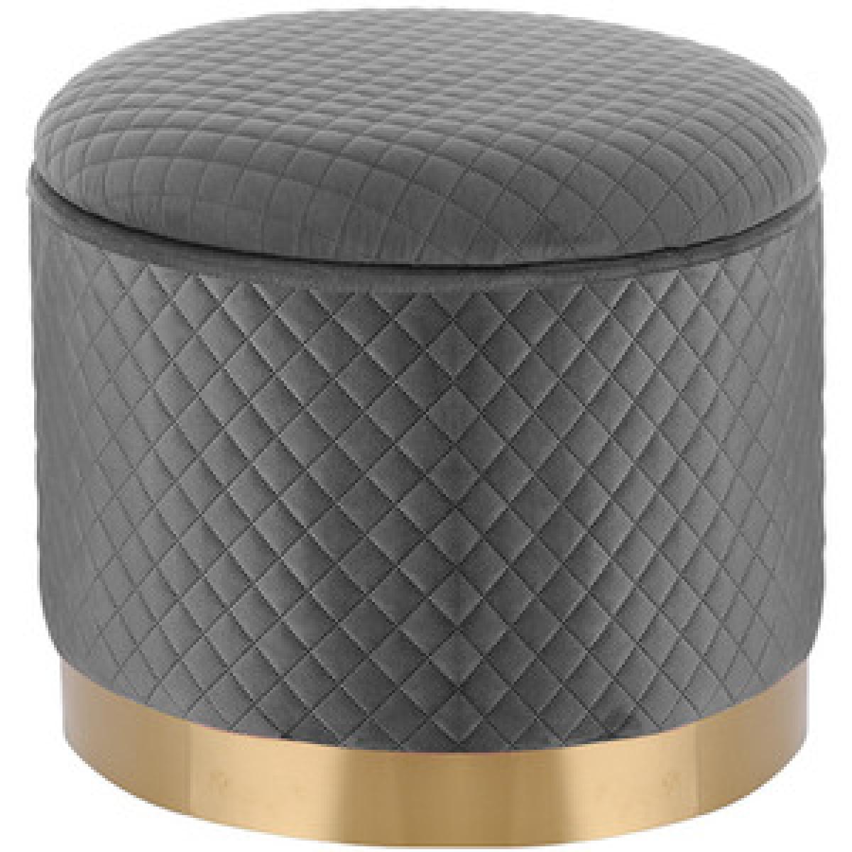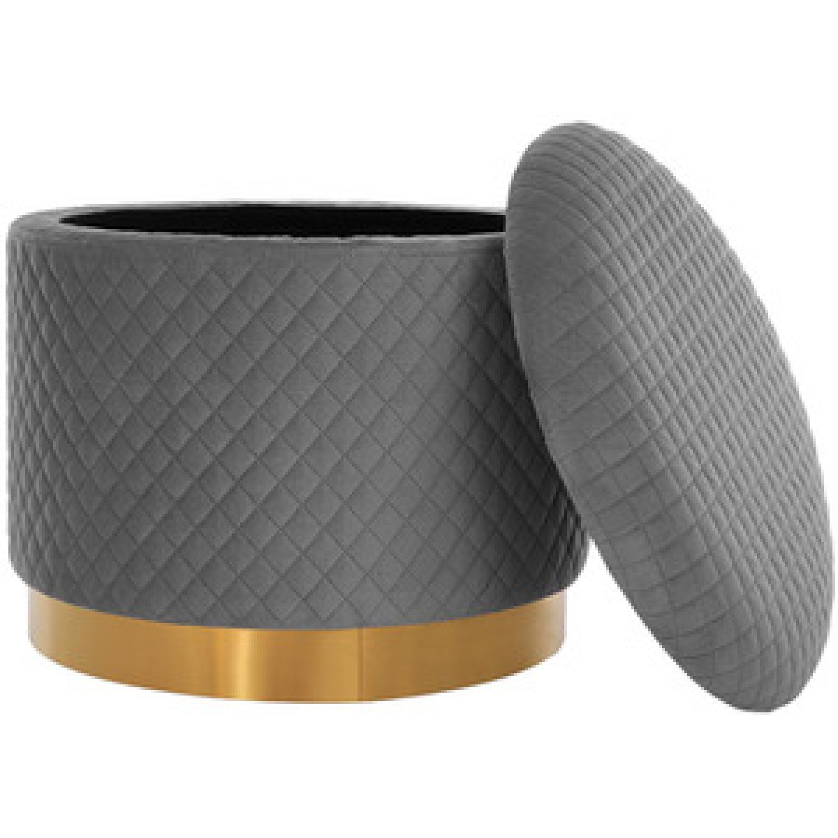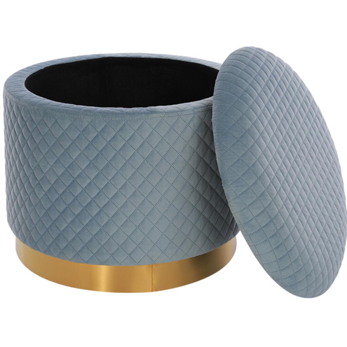 This round velvet storage ottoman footrest stool with a gold plating base. Store exercise equipment, household accessories or books linens inside this spacious ottoman, and use the top as a footrest or extra seating when you're relaxing with friends in the living room. In addition to acting as a comfortable footrest, perfect for holding drinks, snacks, and more.