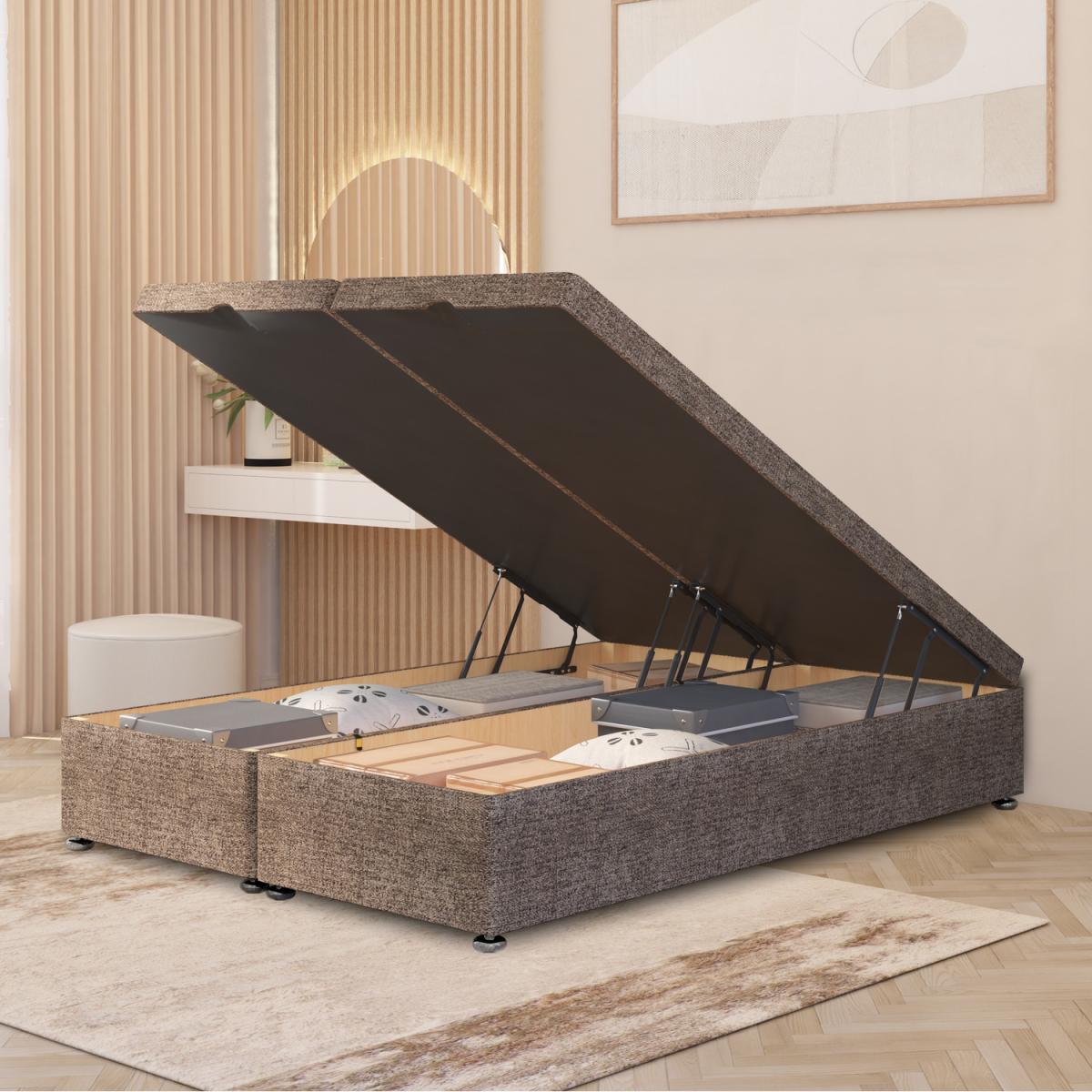 This Solid Wood Tweed Fabric End Opening Ottoman Divan Bed Base combines timeless design with superior functionality. Expertly crafted in the UK from solid wood, this ottoman offers exceptional strength, stability, and long-lasting quality. The solid, non-slip platform top provides firm, even support for your mattressfar superior to slatted frames that can flex or weaken over time. Inside, the luxury wooden interior showcases a rich wood tone and smooth finish, elevating the look and feel of the storage space. Unlike cheaper ottomans where items rest directly on the floor, this base features a fully boarded wooden floor, keeping your belongings neat, protected, and easily accessible. The base stands 34.5cm high (37.5cm with gliders) and offers 24cm of discreet internal storage, easily accessed via gas-assisted end-lift pistons (600N800. N depending on size). All sizes are UK made and meet the highest safety and quality standards. 2FT. 6 Ottoman Bed, L 190cm x W 79cm