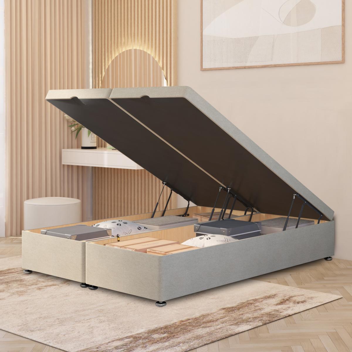 This Solid Wood Tweed Fabric End Opening Ottoman Divan Bed Base combines timeless design with superior functionality. Expertly crafted in the UK from solid wood, this ottoman offers exceptional strength, stability, and long-lasting quality. The solid, non-slip platform top provides firm, even support for your mattressfar superior to slatted frames that can flex or weaken over time. Inside, the luxury wooden interior showcases a rich wood tone and smooth finish, elevating the look and feel of the storage space. Unlike cheaper ottomans where items rest directly on the floor, this base features a fully boarded wooden floor, keeping your belongings neat, protected, and easily accessible. The base stands 34.5cm high (37.5cm with gliders) and offers 24cm of discreet internal storage, easily accessed via gas-assisted end-lift pistons (600N800. N depending on size). All sizes are UK made and meet the highest safety and quality standards. 4FT Ottoman Bed, L 193cm x W 123cm