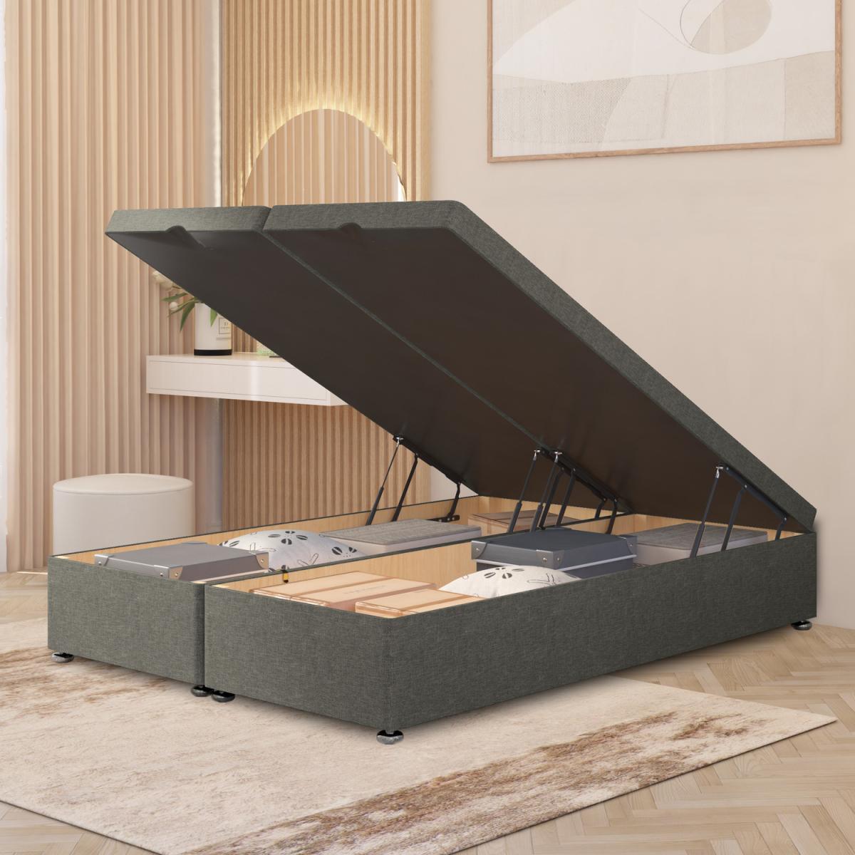 This Solid Wood Linen Fabric End Opening Ottoman Divan Bed Base combines timeless design with superior functionality. Expertly crafted in the UK from solid wood, this ottoman offers exceptional strength, stability, and long-lasting quality. The solid, non-slip platform top provides firm, even support for your mattress far superior to slatted frames that can flex or weaken over time. Inside, the luxury wooden interior showcases a rich wood tone and smooth finish, elevating the look and feel of the storage space. Unlike cheaper ottomans where items rest directly on the floor, this base features a fully boarded wooden floor, keeping your belongings neat, protected, and easily accessible. The base stands 34.5cm high (37.5cm with gliders) and offers 24cm of discreet internal storage, easily accessed via gas-assisted end-lift pistons (600N/800 N depending on size). All sizes are UK made and meet the highest safety and quality standards. 5FT Ottoman Bed, L 203cm x W 153cm