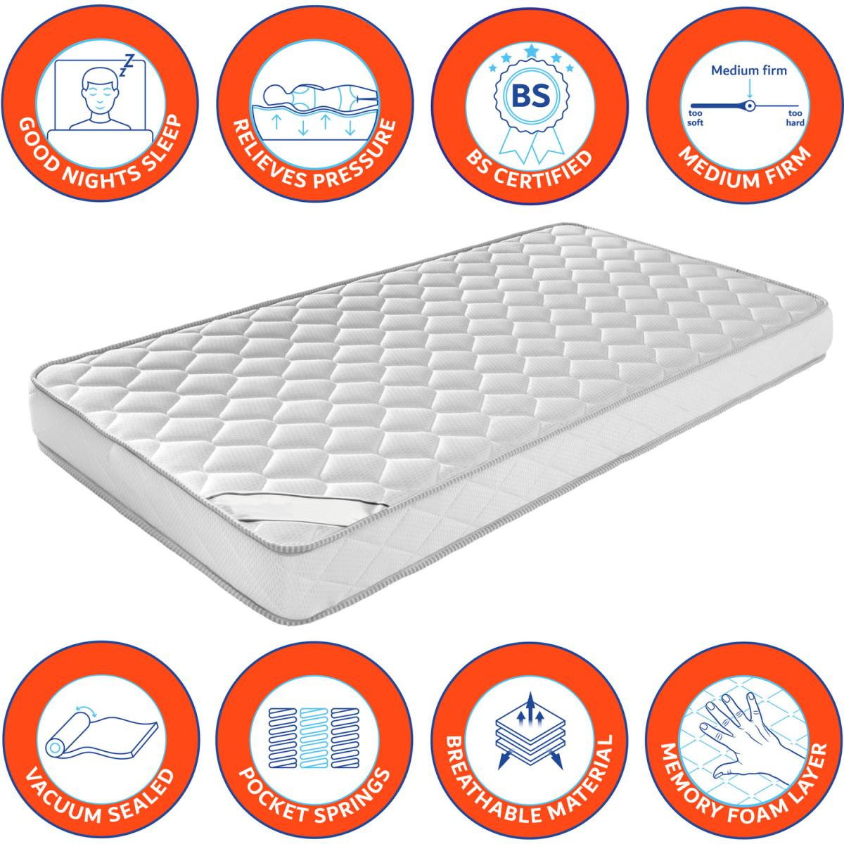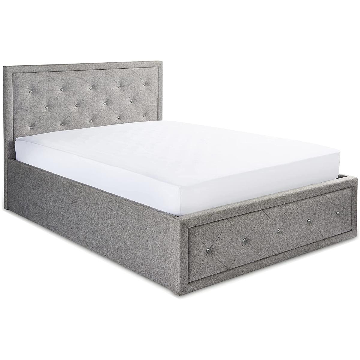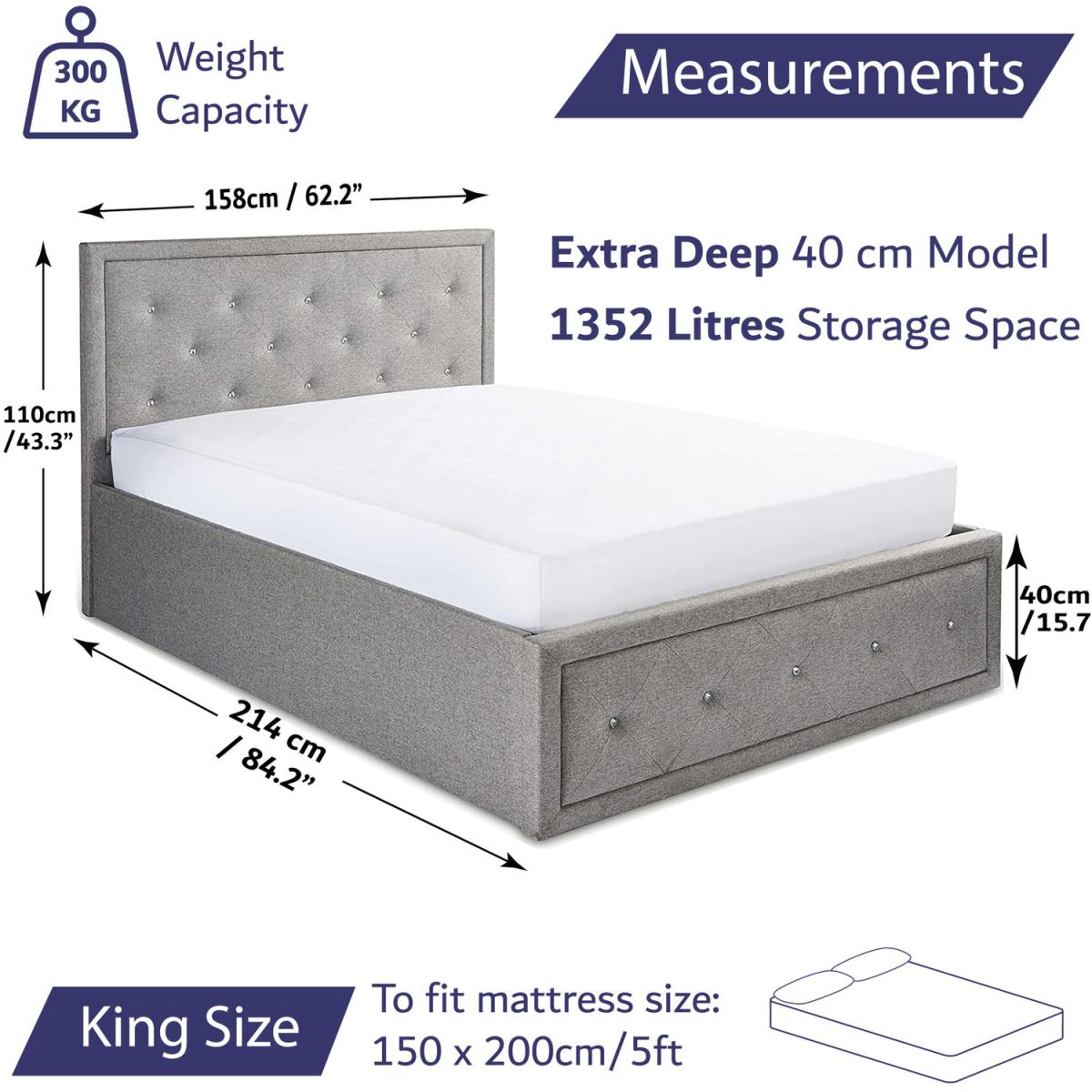 Luxurious bed frame with embossed diamante finish with high shine jewel's on headboard and footboard. Upholstered in a beautiful grey linen finish. Plush Padded headboard, base & sides upholstered. Sprung wooden slats to adapt and support weight. Huge under-bed storage capacity to create extra space in your bedroom. Easy lift gas mechanism with front lift access. This storage bed is made from the highest quality materials including the strong centre support beams. Mark & water-resistant linen finish. Pocket & Memory Foam Mattress Highest comfort premium hybrid mattress - Thick 16cm up to 660 independant pocket springs mould to the body. High-density foam +memory foam 2cm quilted top layer. Medium Firm- British Standard Certified. Breathable hypoallergenic cool touch cover. Anti-dust + Anti-mite