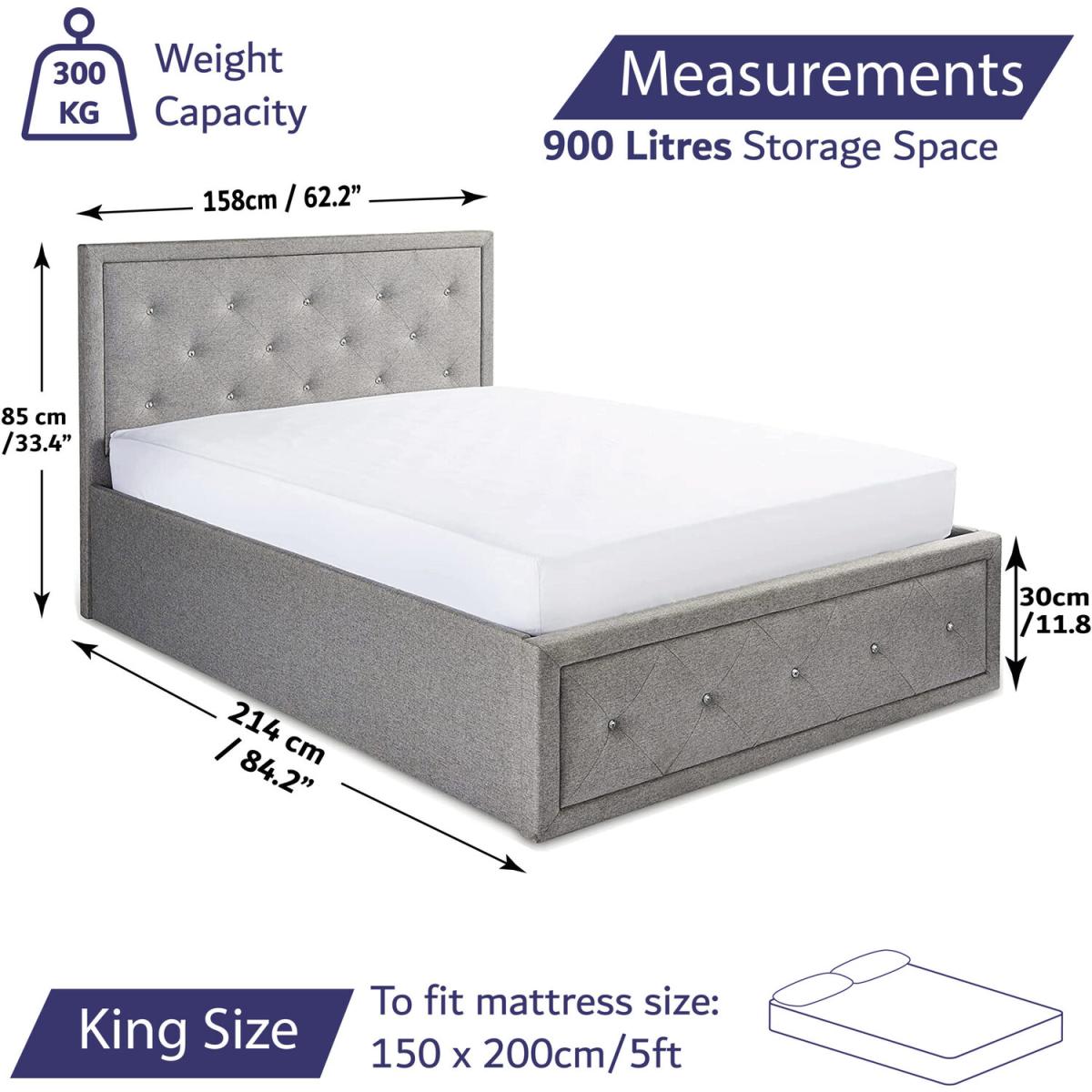 Luxurious bed frame with embossed diamante finish with high shine jewel's on headboard and footboard. Upholstered in a beautiful grey linen finish. Plush Padded headboard, base & sides upholstered. Sprung wooden slats to adapt and support weight. Huge under bed storage capacity to create extra space in your bedroom. Easy lift gas mechanism with front lift access. This storage bed is made from the highest quality materials including the strong centre support beams. Mark & water-resistant linen finish.