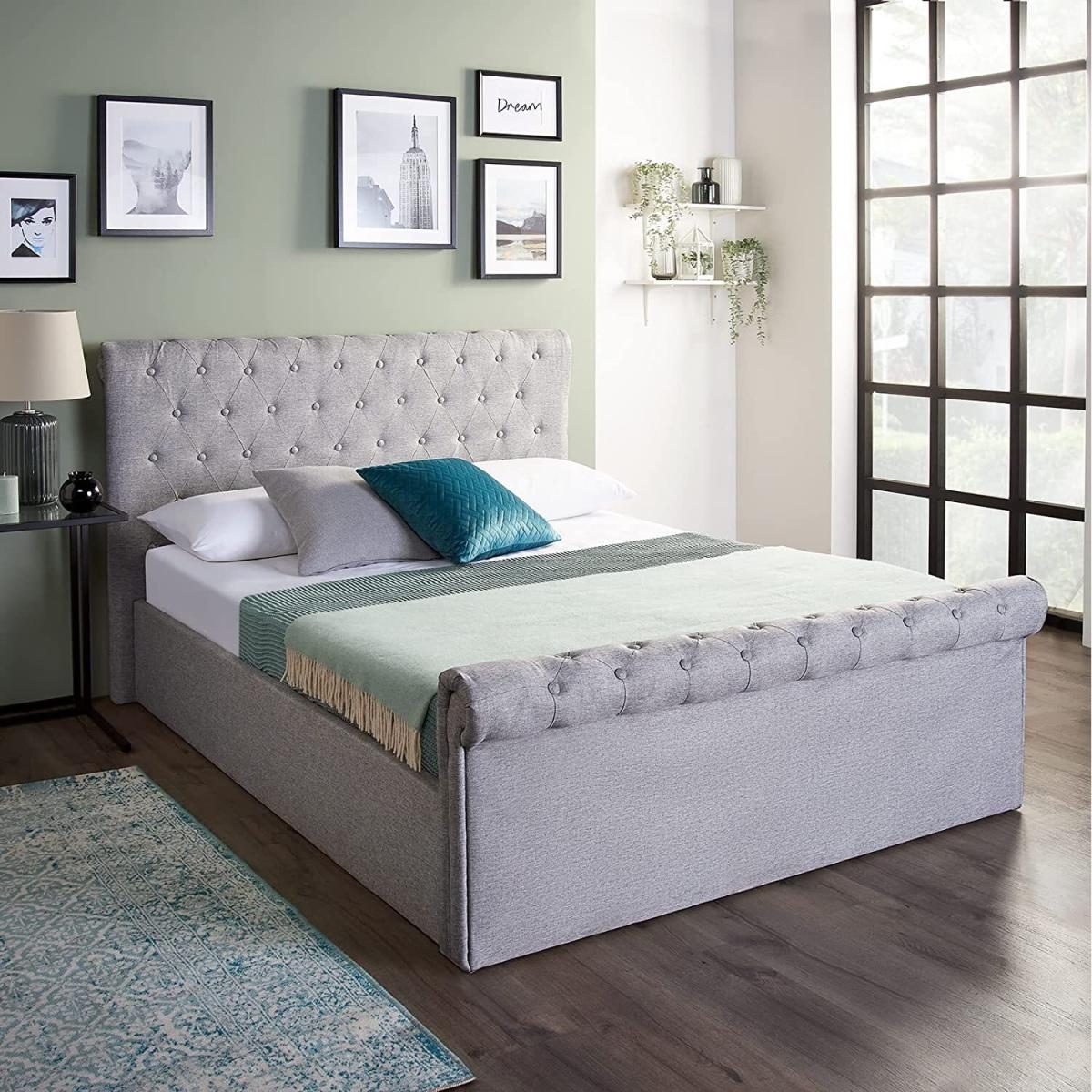 Upholstered in a beautiful grey hopsack linen in sleigh design with buttons. This ottoman storage bed frame will make a statement in any bedroom interior. Create extra space in your bedroom with a huge capacity under-bed storage compartment. Install Left or Right facing side lift. Fabric base included. Extra padded headboard, base & sides with sprung wooden slats to absorb body and mattress weight. The strong centre support beams, slats, and extra middle support legs are made from the highest quality materials. Hardwearing mark and water-resistant fabric upholstery. Purchase with or without mattress. Mattress option a thick 16cm luxury pocket sprung mattress with independent pocket springs to adapt to weight. Breathable cool touch hypoallergenic cover, anti dust and anti mite. High density 400gsm foam top sleeping layer medium firm rating.