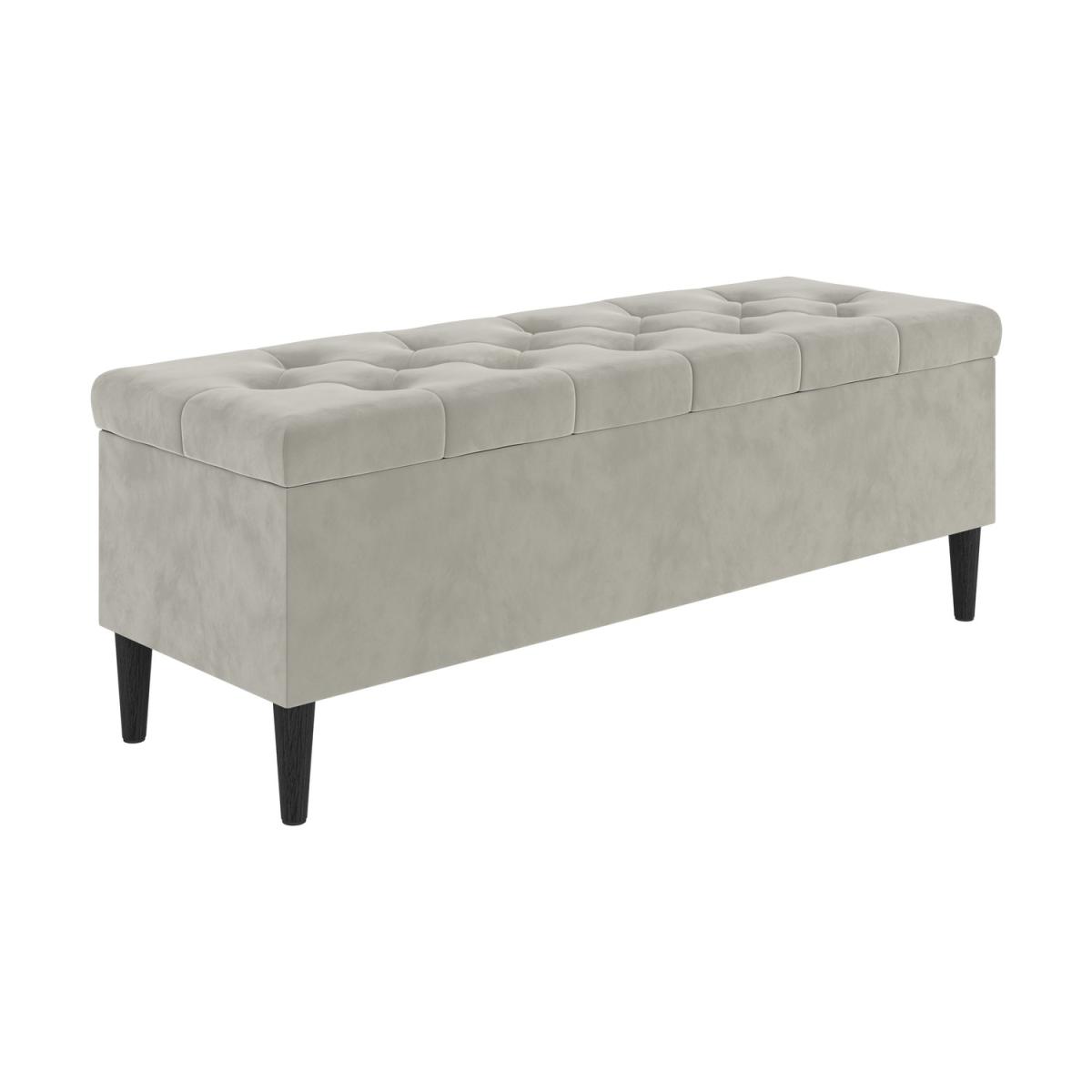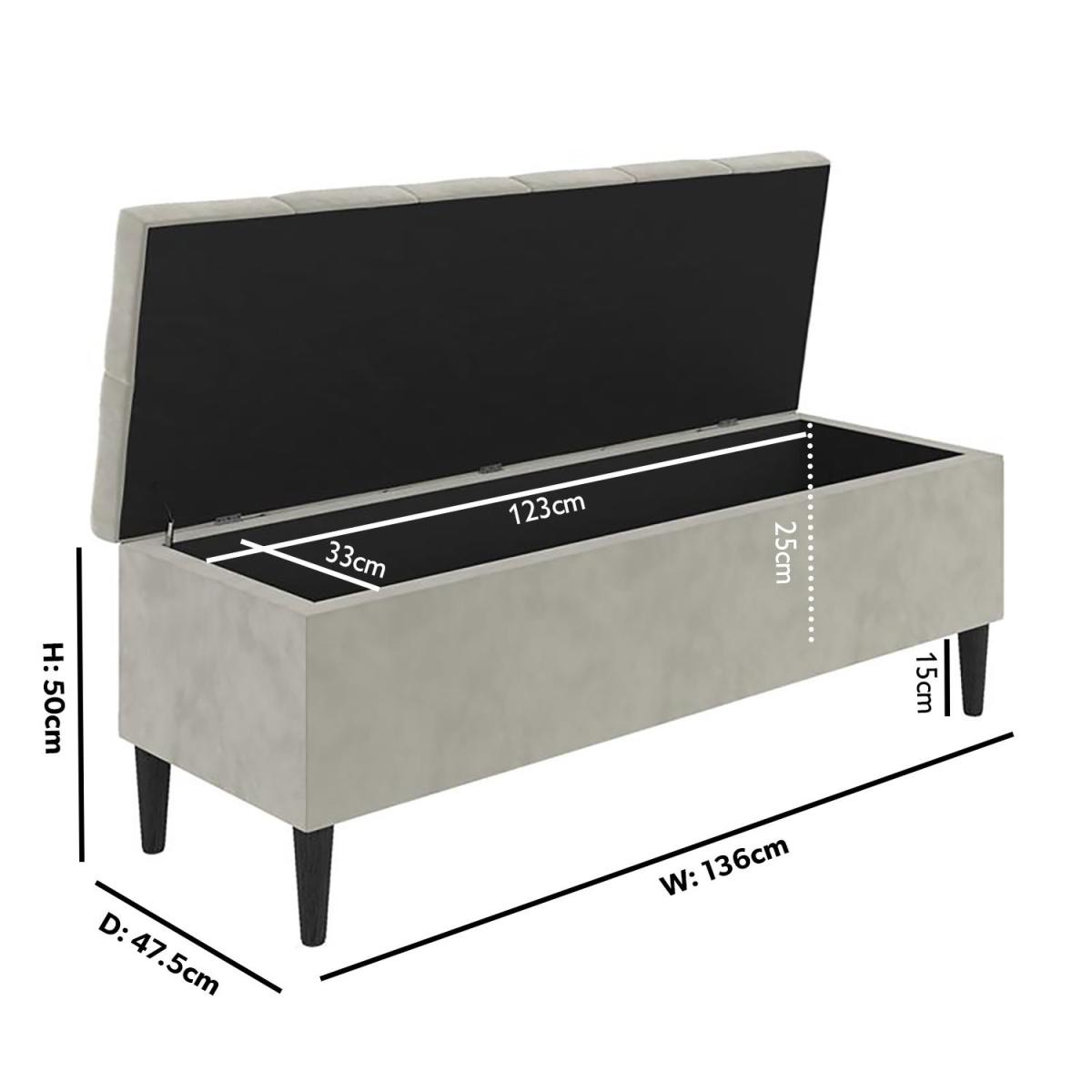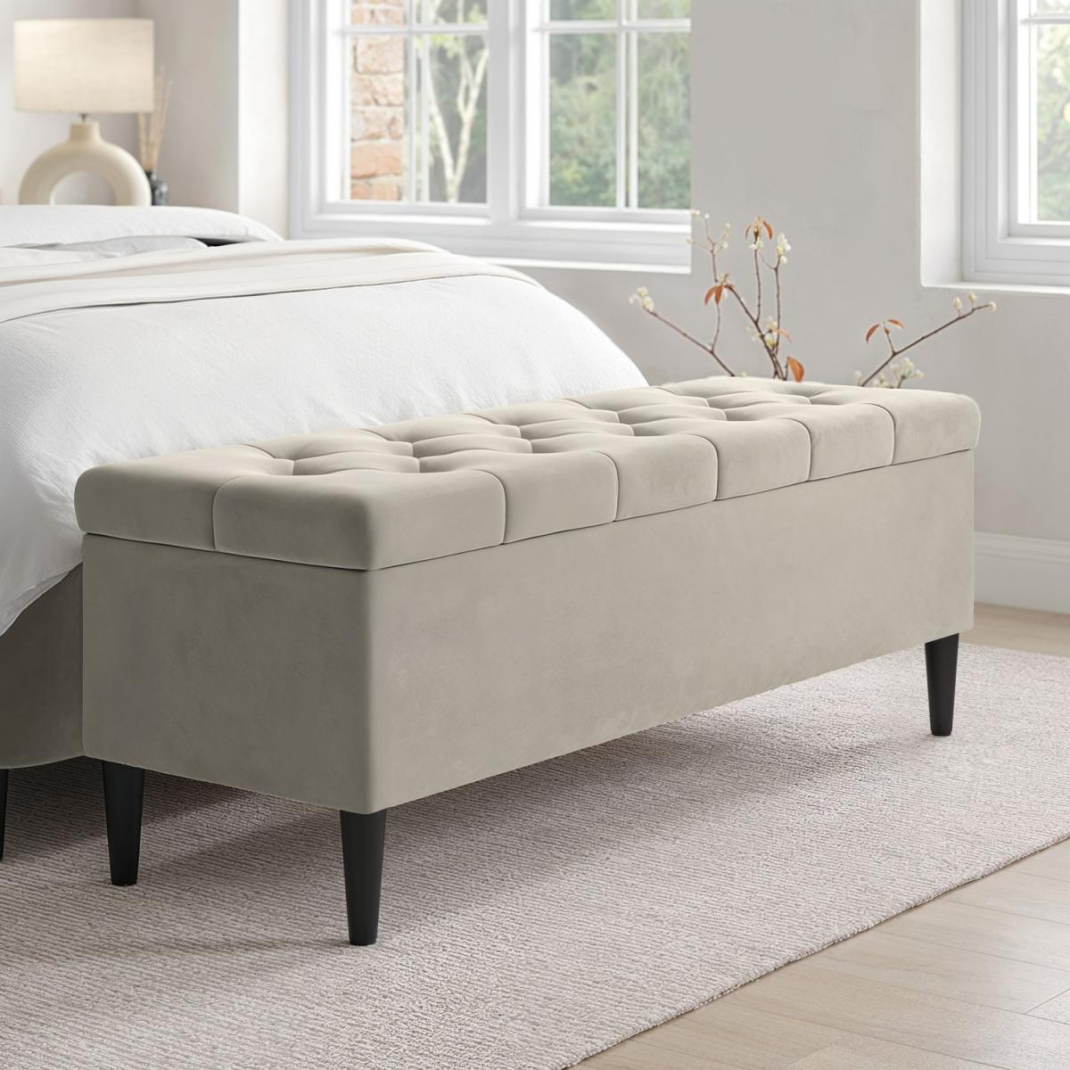 Adds a touch of sophistication to any bedroom, hallway, or living space with its classic design and deep-buttoned, cushioned top. Perfect for storing blankets, bedding, and throws while keeping your space tidy and clutter-free. Upholstered in a soft-touch beige velvet fabric, the cushioned top provides a plush surface for seating. Featuring black wooden legs for a sturdy base, it seamlessly blends modern and timeless aesthetics. Whether as a window seat, an end-of-bed storage unit, or extra seating in your home, it’s a practical and stylish addition to any room. Create an instant focal point in your bedroom with this Amara ottoman blanket box, with a modern, classic design. Store spare blankets, bedding, throws and more discreetly inside, then use the top to sit on or rest your feet. It would make a great window seat or perfectly placed at the end of your bed.