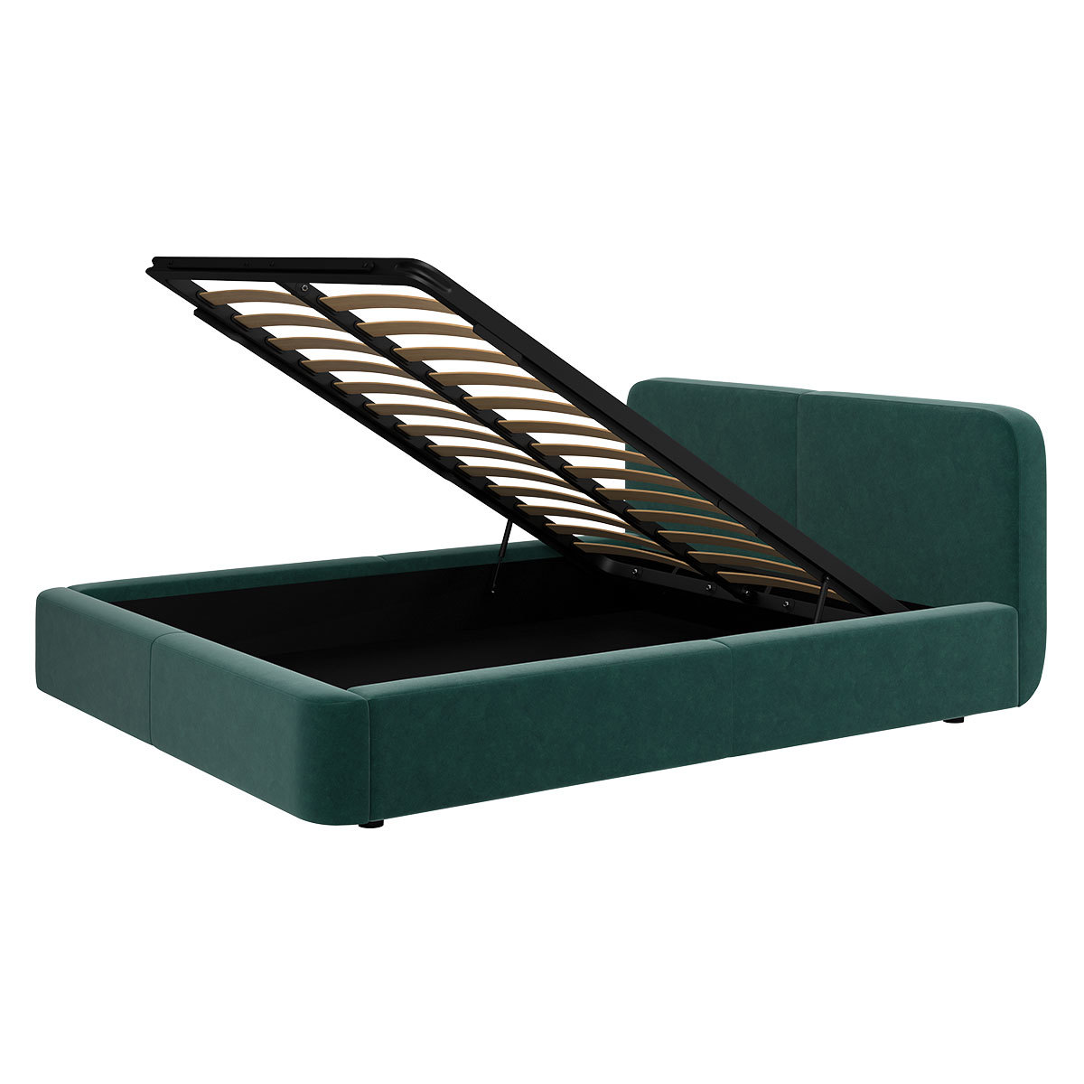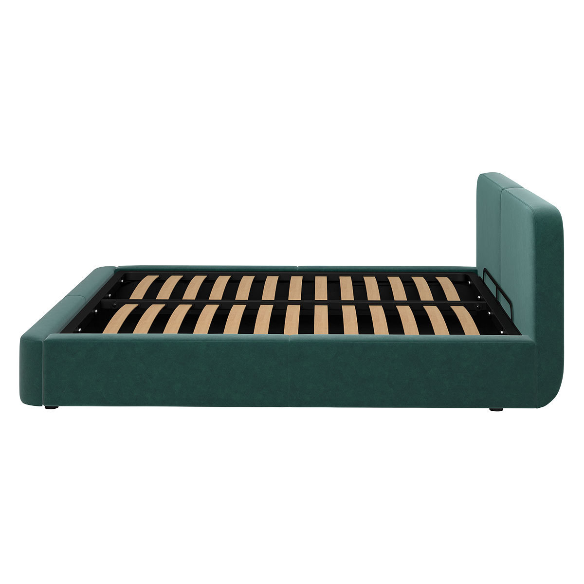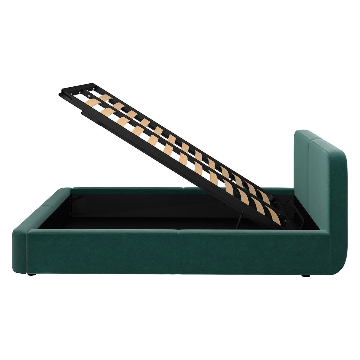 Quality and contemporary styled Ottori king bed is fully upholstered in luxurious emerald velvet fabric. Made in Italy, Ottori sleeping dimensions are slightly more generous and fit our european mattresses;The low platform bed features easy lift-up wooden slats revealing spacious storage beneath for bedding essentials. The smooth, soft curves and a deeply cushioned frame give the bed a clean lined look. Ottori is a EU continental size bed frame. Suitable for EU size mattress, sleeping dimensions W160 x L200cm. Part of the Ottori bed range, available in various colours in leather and wool, with and without storage option.
