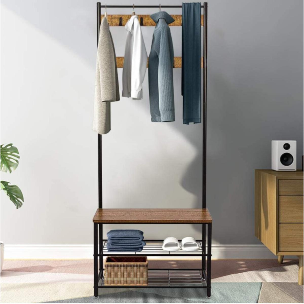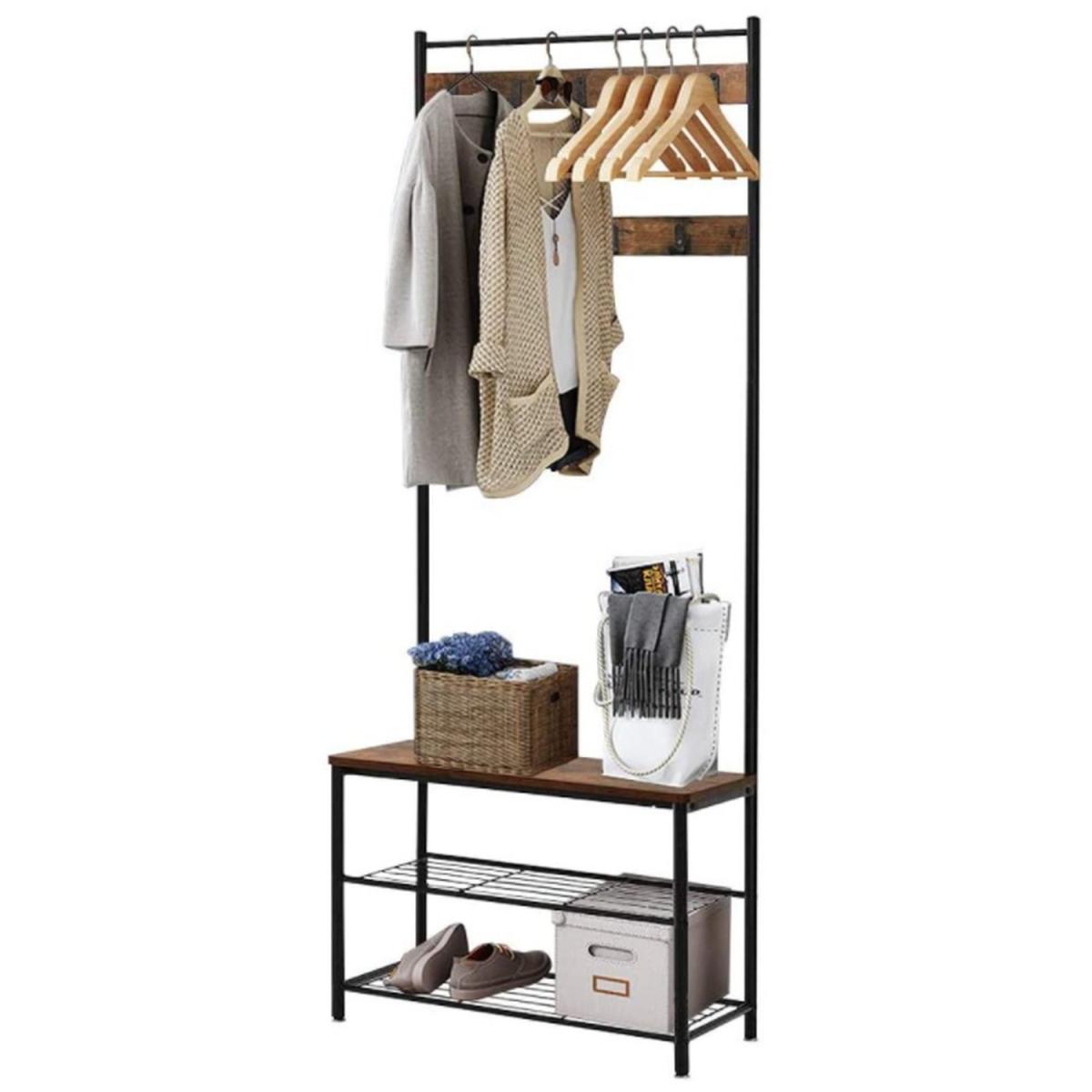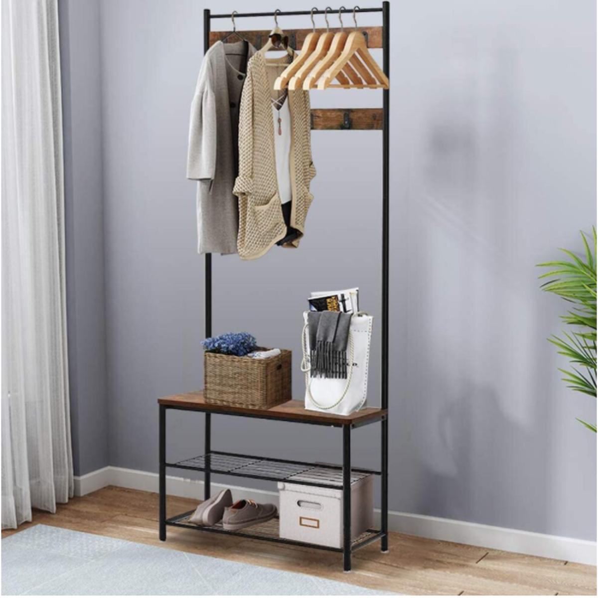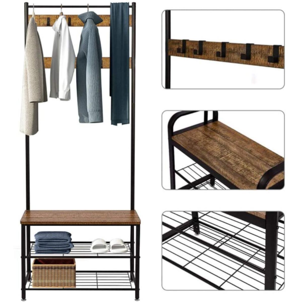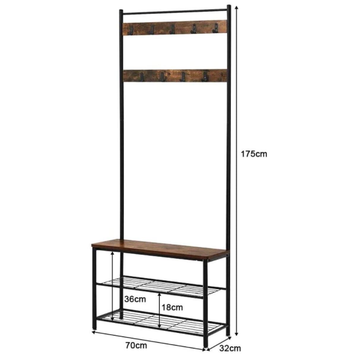 This coat rack helps you keep your entryway neatly organized while giving a unique and elegant look. you can hang your coat, hat and scarves on the 9 available double hooks, and sit on the bench to take off your shoes and put them on the shelves metal storage. It has 4 adjustable feet, this wardrobe is stable on carpet or even on a slightly uneven floor. Made of metal tubes and chipboard of class E1, this entryway furniture in industrial design style is rigid. The shoe bench is capable of supporting a weight of 176 Ibs, you can sit there take off/on your shoes.