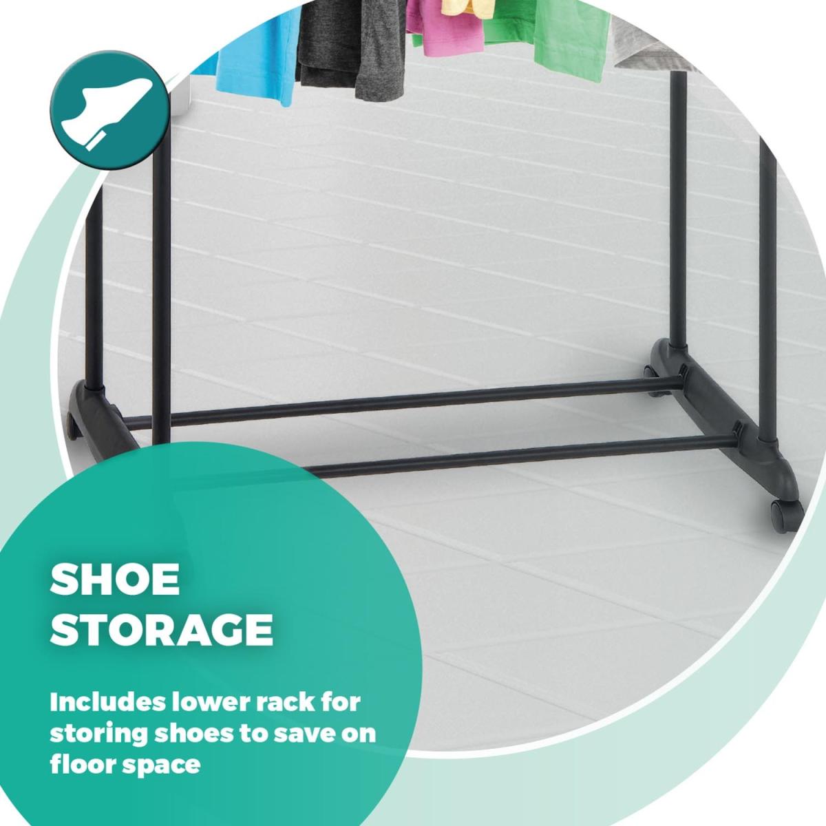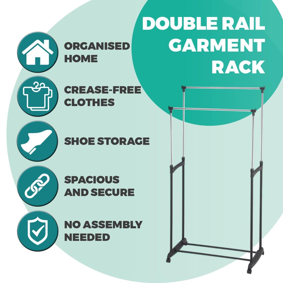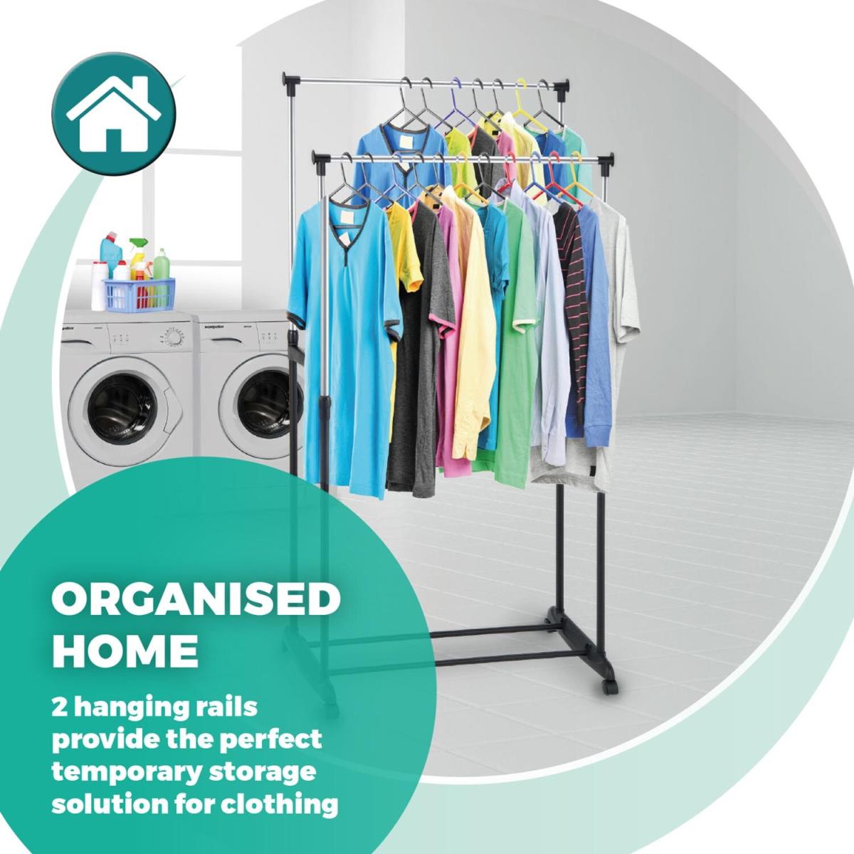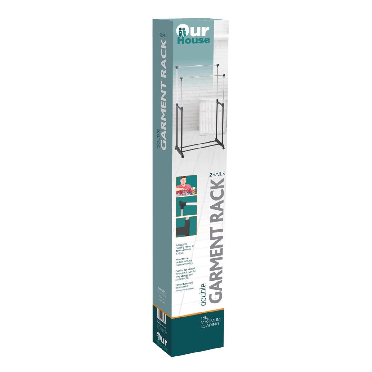 Hang your clothes where you can see them with this Our House Double Rail Garment Rack. This double clothes rail ensures maximised capacity for hanging your clothes, along with easy access to them all. Perfect for hanging shirts, dresses, and newly-ironed garments, this rail is convenient and easily moveable. As well as enjoying your crease-free clothes, you can also make the most of the shoe storage along the bottom, for additional organisation.