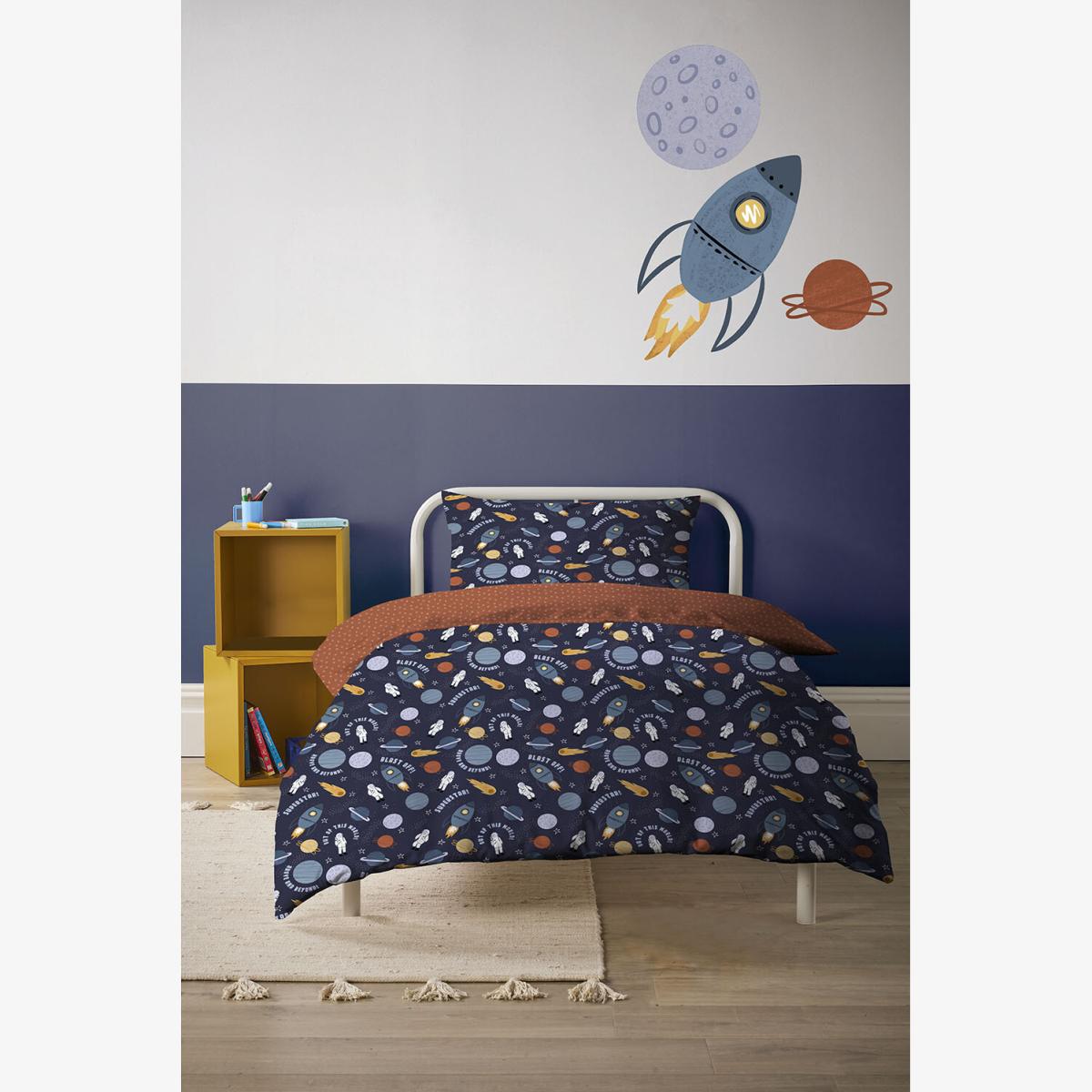 I love this bed set for adding a fun, youthful vibe to a child's or teenager's room. The dark blue background paired with playful rocket and planet prints makes it perfect for a space-themed bedroom, especially in contemporary or eclectic interiors. It works well with both bright accessories to create a lively look or more muted tones for a relaxed feel. A practical tip is to keep the rest of the décor minimal-perhaps a few space-themed accessories or colourful cushions-to let the print really stand out. Pairing it with plain, neutral bedding or a contrasting throw can also help refresh the look easily as styles evolve.