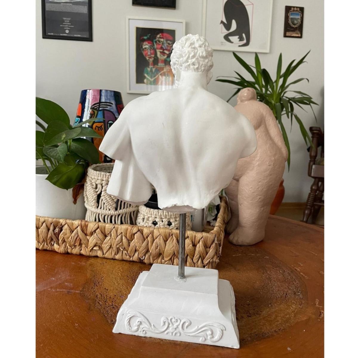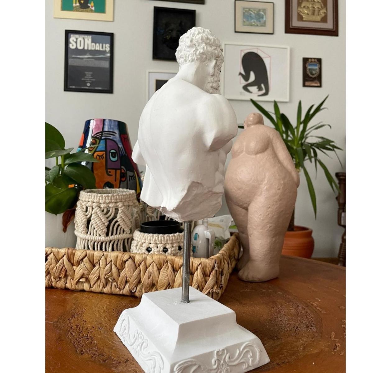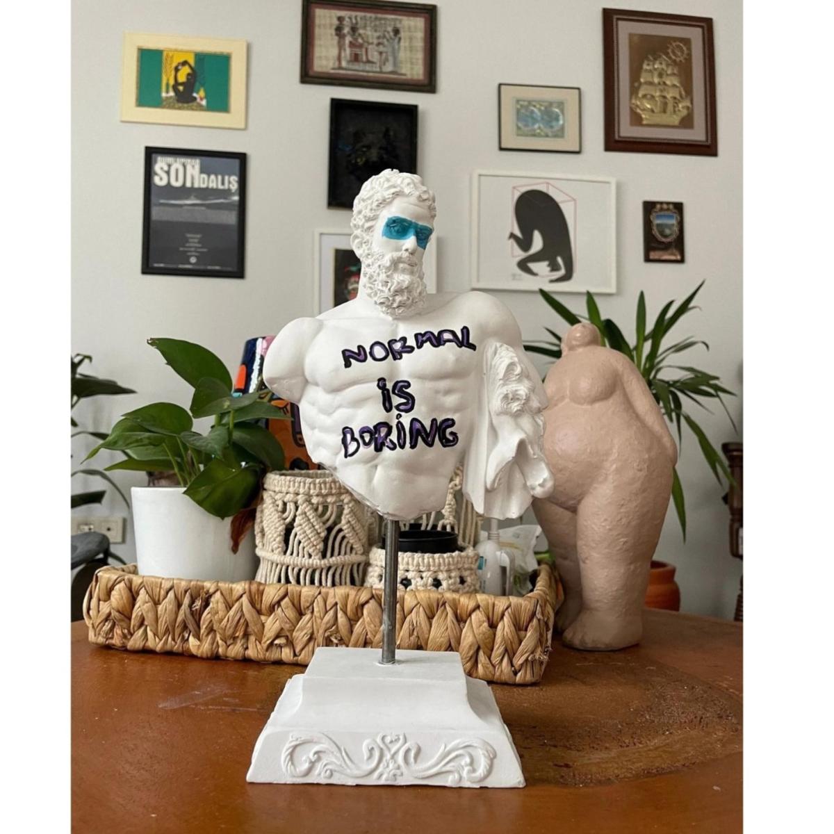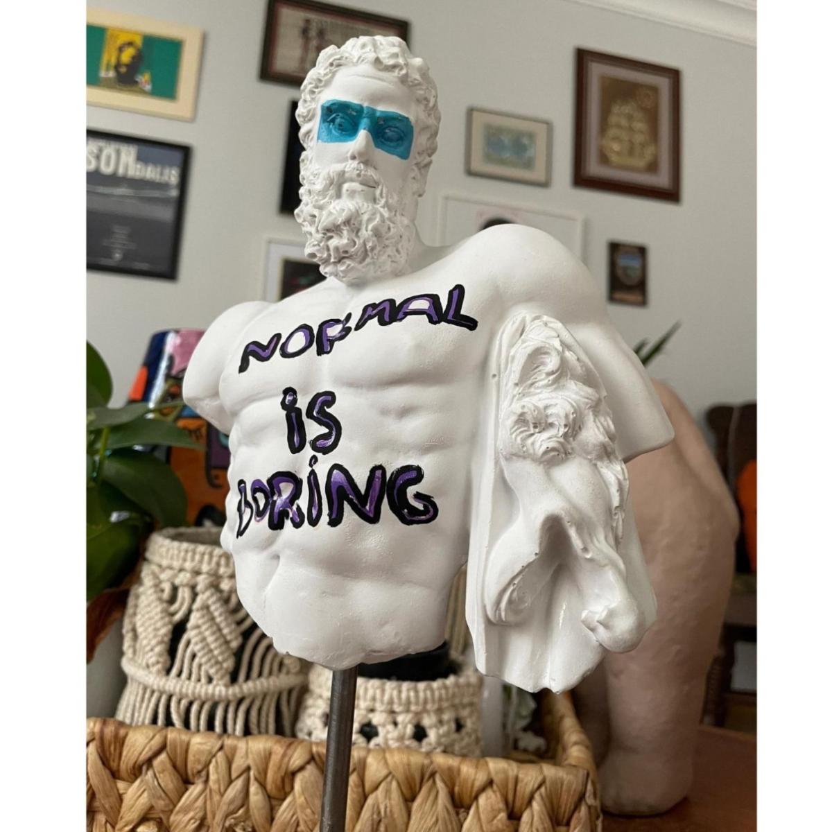 Out The Box God a striking 35 x 15 cm sculpture that blends classical heroism with a modern twist. This piece captures the powerful figure of Hercules, with his chest rendered in muted, conventional tones to represent the ordinary, while his eyes burst with vivid blue paint, symbolizing untamed energy and emotion. The contrast between the two elements creates a thought-provoking piece that challenges tradition and invites new interpretations of strength and vulnerability.
