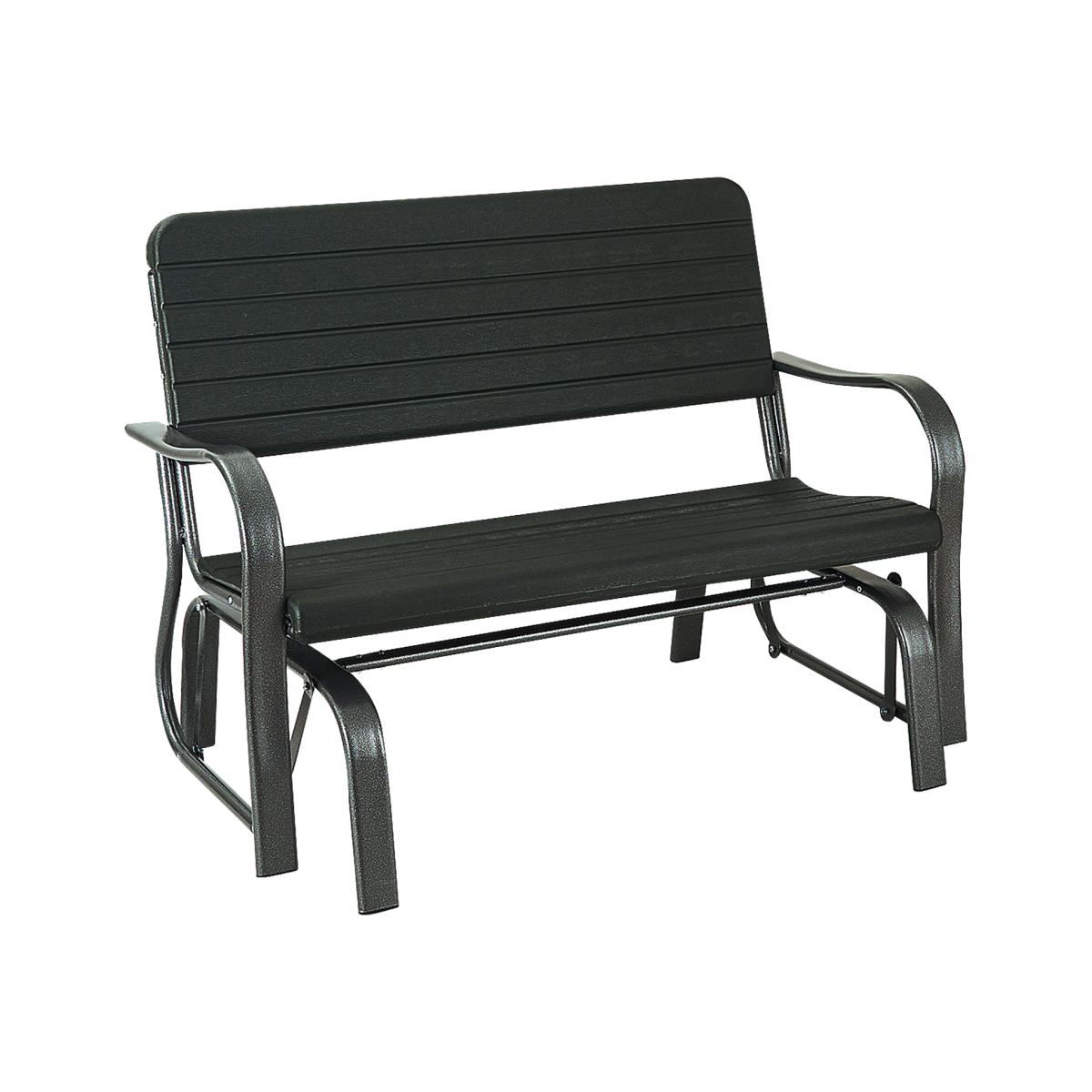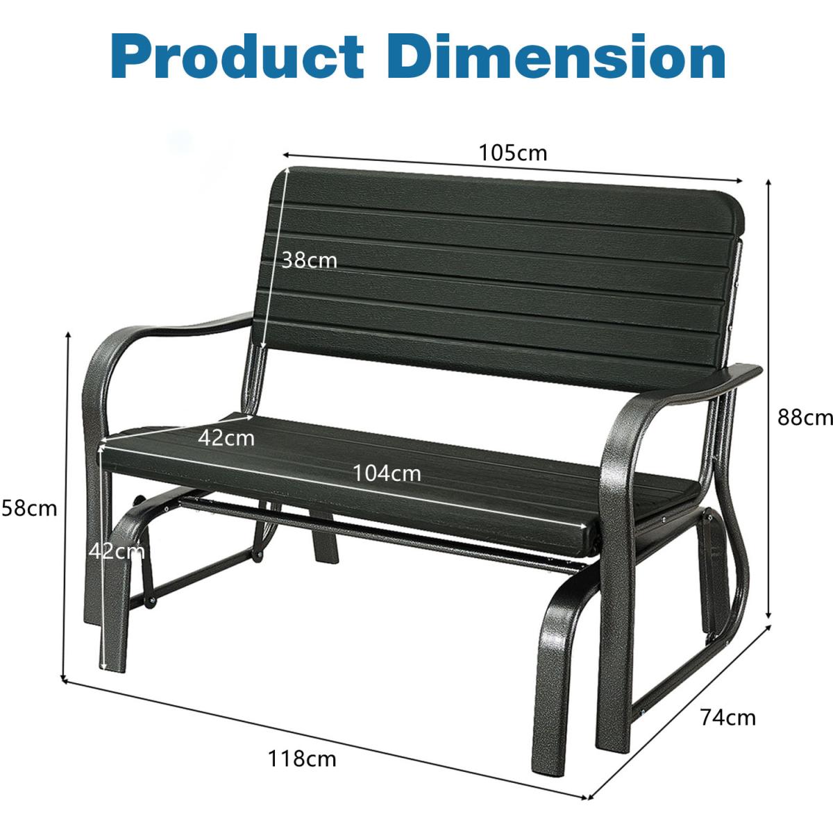 Enjoy relaxing moments with your beloved one with this outdoor 2-person glider bench!Made of all-weather HDPE material, this outdoor glider bench is built to last. Moreover, the rustproof steel frame with power coated supports the whole bench firmly. What's more, the high back, large sitting area, ergonomic backrest and curved armrests are designed for a comfortable sitting experience. The 2-person rocking chair is smooth and quiet as for rocking, letting you sit on it cozily. Furthermore, the specific user's manual helps to assemble and the smooth surface is easy to clean.