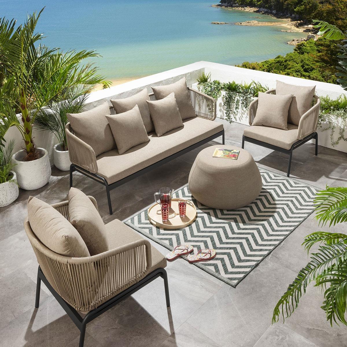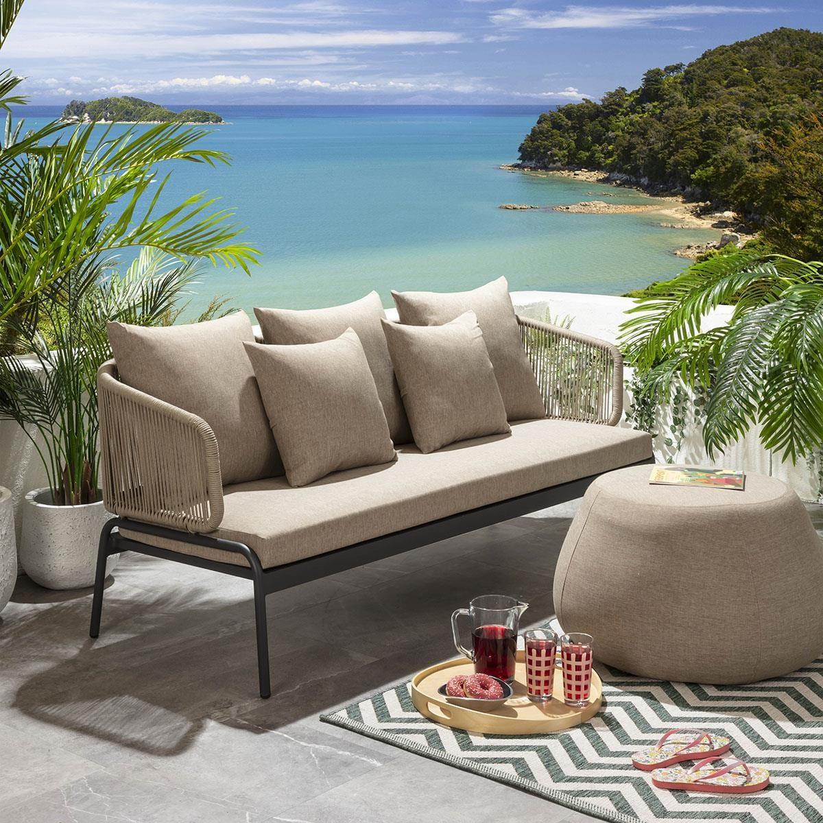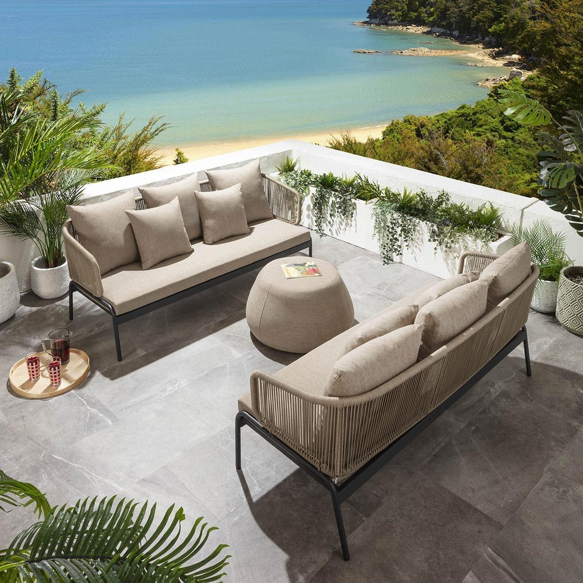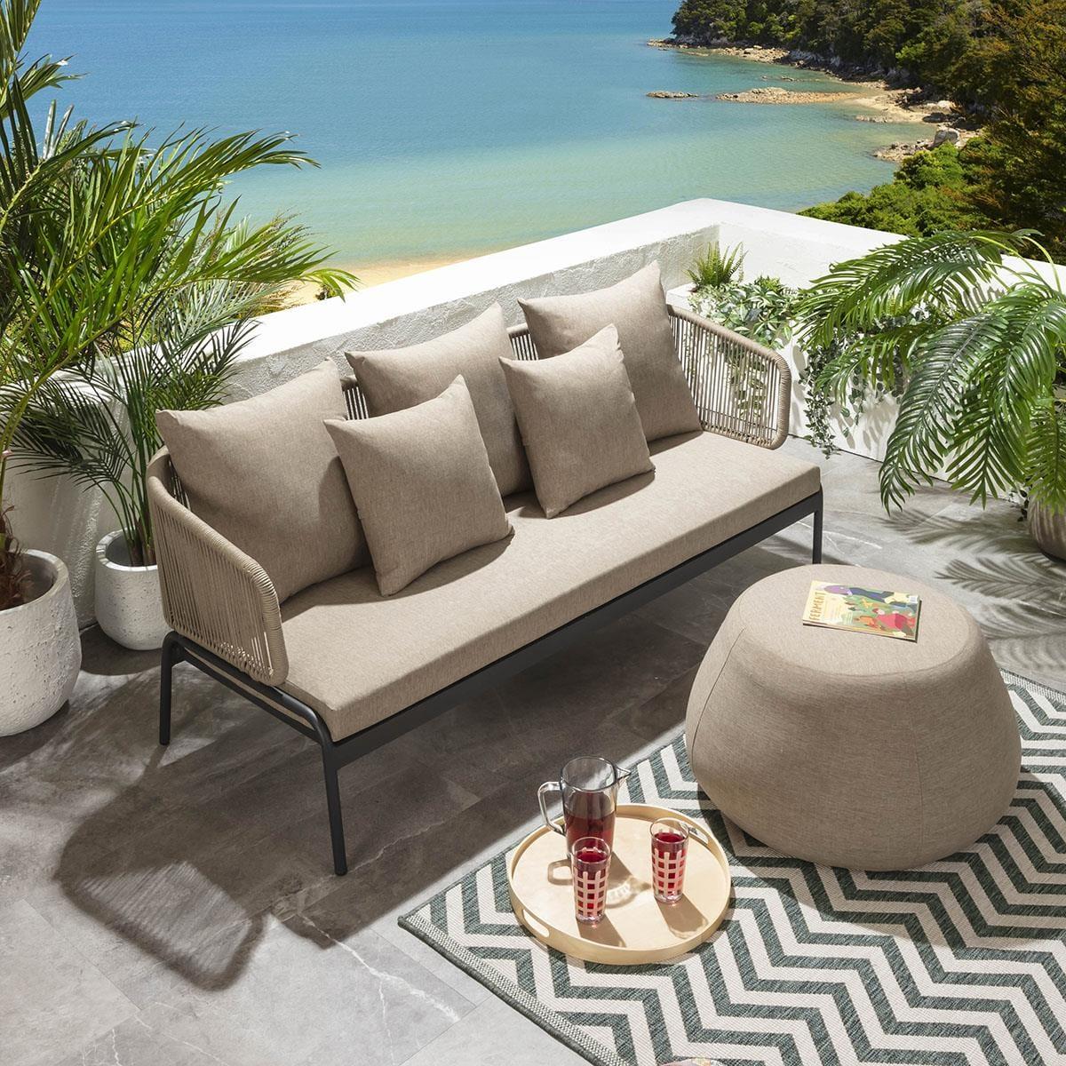 The Jasmine outdoor sofa, crafted with a premium grey-painted aluminium frame, features a high back and sides adorned with an intricate thin beige rope weave for added support. This metal garden sofa boasts cushions covered in luxury beige durable outdoor fabric, effortlessly combining durability and style. The full aluminium frames of the Jasmine outdoor sofa are finished in a premium grey paint, ensuring long-lasting durability and a sleek aesthetic. The intricate beige rope weave on the back and sides not only adds visual interest but also provides additional support for your comfort. Sink into the lap of luxury with the cushions of our aluminium sofa set, crafted with high-quality foam and upholstered in durable beige outdoor fabric. Designed for both style and comfort, these plush cushions provide the perfect balance of support and relaxation. The sophisticated colour palette of grey and beige seamlessly integrates into any outdoor decor. To maintain the pristine appearance and longevity of your garden sofa, we recommend storing the cushions when not in use. Included weather covers offer additional protection, shielding the full aluminium frames and cushions from the elements. W180cm D72cm H75cm Seat Height 39cm Available with matching armchair