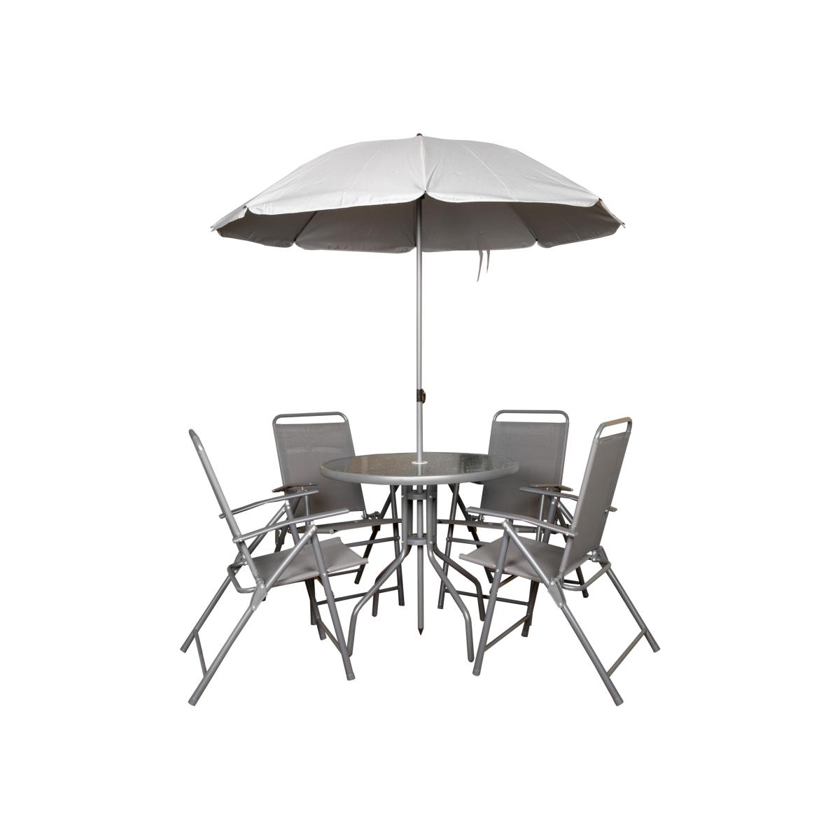 Elevate your outdoor space with this stylish 4-seater Samuel Alexander garden patio furniture set in grey. Having a patio furniture set extends your living space allowing you to enjoy being outside and transform your garden or patio into a relaxing retreat. This sleek and contemporary set is sure to compliment any garden setting making this set perfect for dining on or enjoying drinks in the summer sun with family and friends. This modern set will become the focal point of your patio, garden or terrace area and features a tempered glass table top with 4 sturdy legs made from steel and comes complete with 4 multi-position, folding grey textilene chairs and a matching grey parasol. A 5cm parasol hole in the centre of the table allows you to enjoy the patio set with the benefit of shade. Please note a parasol base is not included with the set. The set is supplied flat-packed and self-assembly is required with instructions included.