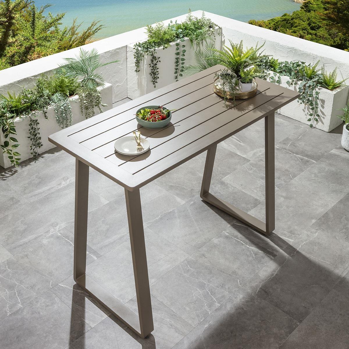 This 6 seater garden bar set includes a rust-resistant aluminium bar table in an elegant beige powder-coated finish, with green rope-back bar stools, featuring a back cushion for an extra layer of luxury comfort. This outdoor bar table set is crafted for durability and comfort. Elevate your garden set with the modern outdoor bar table. Crafted from rust-resistant aluminium, it features a 150cm x 70cm slatted top and an elegant beige powder-coated finish. With a curved leg design, this tall outdoor table is perfect for hosting drinks all year round. A protective cover is included to keep it clean. Reinvent your outdoor space with these 6 fabulous all-weather olive green rope-back garden bar stools. The generously padded outdoor chairs in this bar set are enhanced by a supportive back cushion for an extra layer of luxurious comfort. Our gorgeous rope back outdoor bar stools will make a stunning addition to your outdoor seating area or patio. This 6 seater high bar set combines modern Cole bar chairs with the stunning Freddy table. Whether you love the Cole chairs and would like to purchase them individually, or you think the Freddy table would complete your outdoor bar area better with another stool, you can easily mix and match our garden tables and chairs to curate something truly unique. Table Size W150cm D70cm H110cm Bar Stool Size W57cm D57cm H115cm Modern Garden Bar Set for 6
