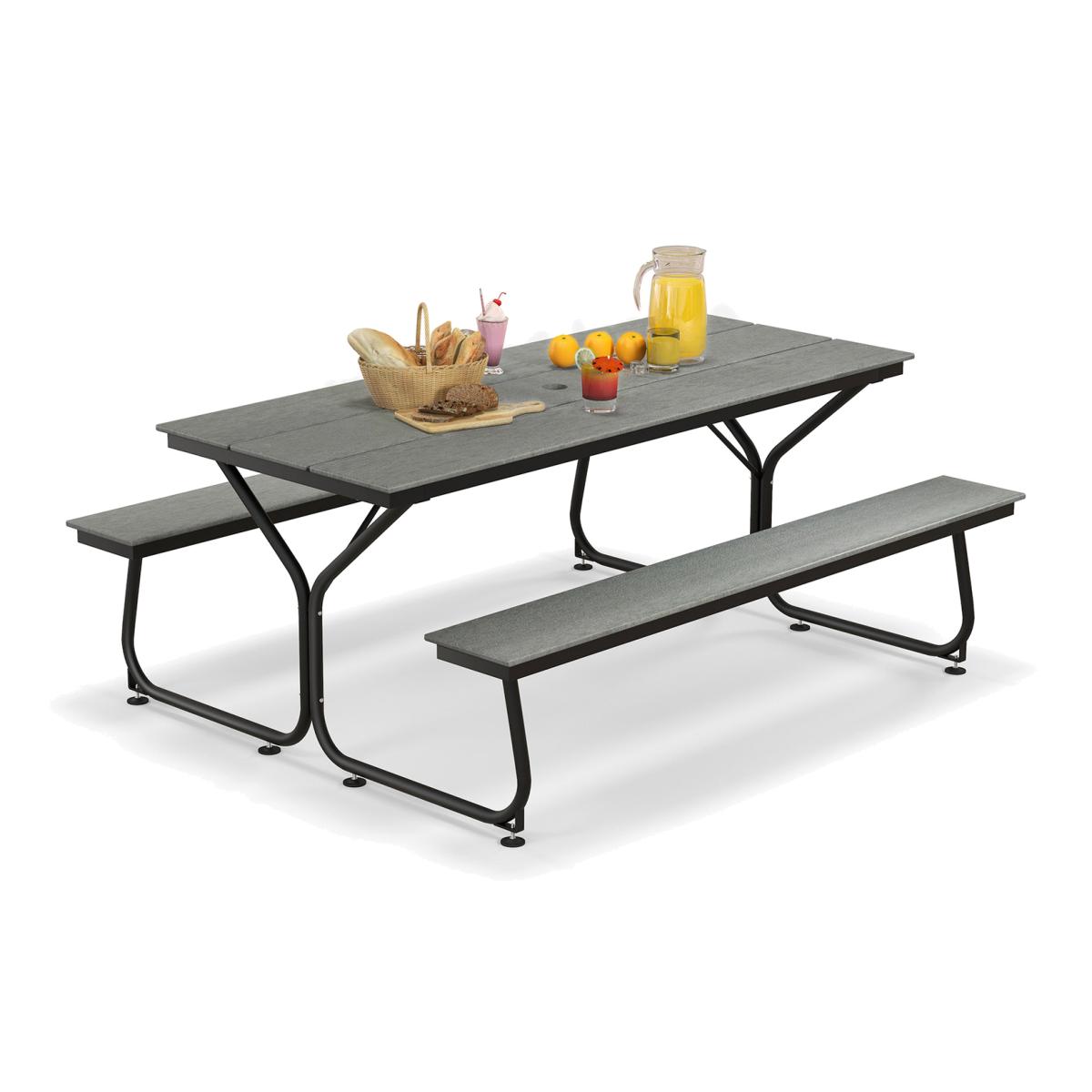 Our outdoor picnic table set is coming with a large picnic table and 2 benches. Our HDPE tabletop is dirt-resistant, waterproof, and sun-protection, lasting for years to come. More than that, the heavy-duty metal frame is constructed of 4 cm thickened metal tubes and adopts reinforced connections, ensuring good sturdiness. In addition, the dining table is designed with a built-in umbrella hole (diameter: 5.8 cm), bringing convenience for inserting an outdoor umbrella and enjoying a shady outdoor area.