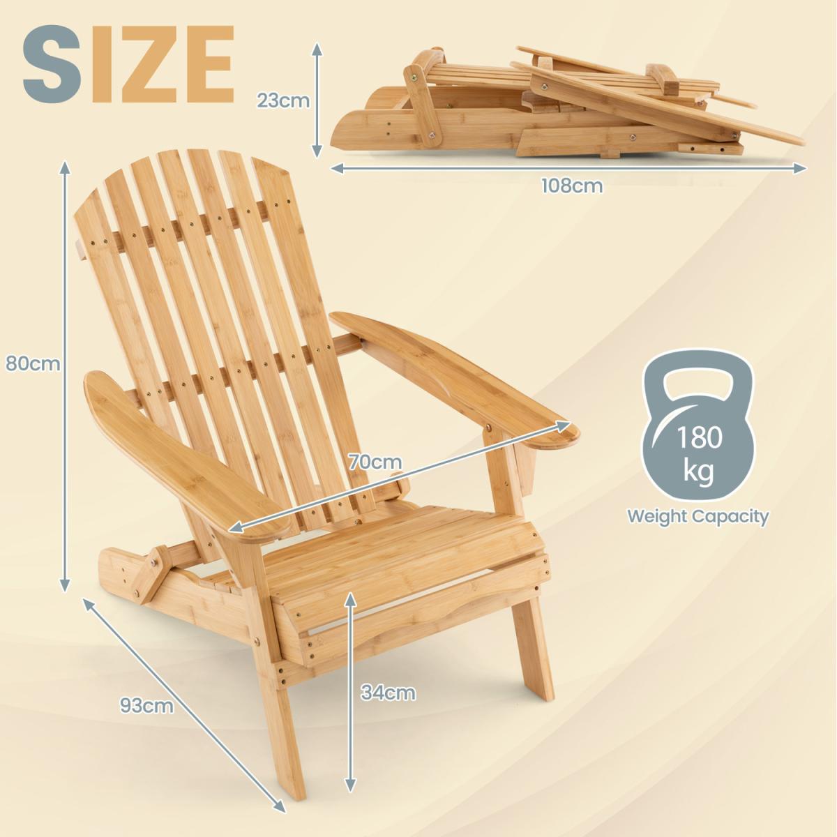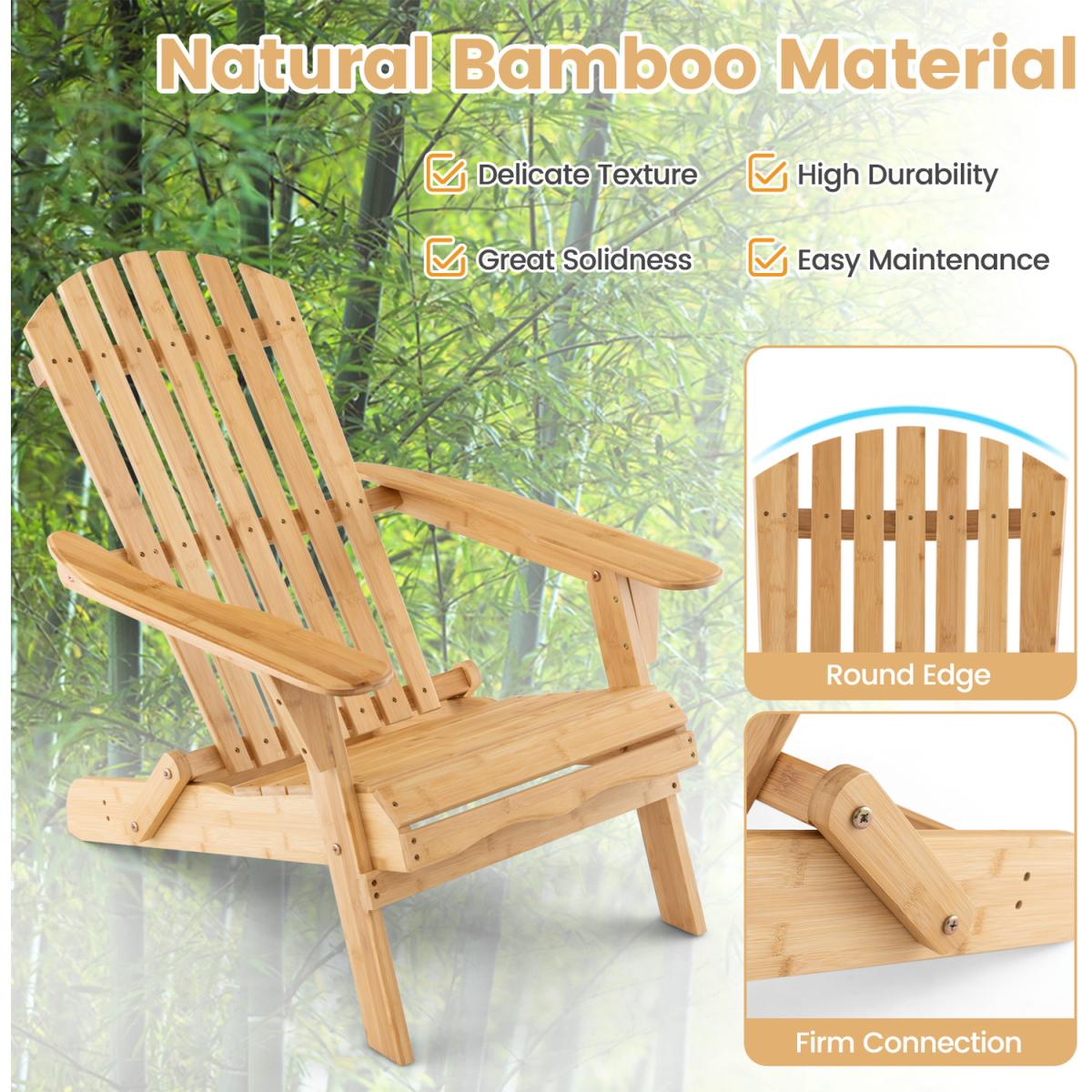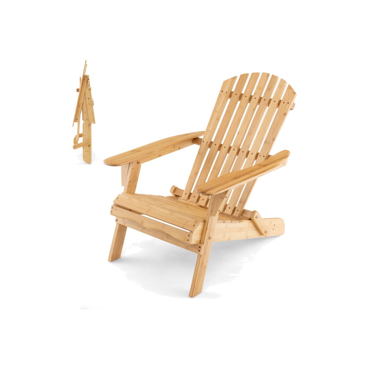 This high-quality and well-designed bamboo Adirondack chair will be a perfect addition to outdoor places. The chair is designed with wide seat and appropriate angle for optimal comfort. And the high backrest makes you more relaxed. Moreover, the whole chair is made of top-grade bamboo with reinforced metal screws for long service life and high stability. When finishing using, you can fold the chair quickly, and store it into any corner you want. If you are looking for a comfortable and wide chair for backyard, poolside and so on, this bamboo Adirondack chair will be a nice choice.