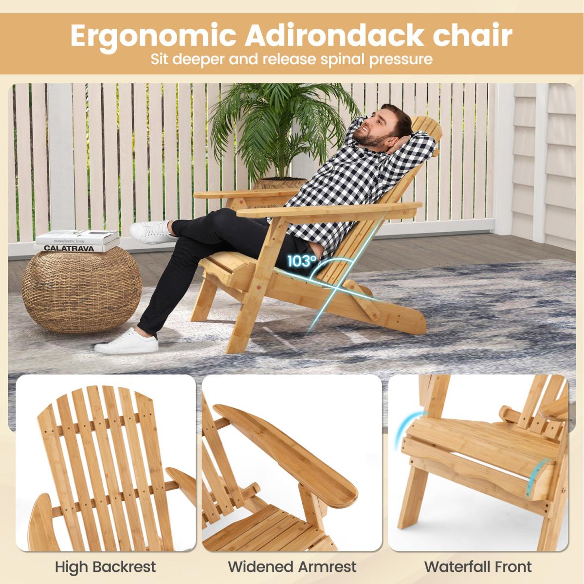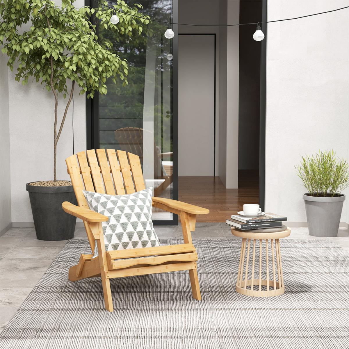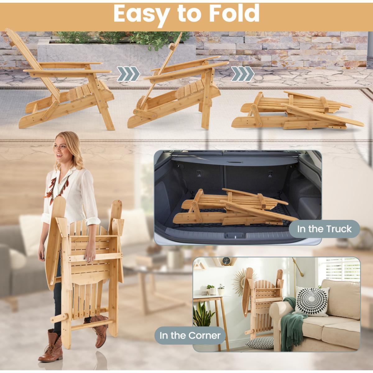 This high-quality and well-designed bamboo Adirondack chair will be a perfect addition to outdoor places. The chair is designed with wide seat and appropriate angle for optimal comfort. And the high backrest makes you more relaxed. Moreover, the whole chair is made of top-grade bamboo with reinforced metal screws for long service life and high stability. When finishing using, you can fold the chair quickly, and store it into any corner you want. If you are looking for a comfortable and wide chair for backyard, poolside and so on, this bamboo Adirondack chair will be a nice choice.
