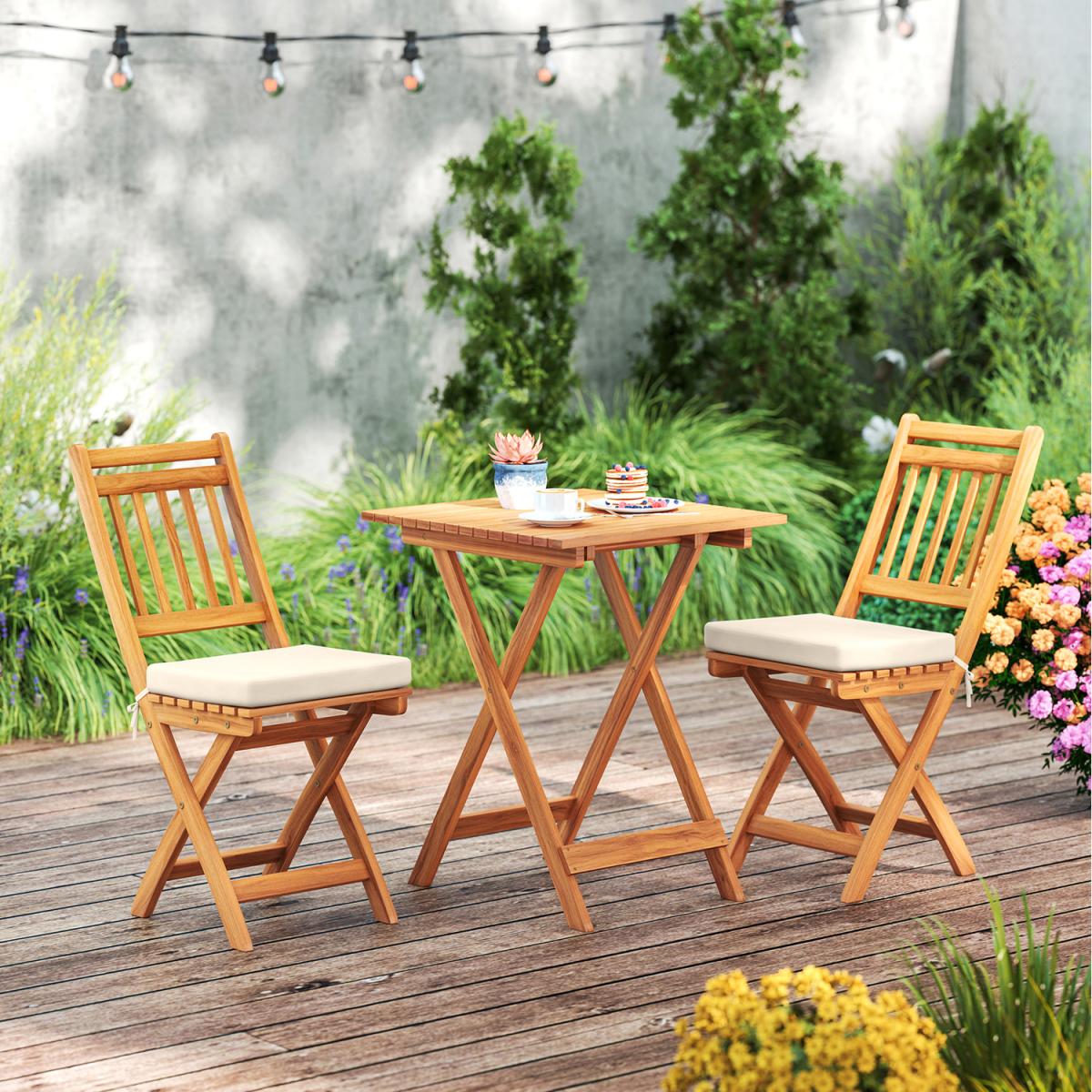 Elevate your outdoor living space with this exquisite acacia wood bistro set, designed for both style and functionality. Crafted from high-quality acacia wood known for its crack resistance and durability, the wood patio set includes a sturdy table and 2 high-back chairs, both featuring a convenient folding design for easy storage. The chairs are outfitted with cozy, zippered seat cushions that stay in place with fixing ties, ensuring ultimate comfort and ease of maintenance. With reinforced X-shaped structure, each chair can load up to 180kg, and the table can load 75kg.