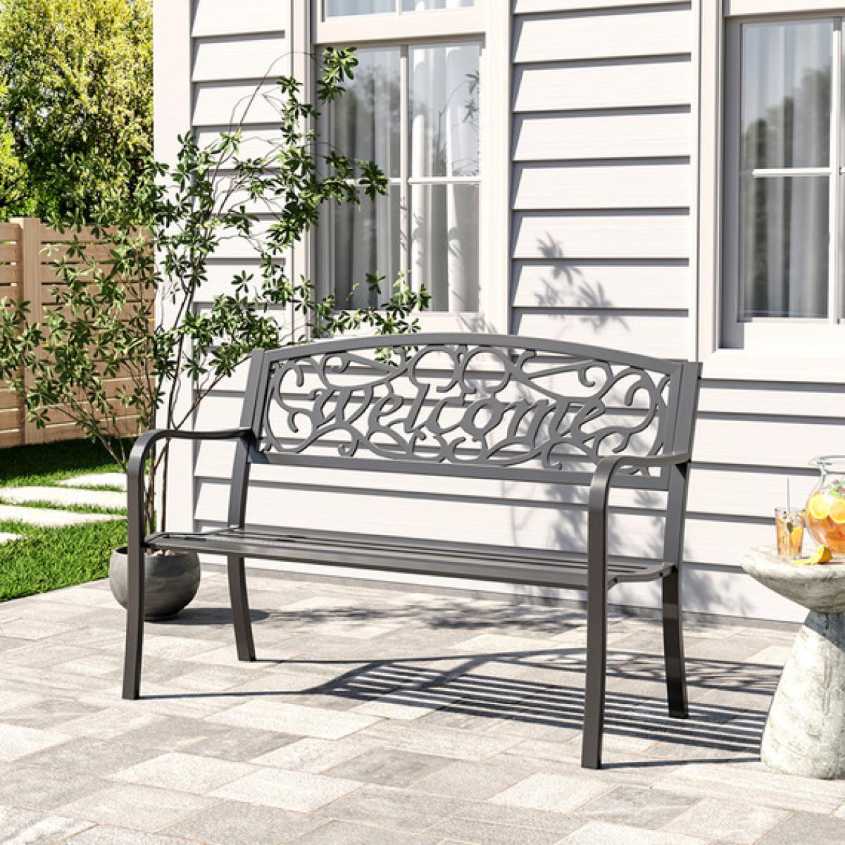 Outdoor Cast Iron Garden Bench With Cirrus Letter Pattern Long Chair - Black