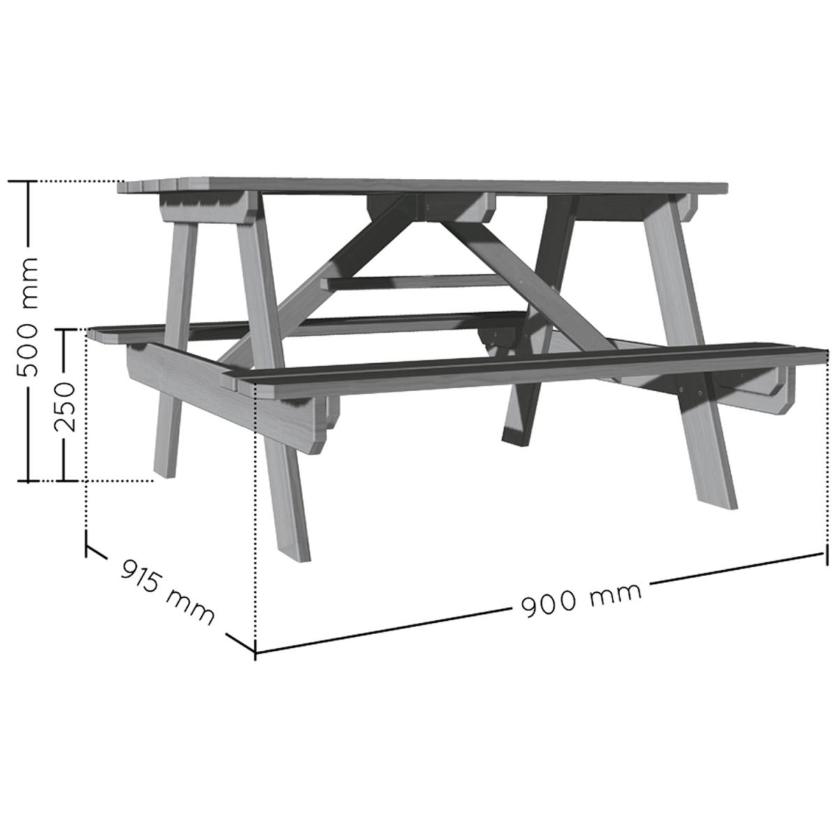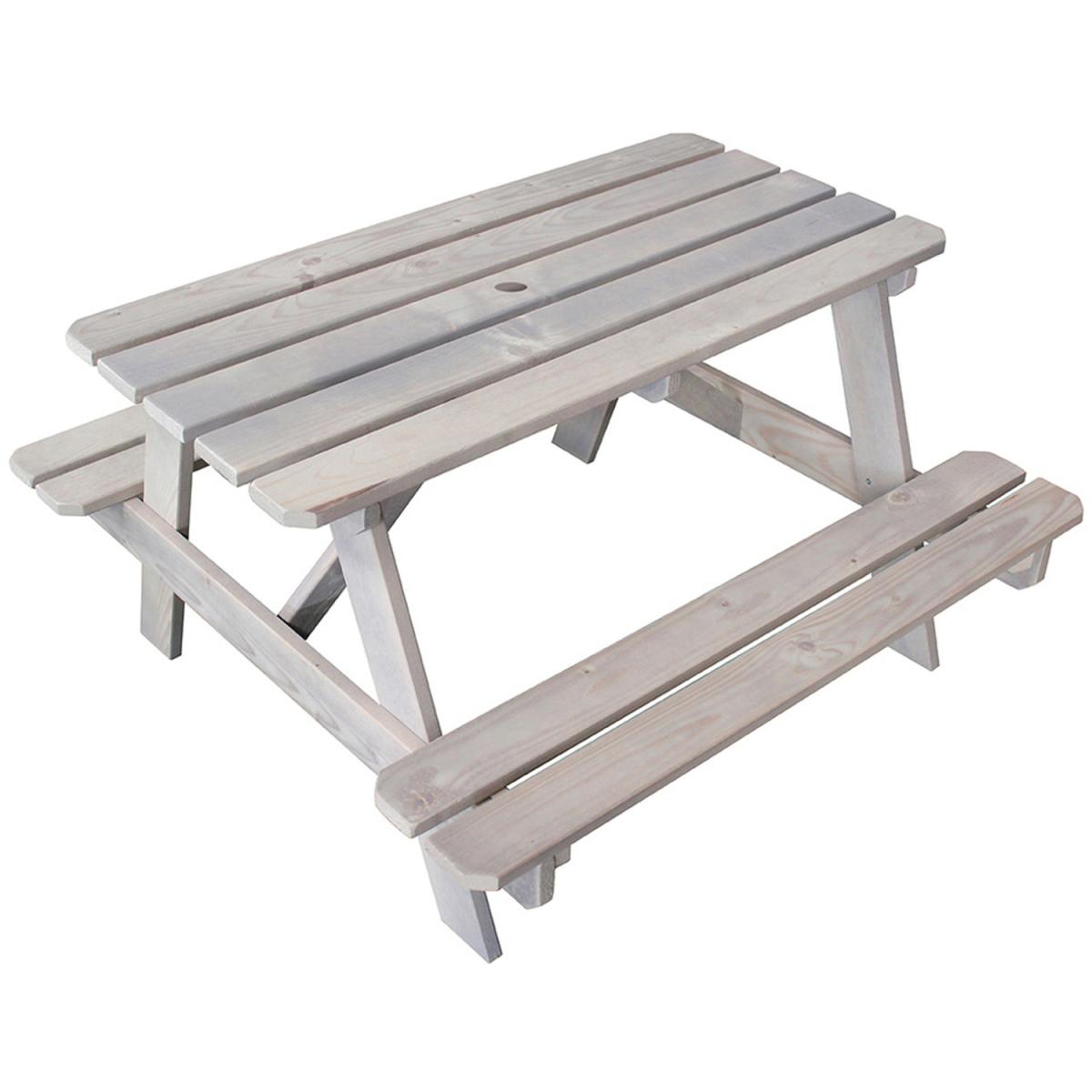 Childrens Picnic Table With 2 benches and a hole for a parasol This model can accommodate up to 4 children! Suitable for children from 3 to 7 years old Easy Self Assembly Childrens Picnic Table Transform your garden with this wooden picnic table that is much more than just a place to eat Perfect for drawing and playing, children from 3 to 7 will love entertaining friends on its comfortable benches. The subtle taupe grey stain adds an air of sophistication, making it the perfect stylish addition to any outdoor space. Plus, the built in parasol holder helps keep everyone cool on hot days spent outside enjoying natures beauty. More Information Childrens Picnic Table Width 92cm Depth 90cm Height 50cm Height of benches 25cm Colour Grey Weight 8.63kg Capacity 4 Kids