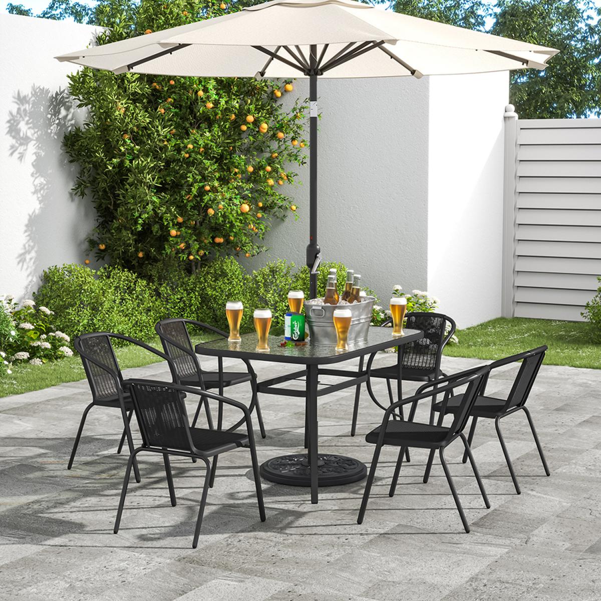 I’d call this simply the black bistro set, and I love its clean, powder-coated steel frame for low-maintenance outdoor living. At 120cm across and seating six, it slots easily into contemporary patios, urban balconies or even a modern farmhouse garden without feeling bulky. To style it, layer a neutral outdoor rug underneath, add weather-resistant seat cushions in muted tones and drop in a slim vase or lantern centrepiece for instant ambience. Because the chairs are lightweight you can shuffle them round for drinks or meals, and the table’s central parasol hole means you can introduce shade and pattern without cluttering the tabletop.