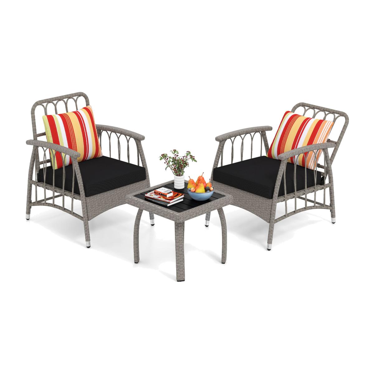 Create a charming focal point while inviting you to relax and unwind with our 3-piece patio furniture set. Crafted with durability in mind, this patio set features fade-resistant, sun-protective PE rattan and a sturdy galvanized metal construction that supports up to 160 kg per chair and 40 kg for the coffee table. Moreover, this patio table and chairs set allow you to adjust the recline with a 5-level adjustable backrest and relax on soft cushions filled with high-density sponges, encased in removable covers for easy cleaning.