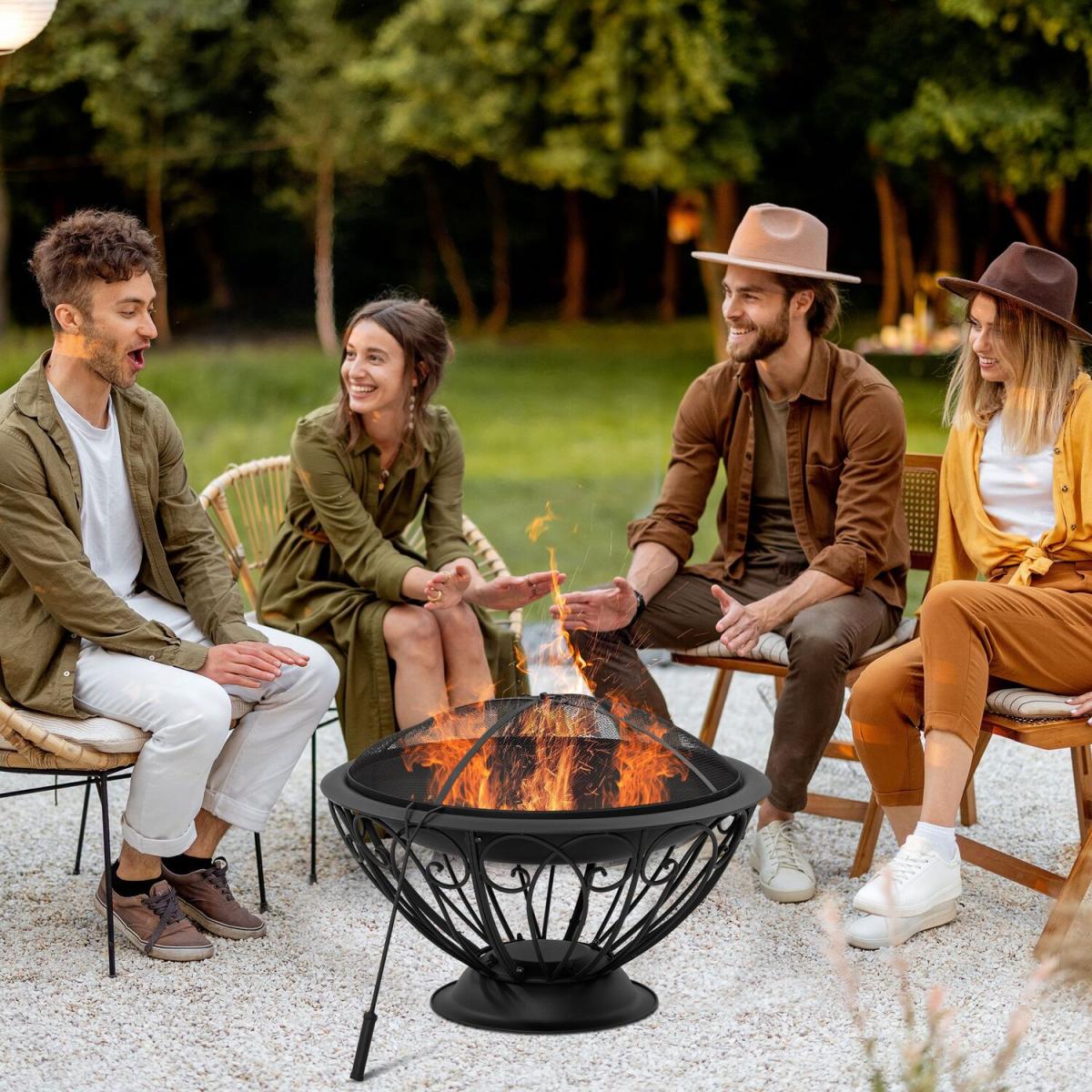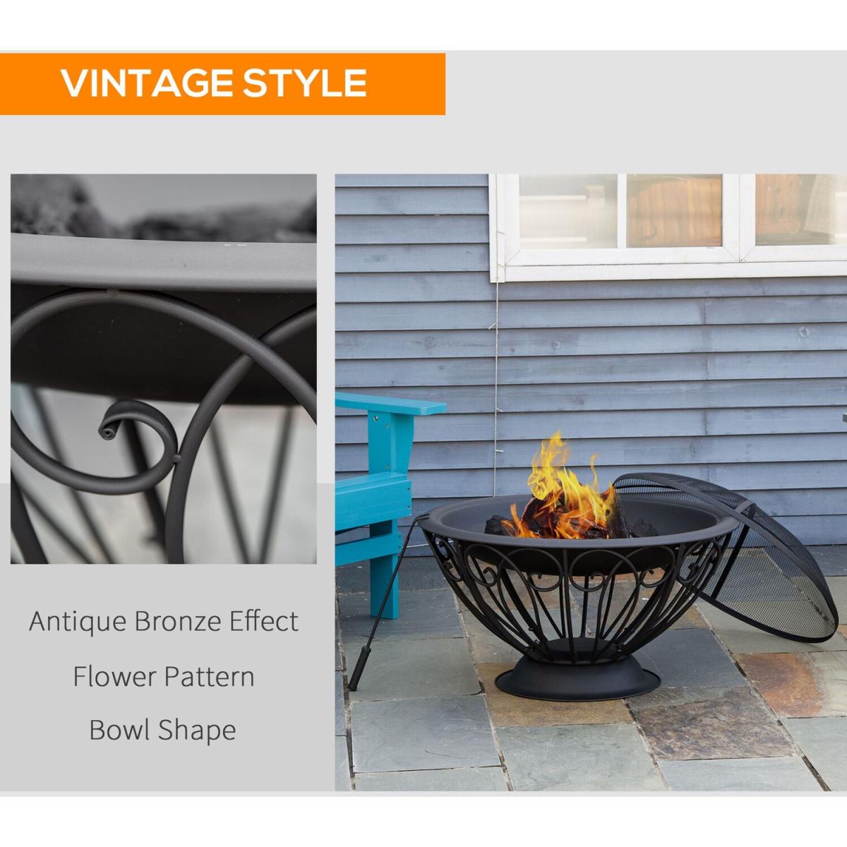 Creating warmth outdoors during cooler evenings with ease - this fire pit from Outsunny. The bowl shape, covering in an antique bronze effect and featuring scrolling on the sides creates a pretty look. The mesh cover helps prevent sparks flying out so you don't get accidently burnt. Made from metal, this firepit is strong and durable and can withstand up of 500degree. An outdoor fireplace perfect for Spring and Autumn evenings.