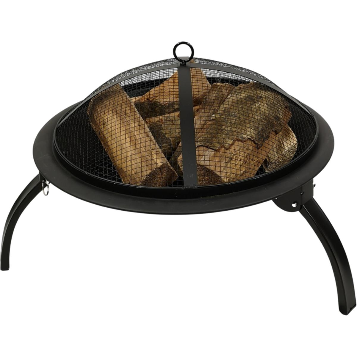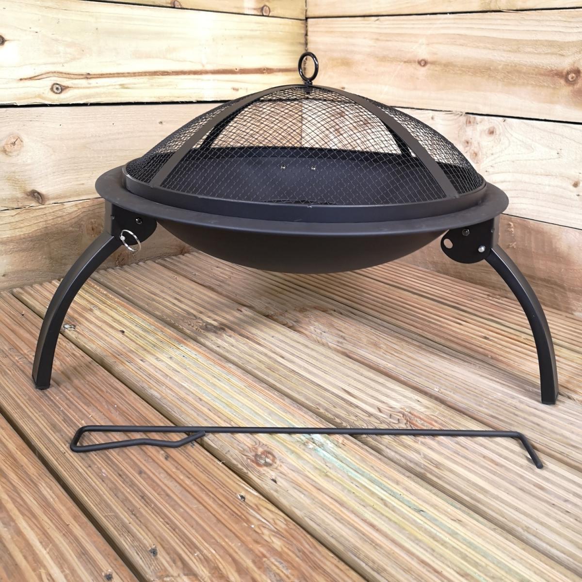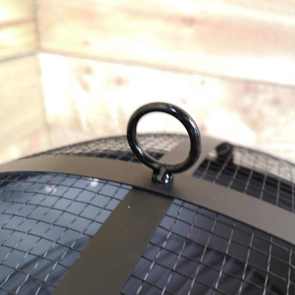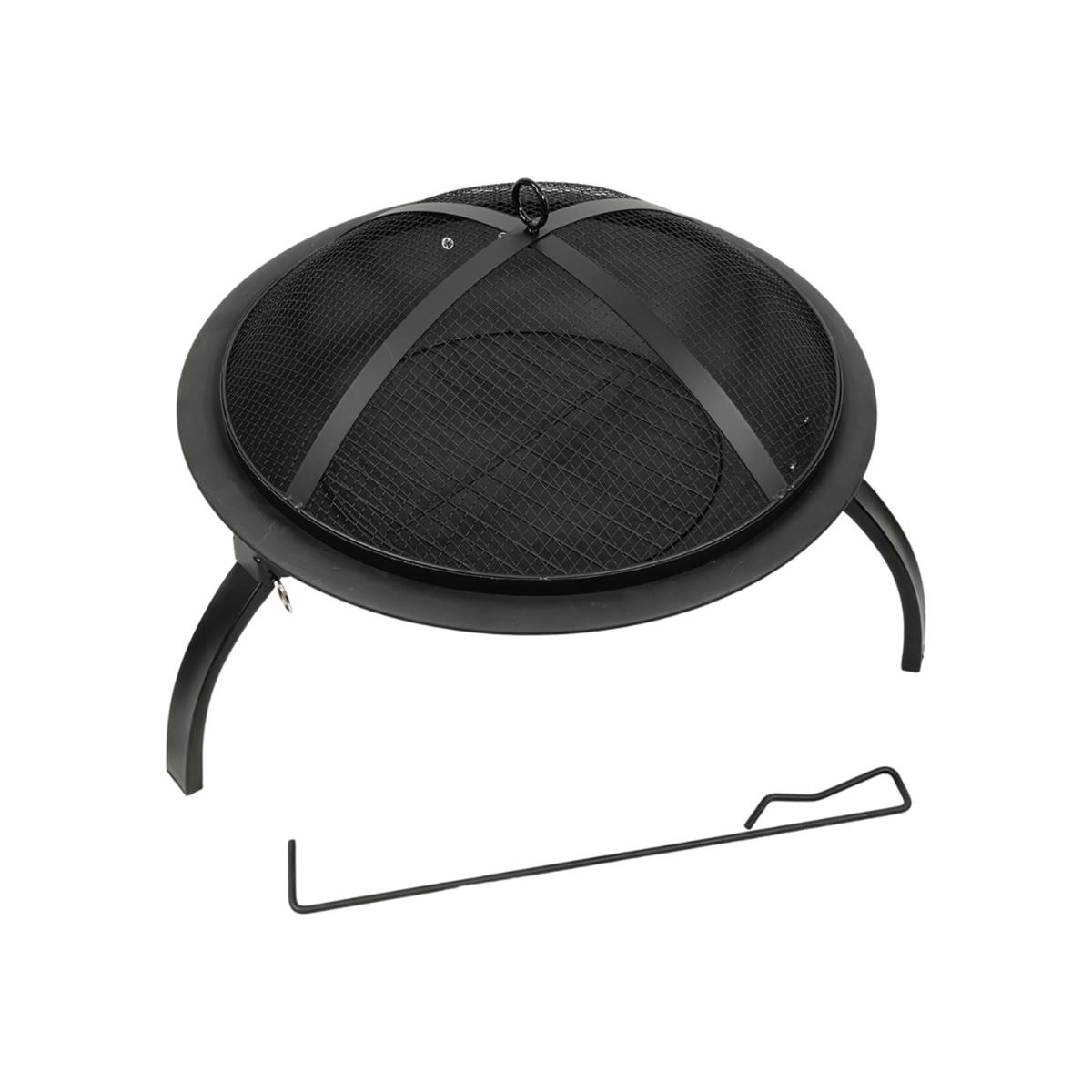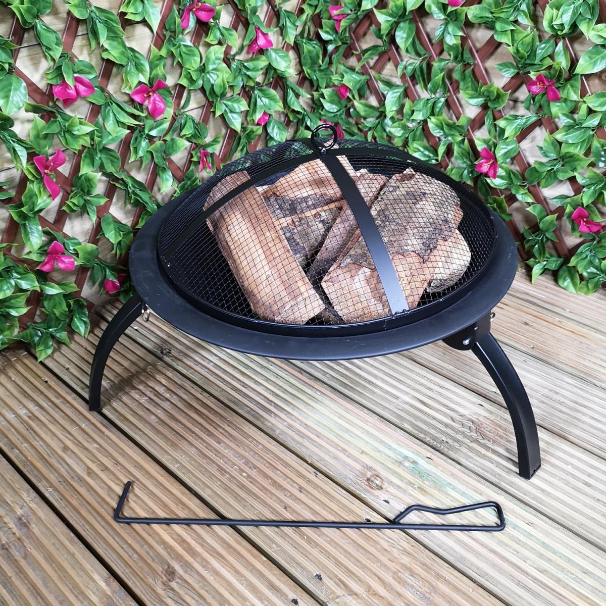 Outdoor garden patio firepit heater. This fire pit is suitable for small logs to provide a source of warmth and light. This black metal Fire Pit also comes with a handy mesh safety guard lid, and a metal hook to remove the lid when it's hot. Steel construction with mesh lid fireguard.