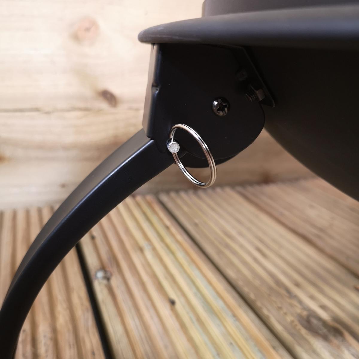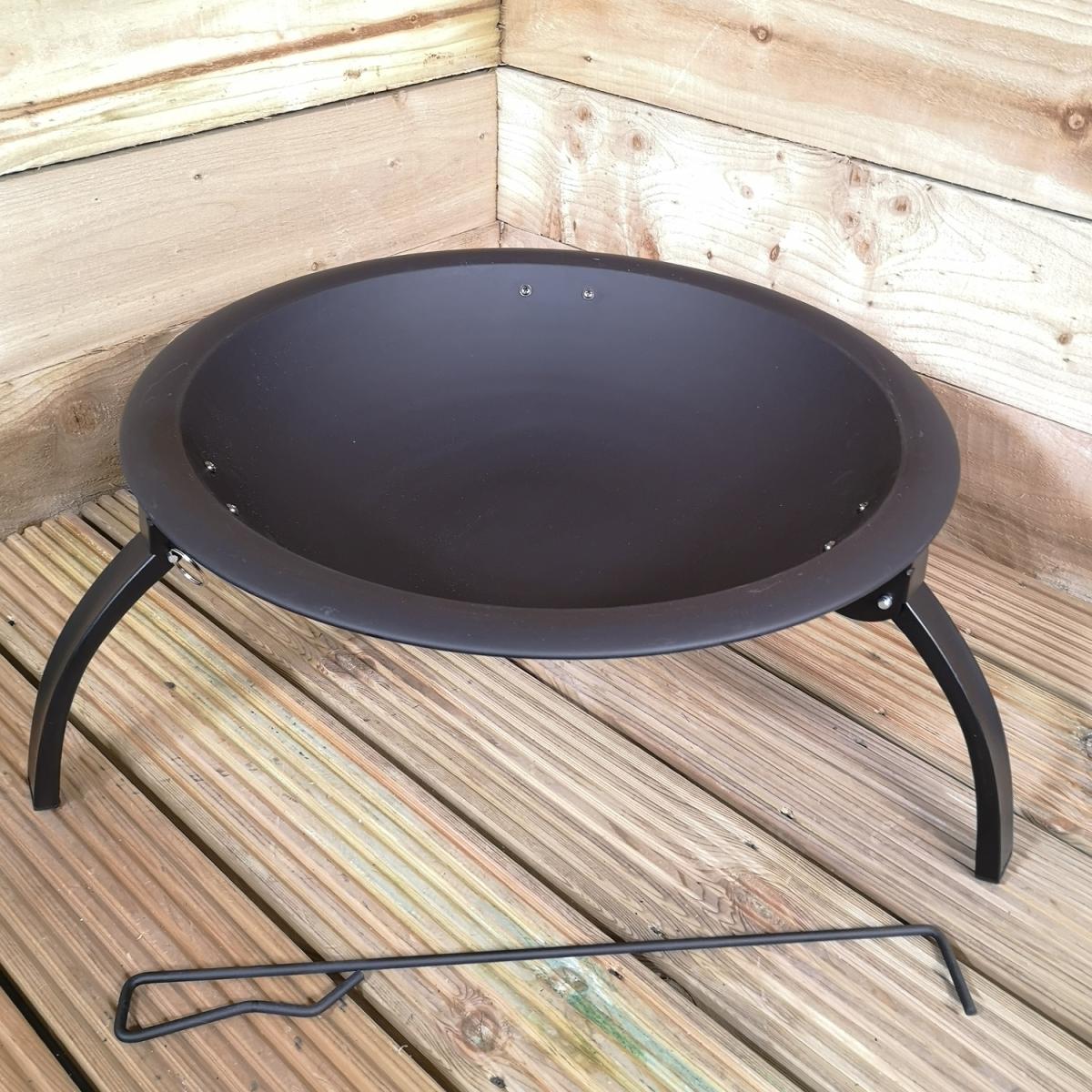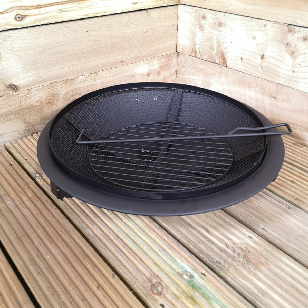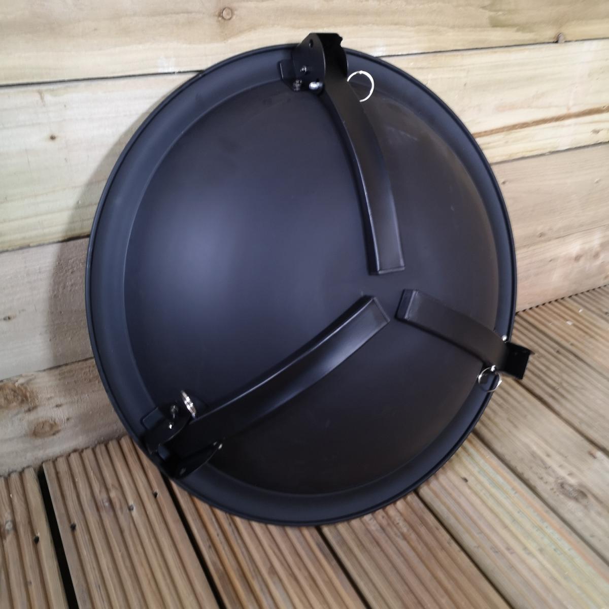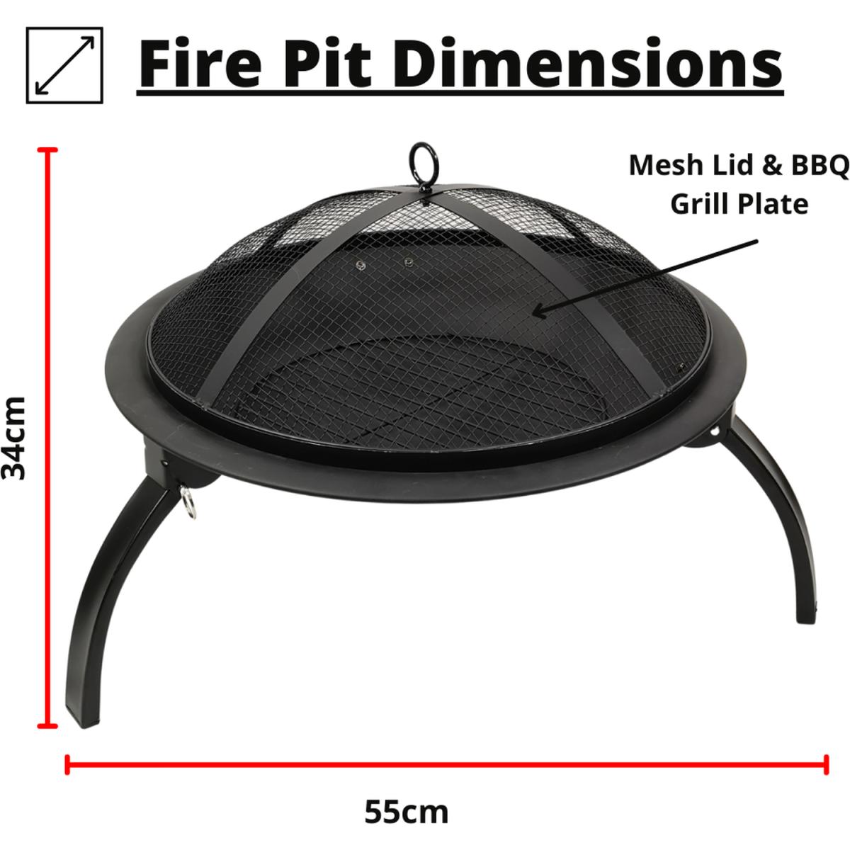 Outdoor garden patio firepit heater. This fire pit is suitable for small logs to provide a source of warmth and light. This black metal Fire Pit also comes with a handy mesh safety guard lid, and a metal hook to remove the lid when it's hot. Steel construction with mesh lid fireguard.