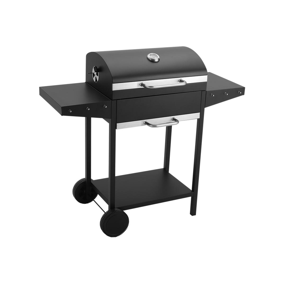Gather loved ones for splendid garden feasts! This barbecue features a large baking tray, two handy side tables, and an under-unit storage rack. Its robust, durable build promises years of reliable service. Made from quality carbon steel, it ensures safe grilling. The bottom ash tray slides out for simple cleaning. Just prep ingredients on the side tables, add charcoal, and your barbecue party is ready to begin! Outdoor Garden Charcoal BBQ Grill Trolley - Black