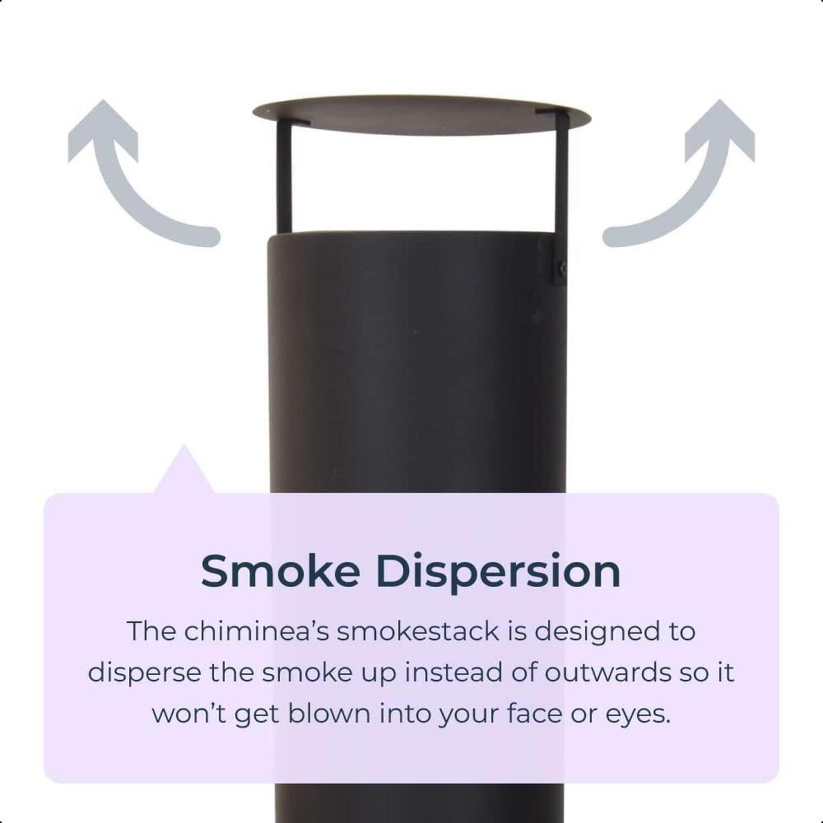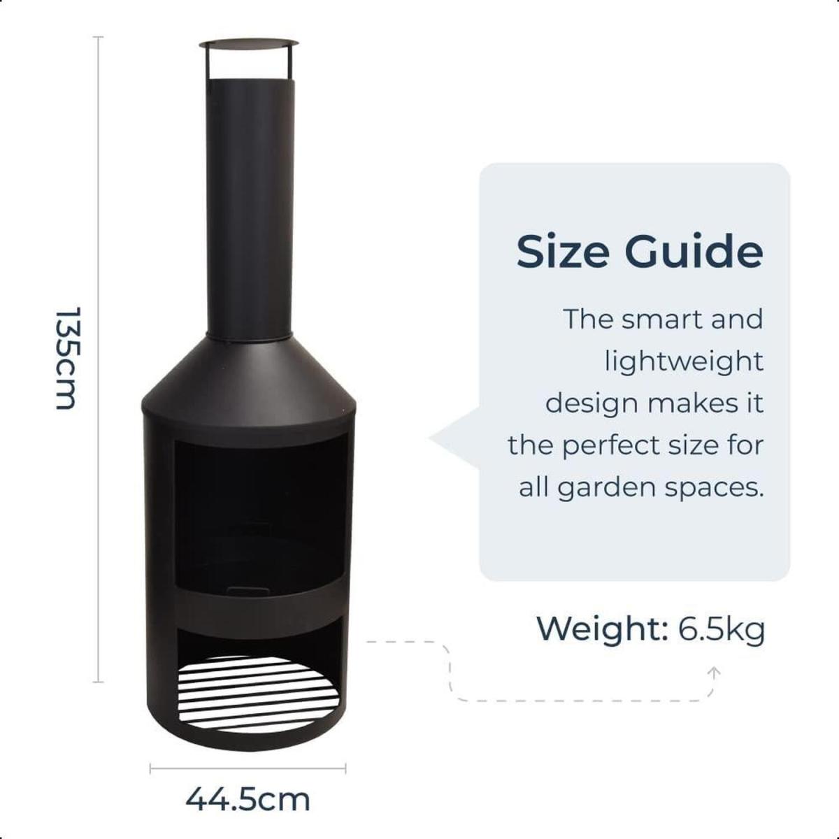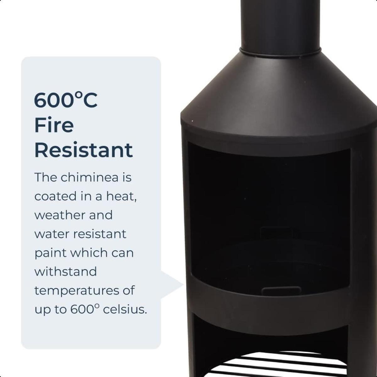 This tall chiminea fireplace is perfect for your outdoor space. It's made of strong 0.8mm metal with a 600 degrees celsius fire resistance rating, allowing you to load it with wood and let it burn for hours. The high-temperature paint is weather-resistant and waterproof, so it can take care of itself. The open front gives you a full view of the flames, and there's a shelf underneath to keep wood dry. The included chimney disperses smoke evenly, making it less dense and less likely to bother you. It's 135cm high and 44.5cm wide, making it great for gatherings with friends and family all year round.