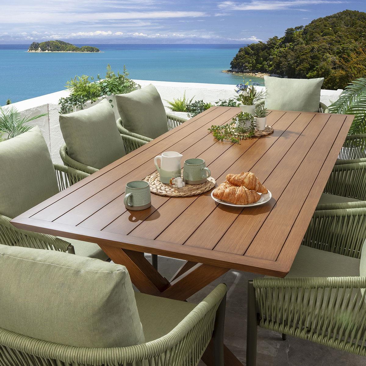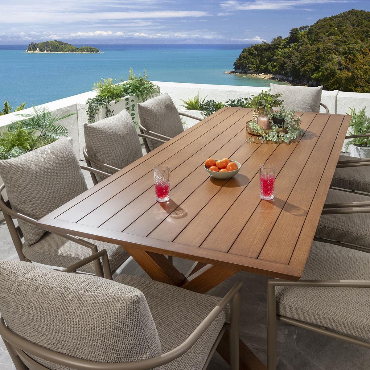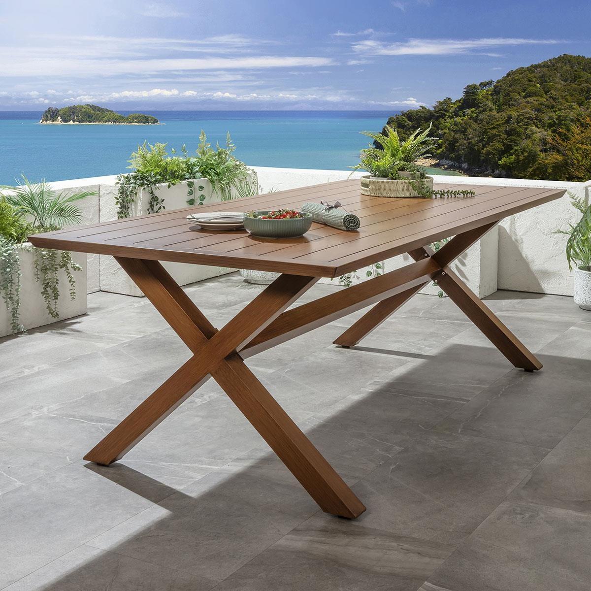 The Star 220cm modern garden dining table boasts a farmhouse-inspired design, featuring a rustic oak wood effect finish, and distinctive Cross X-leg design. Crafted from full aluminium, this weatherproof 8-seater outdoor table is designed to withstand the elements, allowing you to leave it uncovered year-round. The table's design seamlessly blends modern aesthetics with farmhouse charm, making it a versatile choice for various outdoor settings. The contemporary oak wood effect finish adds a touch of sophistication, creating an inviting atmosphere for al fresco dining. The Cross X-leg design not only enhances the table's visual appeal but also provides stability, ensuring a durable and long-lasting addition to your outdoor space. The use of aluminium not only contributes to the outdoor table's modern aesthetic but also ensures its weatherproof durability. This feature makes the table resistant to rust and corrosion, allowing you to enjoy worry-free outdoor dining for years to come. The lightweight nature of aluminium also makes it easy to move and rearrange your outdoor space as needed. Measuring 220cm in length, this garden dining table is the perfect size for hosting gatherings of up to 8 people. Whether you're enjoying a family dinner or entertaining guests, this 8-seater dining table provides ample space for a comfortable dining experience. W220cm D93cm H76cm Full Aluminium 8 Seater Dining Table