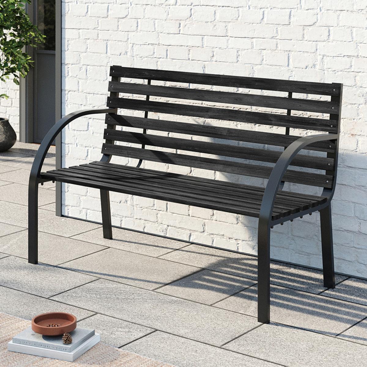 Our Garden Sanctuary Garden Metal Wood Bench is more than just a place to sit, it's a place where you can enjoy every moment outdoors. Its striking black finish gleams in the setting sun, while its large, inviting seat and curved armrests invite you to sink in, ensuring optimal comfort. Its smooth lines and simple elegance make it an eye-catcher. Invite friends over for a weekend brunch, where laughter and conversation flow as easily as the sun shining through the trees. Outdoor Garden Metal and Wood Recliner Bench - Black