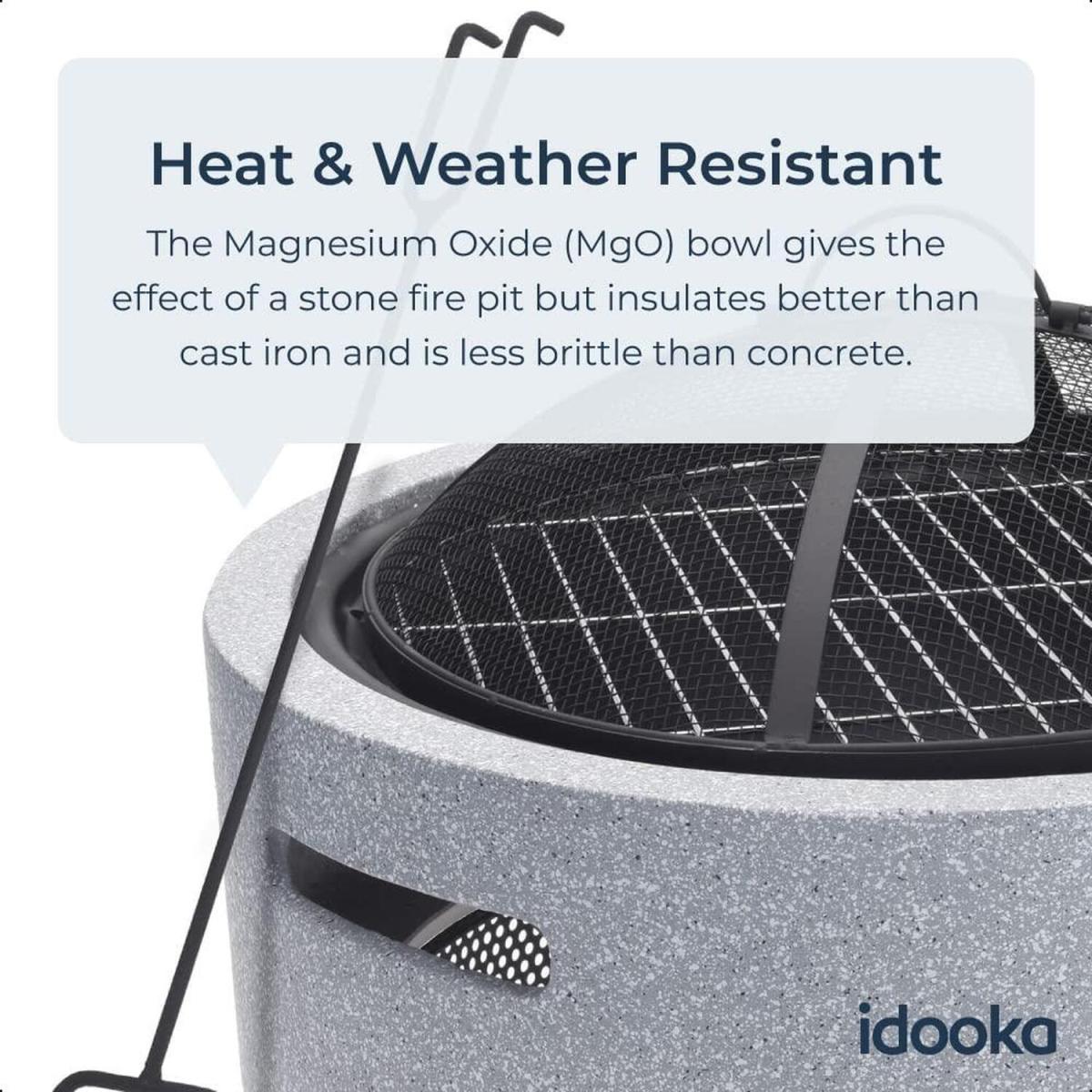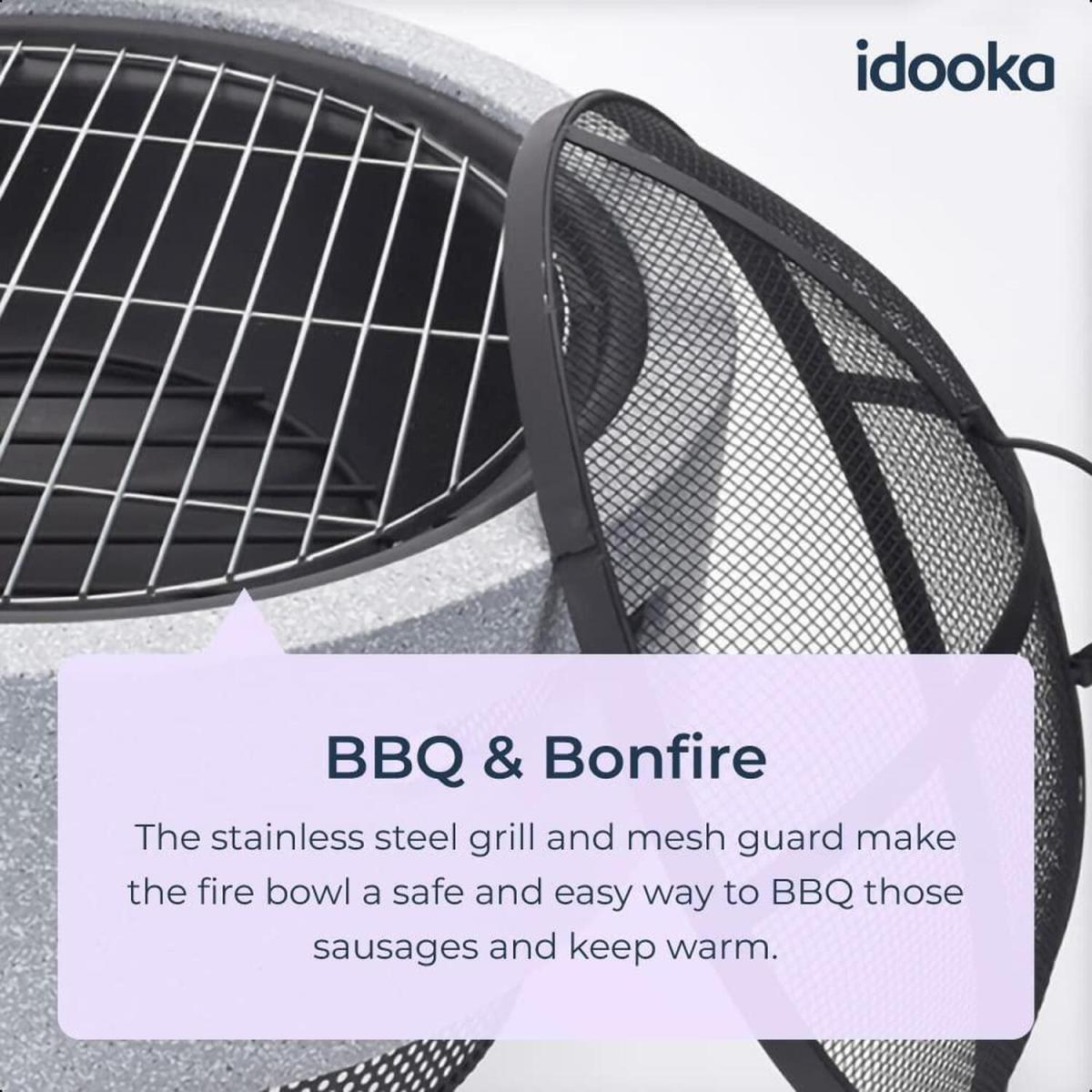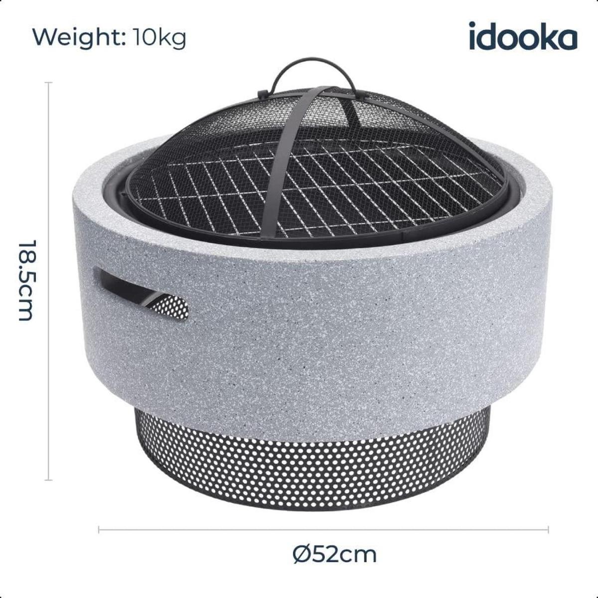 This idooka fire pit is perfect for outdoor gatherings. Made with heat-resistant and safe Mg. O material, it features a mesh cover and fire poker for protection while cooking. It can be filled with firelog or charcoal briquettes and provides long-lasting heating for any season. It's more versatile than a regular fire bowl and can be used as a small BBQ grill. The stone effect body and spark guard keep guests safe. It's portable and great for camping too. The fire pit has a diameter of 52cm and is 18.5cm tall, with a 41cm grill. Get yours today to keep your family warm and together throughout the year.