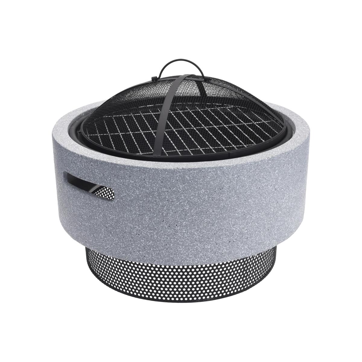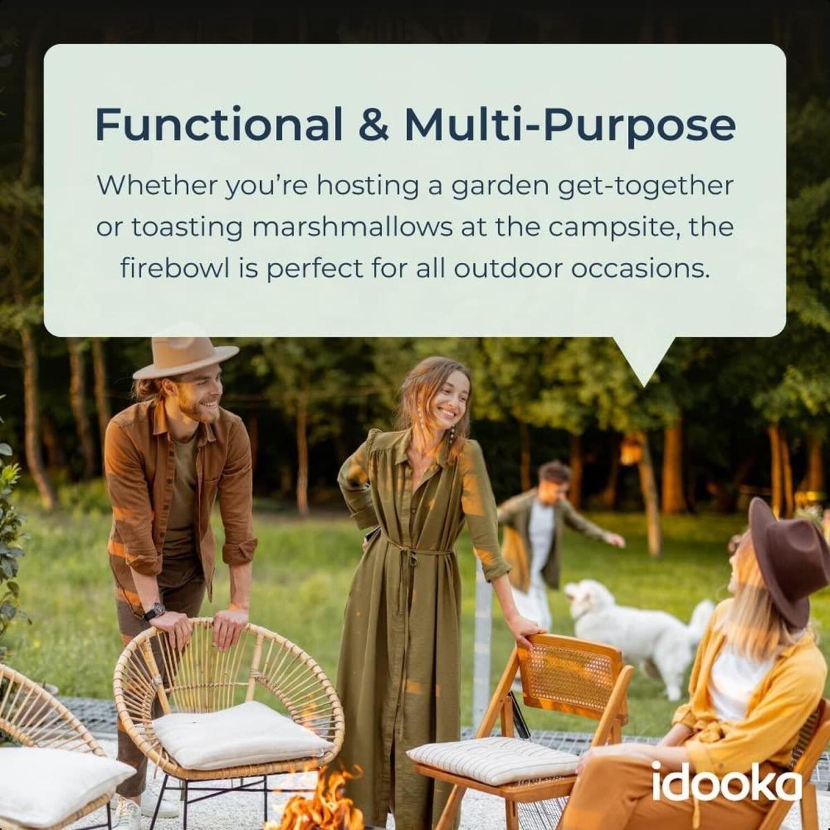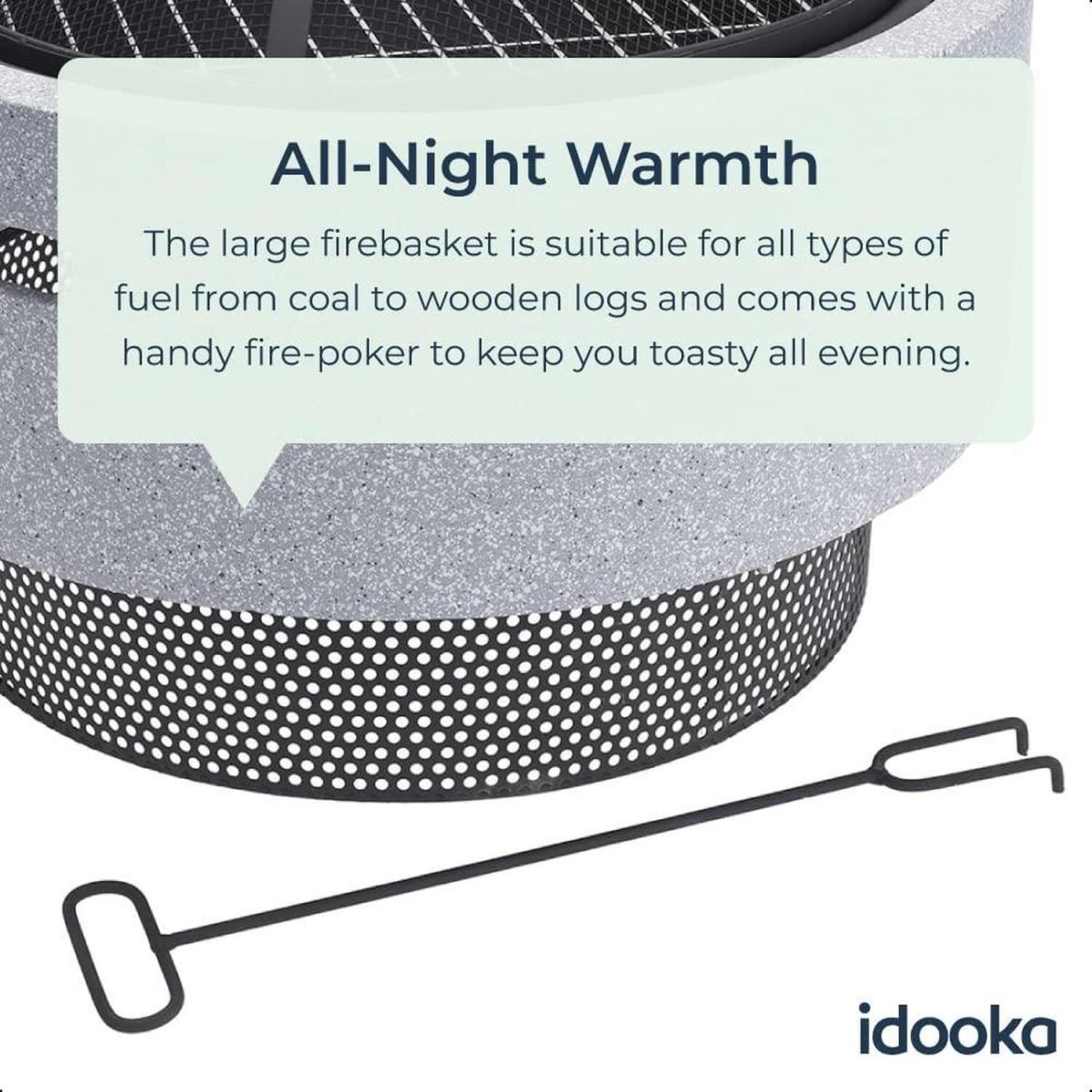This idooka fire pit is perfect for outdoor gatherings. Made with heat-resistant and safe Mg. O material, it features a mesh cover and fire poker for protection while cooking. It can be filled with firelog or charcoal briquettes and provides long-lasting heating for any season. It's more versatile than a regular fire bowl and can be used as a small BBQ grill. The stone effect body and spark guard keep guests safe. It's portable and great for camping too. The fire pit has a diameter of 52cm and is 18.5cm tall, with a 41cm grill. Get yours today to keep your family warm and together throughout the year.