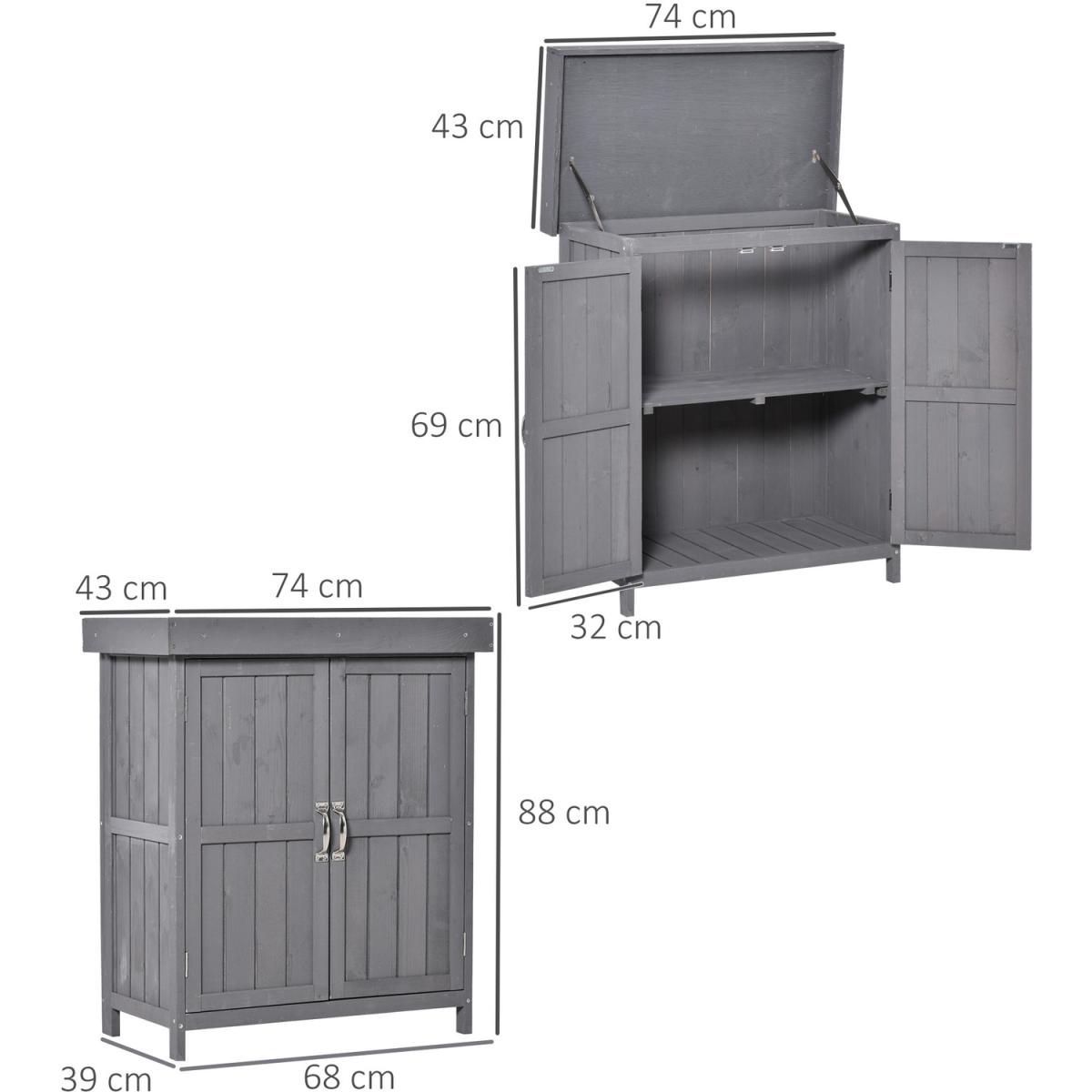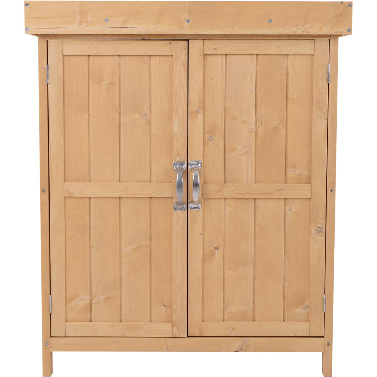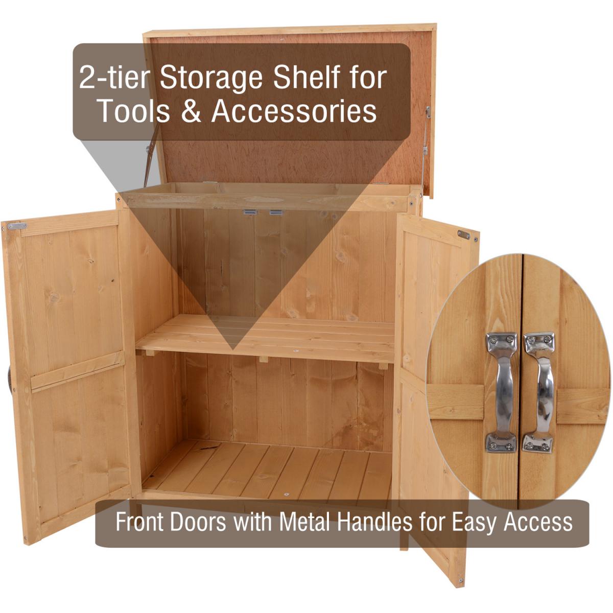 This Outsunny garden storage shed with a 2-tier shelf is an ideal storage solution for storing various tools and garden accessories. The unit has multiple accesses from the double doors in the front and a top lid opening. Water-resistant asphalt roof and painted wooden surface offer durability for outdoor use. Add the compact-size and functional storage shed to your garden and keep all your supplied tools handy for convenient access. Water-resistant asphalt roof and painted wooden surface offer durability for outdoor use.